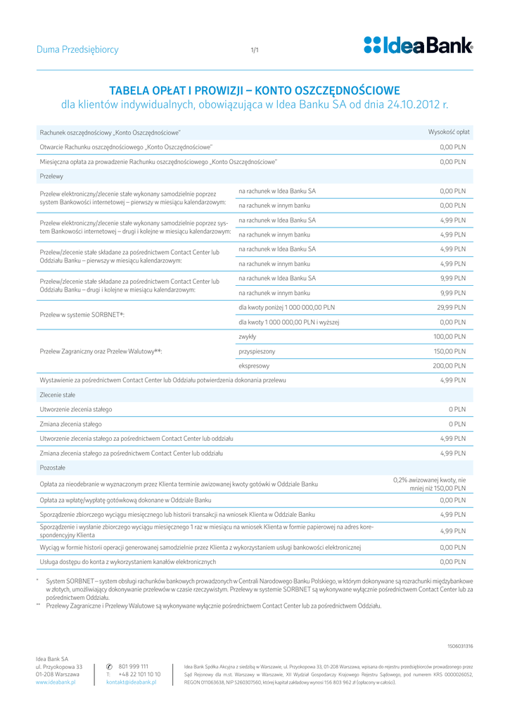 Duma Przedsiębiorcy 1/1 TABELA OPŁAT I PROWIZJI – KONTO OSZCZĘDNOŚCIOWE dla klientów indywidualnych, obowiązująca w Idea Banku SA od dnia 24.10.2012 r. Wysokość opłat Rachunek oszczędnościowy „Konto Oszczędnościowe” Otwarcie Rachunku oszczędnościowego „Konto Oszczędnościowe” 0,00 PLN Miesięczna opłata za prowadzenie Rachunku oszczędnościowego „Konto Oszczędnościowe” 0,00 PLN Przelewy Przelew elektroniczny/zlecenie stałe wykonany samodzielnie poprzez system Bankowości internetowej – pierwszy w miesiącu kalendarzowym: na rachunek w Idea Banku SA 0,00 PLN na rachunek w innym banku 0,00 PLN Przelew elektroniczny/zlecenie stałe wykonany samodzielnie poprzez system Bankowości internetowej – drugi i kolejne w miesiącu kalendarzowym: na rachunek w Idea Banku SA 4,99 PLN na rachunek w innym banku 4,99 PLN Przelew/zlecenie stałe składane za pośrednictwem Contact Center lub Oddziału Banku – pierwszy w miesiącu kalendarzowym: na rachunek w Idea Banku SA 4,99 PLN na rachunek w innym banku 4,99 PLN Przelew/zlecenie stałe składane za pośrednictwem Contact Center lub Oddziału Banku – drugi i kolejne w miesiącu kalendarzowym: na rachunek w Idea Banku SA 9,99 PLN na rachunek w innym banku 9,99 PLN dla kwoty poniżej 1 000 000,00 PLN Przelew w systemie SORBNET*: 29,99 PLN dla kwoty 1 000 000,00 PLN i wyższej Przelew Zagraniczny oraz Przelew Walutowy**: 0,00 PLN zwykły 100,00 PLN przyspieszony 150,00 PLN ekspresowy 200,00 PLN Wystawienie za pośrednictwem Contact Center lub Oddziału potwierdzenia dokonania przelewu 4,99 PLN Zlecenie stałe Utworzenie zlecenia stałego 0 PLN Zmiana zlecenia stałego 0 PLN Utworzenie zlecenia stałego za pośrednictwem Contact Center lub oddziału 4,99 PLN Zmiana zlecenia stałego za pośrednictwem Contact Center lub oddziału 4,99 PLN Pozostałe Opłata za nieodebranie w wyznaczonym przez Klienta terminie awizowanej kwoty gotówki w Oddziale Banku 0,2% awizowanej kwoty, nie mniej niż 150,00 PLN Opłata za wpłatę/wypłatę gotówkową dokonane w Oddziale Banku 0,00 PLN Sporządzenie zbiorczego wyciągu miesięcznego lub historii transakcji na wniosek Klienta w Oddziale Banku 4,99 PLN Sporządzenie i wysłanie zbiorczego wyciągu miesięcznego 1 raz w miesiącu na wniosek Klienta w formie papierowej na adres korespondencyjny Klienta 4,99 PLN Wyciąg w formie historii operacji generowanej samodzielnie przez Klienta z wykorzystaniem usługi bankowości elektronicznej 0,00 PLN Usługa dostępu do konta z wykorzystaniem kanałów elektronicznych 0,00 PLN System SORBNET – system obsługi rachunków bankowych prowadzonych w Centrali Narodowego Banku Polskiego, w którym dokonywane są rozrachunki międzybankowe w złotych, umożliwiający dokonywanie przelewów w czasie rzeczywistym. Przelewy w systemie SORBNET są wykonywane wyłącznie pośrednictwem Contact Center lub za pośrednictwem Oddziału. ** Przelewy Zagraniczne i Przelewy Walutowe są wykonywane wyłącznie pośrednictwem Contact Center lub za pośrednictwem Oddziału. * 1506031316 Idea Bank SA ul. Przyokopowa 33 01-208 Warszawa www.ideabank.pl 801 999 111 +48 22 101 10 10 [email protected] T: Idea Bank Spółka Akcyjna z siedzibą w Warszawie, ul. Przyokopowa 33, 01-208 Warszawa, wpisana do rejestru przedsiębiorców prowadzonego przez Sąd Rejonowy dla m.st. Warszawy w Warszawie, XII Wydział Gospodarczy Krajowego Rejestru Sądowego, pod numerem KRS 0000026052, REGON 011063638, NIP 5260307560, której kapitał zakładowy wynosi 156 803 962 zł (opłacony w całości).