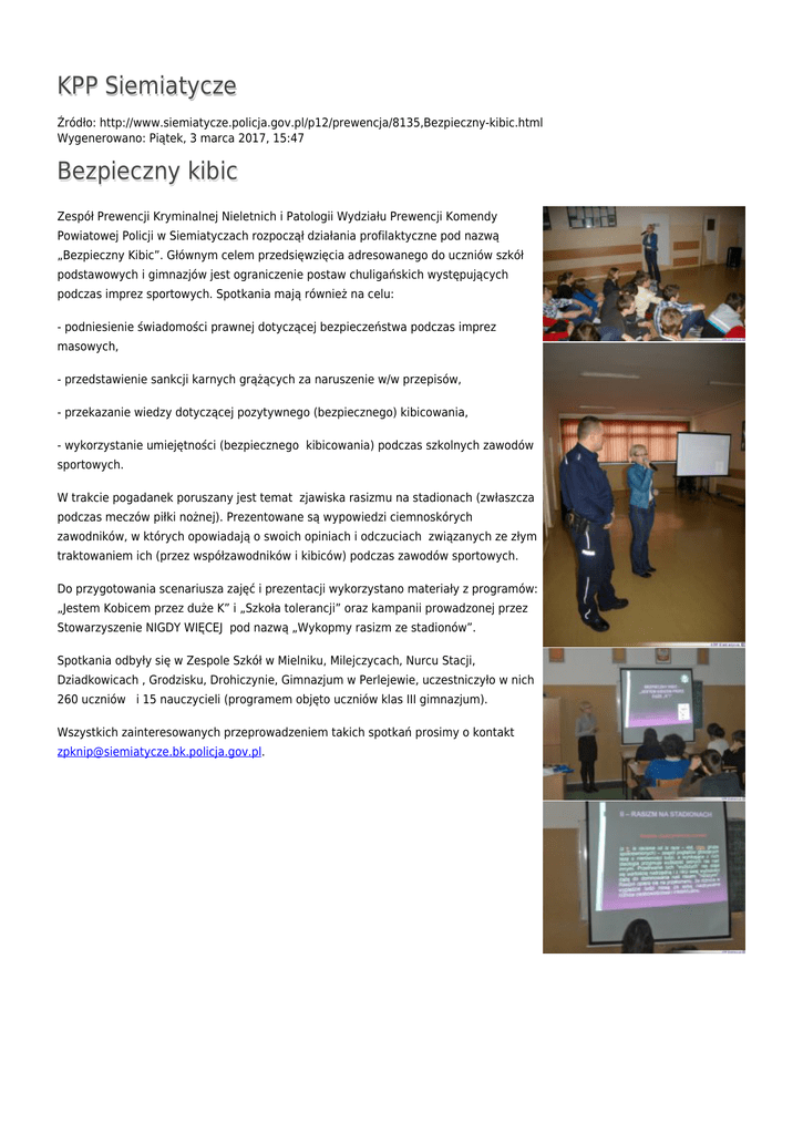 KPP Siemiatycze Źródło: http://www.siemiatycze.policja.gov.pl/p12/prewencja/8135,Bezpieczny-kibic.html Wygenerowano: Piątek, 3 marca 2017, 15:47 Bezpieczny kibic Zespół Prewencji Kryminalnej Nieletnich i Patologii Wydziału Prewencji Komendy Powiatowej Policji w Siemiatyczach rozpoczął działania profilaktyczne pod nazwą „Bezpieczny Kibic”. Głównym celem przedsięwzięcia adresowanego do uczniów szkół podstawowych i gimnazjów jest ograniczenie postaw chuligańskich występujących podczas imprez sportowych. Spotkania mają również na celu: - podniesienie świadomości prawnej dotyczącej bezpieczeństwa podczas imprez masowych, - przedstawienie sankcji karnych grążących za naruszenie w/w przepisów, - przekazanie wiedzy dotyczącej pozytywnego (bezpiecznego) kibicowania, - wykorzystanie umiejętności (bezpiecznego kibicowania) podczas szkolnych zawodów sportowych. W trakcie pogadanek poruszany jest temat zjawiska rasizmu na stadionach (zwłaszcza podczas meczów piłki nożnej). Prezentowane są wypowiedzi ciemnoskórych zawodników, w których opowiadają o swoich opiniach i odczuciach związanych ze złym traktowaniem ich (przez współzawodników i kibiców) podczas zawodów sportowych. Do przygotowania scenariusza zajęć i prezentacji wykorzystano materiały z programów: „Jestem Kobicem przez duże K” i „Szkoła tolerancji” oraz kampanii prowadzonej przez Stowarzyszenie NIGDY WIĘCEJ pod nazwą „Wykopmy rasizm ze stadionów”. Spotkania odbyły się w Zespole Szkół w Mielniku, Milejczycach, Nurcu Stacji, Dziadkowicach , Grodzisku, Drohiczynie, Gimnazjum w Perlejewie, uczestniczyło w nich 260 uczniów i 15 nauczycieli (programem objęto uczniów klas III gimnazjum). Wszystkich zainteresowanych przeprowadzeniem takich spotkań prosimy o kontakt [email protected]. Ocena: 0/5 (0) Tweetnij