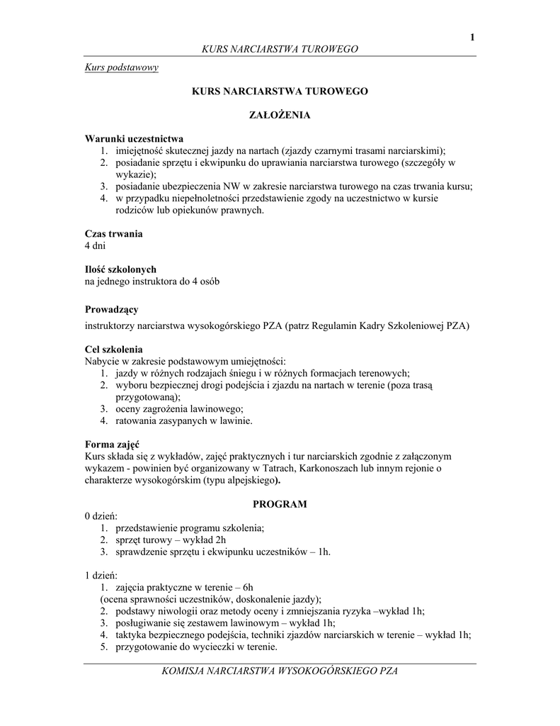 1 KURS NARCIARSTWA TUROWEGO Kurs podstawowy KURS NARCIARSTWA TUROWEGO ZAŁOŻENIA Warunki uczestnictwa 1. imiejętność skutecznej jazdy na nartach (zjazdy czarnymi trasami narciarskimi); 2. posiadanie sprzętu i ekwipunku do uprawiania narciarstwa turowego (szczegóły w wykazie); 3. posiadanie ubezpieczenia NW w zakresie narciarstwa turowego na czas trwania kursu; 4. w przypadku niepełnoletności przedstawienie zgody na uczestnictwo w kursie rodziców lub opiekunów prawnych. Czas trwania 4 dni Ilość szkolonych na jednego instruktora do 4 osób Prowadzący instruktorzy narciarstwa wysokogórskiego PZA (patrz Regulamin Kadry Szkoleniowej PZA) Cel szkolenia Nabycie w zakresie podstawowym umiejętności: 1. jazdy w różnych rodzajach śniegu i w różnych formacjach terenowych; 2. wyboru bezpiecznej drogi podejścia i zjazdu na nartach w terenie (poza trasą przygotowaną); 3. oceny zagrożenia lawinowego; 4. ratowania zasypanych w lawinie. Forma zajęć Kurs składa się z wykładów, zajęć praktycznych i tur narciarskich zgodnie z załączonym wykazem - powinien być organizowany w Tatrach, Karkonoszach lub innym rejonie o charakterze wysokogórskim (typu alpejskiego). PROGRAM 0 dzień: 1. przedstawienie programu szkolenia; 2. sprzęt turowy – wykład 2h 3. sprawdzenie sprzętu i ekwipunku uczestników – 1h. 1 dzień: 1. zajęcia praktyczne w terenie – 6h (ocena sprawności uczestników, doskonalenie jazdy); 2. podstawy niwologii oraz metody oceny i zmniejszania ryzyka –wykład 1h; 3. posługiwanie się zestawem lawinowym – wykład 1h; 4. taktyka bezpiecznego podejścia, techniki zjazdów narciarskich w terenie – wykład 1h; 5. przygotowanie do wycieczki w terenie. KOMISJA NARCIARSTWA WYSOKOGÓRSKIEGO PZA 2 KURS NARCIARSTWA TUROWEGO 2 dzień: 1. zajęcia praktyczne w terenie – 6h (podejścia i zjazdy narciarskie poza trasami przygotowanymi, nauka podejścia i jazdy w różnych gatunkach śniegu, w różnych formacjach terenowych, praktyczne zapoznanie się z zakładaniem śladu narciarskiego w terenie, ćwiczenia w zmianie kierunku podejścia w zakosie, używanie raków i czekana); 2. pierwsza pomoc - wykład 1h; 3. planowanie tury narciarskiej na następny dzień – wykład 1h. 3 dzień: 1. tura narciarska – 6h (wzorcowa tura narciarska w której uczestnicy poznają zasady poruszania się na nartach z fokami, odpowiednie tempo podejścia, odpoczynki, trasę zjazdu, kolejność zjazdu, przystanki); 2. pozorowana akcja lawinowa – 2h; 3. planowanie tury narciarskiej na następny dzień – wykład 1h. 4 dzień: 1. tura narciarska – 6h (doskonalenie w zakładaniu śladu narciarskiego, wybór drogi podejścia i zjazdu przez uczestników kursu); 2. zakończenie kursu – 1h (omówienie i ocena umiejętności poszczególnych uczestników, rozdanie świadectw uczestnictwa). Załącznik do programu kursu narciarstwa turowego WYKAZ OBOWIĄZKOWEGO SPRZĘTU I EKWIPUNKU 1. para nart turowych; 2. para noży; 3. para fok; 4. para kijów turowych lub biegowych; 5. para butów turowych; 6. plecak; 7. standardowa odzież górska, w tym komplet nieprzewiewny; 8. para raków; 9. czekan; 10. zestaw lawinowy(detektor lawinowy, sonda,łopata); 11. czołówka; 12. apteczka. KOMISJA NARCIARSTWA WYSOKOGÓRSKIEGO PZA