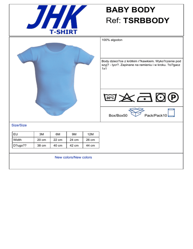 BABY BODY Ref: TSRBBODY 100% algodon Body dzieci?ce z krótkim r?kawkiem. Wyko?czenie pod szyj? - lycr?. Zapinane na ramieniu i w kroku. ?ci?gacz 1x1 Box/Box50 Size/Size EU 3M 6M 9M 12M Width 20 cm 22 cm 24 cm 26 cm D?ugo?? 38 cm 40 cm 42 cm 44 cm New colors/New colors Powered by TCPDF (www.tcpdf.org) Pack/Pack10
