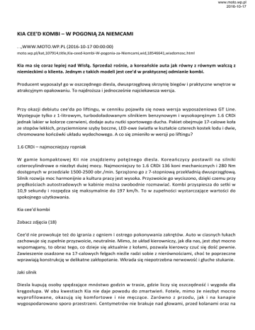 www.moto.wp.pl 2016-10-17 KIA CEE'D KOMBI – W POGONIĄ ZA NIEMCAMI . .,WWW.MOTO.WP.PL (2016-10-17 00:00:00) moto.wp.pl/kat,107914,title,Kia-ceed-kombi-W-pogonia-za-Niemcami,wid,18546641,wiadomosc.html Kia ma się coraz lepiej nad Wisłą. Sprzedaż rośnie, a koreańskie auta jak równy z równym walczą z niemieckimi o klienta. Jednym z takich modeli jest cee'd w praktycznej odmianie kombi. Producent wyposażył go w oszczędnego diesla, dwusprzęgłową skrzynię biegów i praktyczne wnętrze w atrakcyjnym opakowaniu. To najdroższa i jednocześnie najciekawsza wersja. Przy okazji debiutu cee'da po liftingu, w cenniku pojawiła się nowa wersja wyposażeniowa GT Line. Występuje tylko z 1-litrowym, turbodoładowanym silnikiem benzynowym i wysokoprężnym 1.6 CRDi jednak lakier w kolorze czerwieni, dodaje autu nutki sportowego ducha. Pakiet obejmuje 17-calowe koła ze stopów lekkich, przyciemnione szyby boczne, LED-owe światła w kształcie czterech kostek lodu i dwie, chromowane końcówki układu wydechowego. A co się zmieniło w wersji po liftingu? 1.6 CRDi – najmocniejszy ropniak W gamie kompaktowej Kii nie znajdziemy potężnego diesla. Koreańczycy postawili na silniki czterocylindrowe o niezbyt dużej mocy. Najmocniejszy to 1.6 CRDi 136 koni mechanicznych i 280 Nm dostępnych w przedziale 1500-2500 obr./min. Sprzężono go z 7-stopniową przekładnią dwusprzęgłową. Silnik rozwija moc harmonijnie a kultura pracy jest wysoka. Przyzwoicie go wyciszono, dzięki czemu przy prędkościach autostradowych w kabinie można swobodnie rozmawiać. Kombi przyspiesza do setki w 10,9 sekundy i rozpędza się maksymalnie do 197 km/h. To w zupełności wystarczające wartości do spokojnego użytkowania. Kia cee'd kombi Zobacz zdjęcia (18) Cee'd nie prowokuje też do igrania z ogniem i ostrego pokonywania zakrętów. Auto w ciasnych łukach zachowuje się zupełnie przyzwoicie, neutralnie. Mimo, że układ kierowniczy, jak dla nas, jest zbyt mocno wspomagany, to obraz tego, co dzieje się aktualnie z kołami, pozwala kierowcy czuć się dość pewnie. Zawieszenie osadzone na 17-calowych felgach nieźle radzi sobie z nierównościami, choć te poprzeczne wprawiają konstrukcję w delikatne zakłopotanie. Wkrada się niepotrzebna nerwowość i głuche stukanie. Jaki silnik Diesla kupują osoby spędzające mnóstwo godzin w trasie, gdzie liczy się oszczędność i wygoda dla kręgosłupa. W obu kwestiach Kia nie daje powodu do zmartwień. Fotele, mimo że niezbyt mocno wyprofilowane, okazują się komfortowe i nie męczące. Zarówno z przodu, jak i na kanapie wygospodarowano sporo przestrzeni. Centymetrów nie brakuje nad głowami, przed kolanami oraz na www.moto.wp.pl 2016-10-17 wysokości barków. Za to silnik przekonuje elastycznością i jedynie umiarkowanie niskim zapotrzebowaniem na paliwo. W cyklu średnim obejmującym autostrady, zakorkowane miasto i niedługie wycieczki drogami krajowymi, komputer pokładowy wskazywał od 6,7 do 7 litrów. W tej kategorii lepiej wypada połączony z hydrokinetycznym automatem Opel Astra (1.6 CDTi) i VW Golf 1.6 TDI z DSG. Niemieckie kompakty potrafią zejść w trasie poniżej 4 litrów, a Kia zbliży się do 5. Niemniej, trzeba pochwalić mechanizm oznaczony symbolem DCT. Koreańscy inżynierowie próbują dorównać wspomnianemu wcześniej DSG i są coraz bliżej. Podczas spokojnej eksploatacji skrzynia nie generuje uwag, za to ma problemy przy mocnym dociskaniu gazu. Niepotrzebnie zwleka z konieczną redukcją biegu i za długo przytrzymuje silnik na wysokich obrotach. Funkcjonalnie i bez udziwnień Dużo świecących dekorów i ekranów o różnej wielkości zdominowało wnętrze Kii. Koreańczycy zapragnęli stworzyć samochód na wskroś nowoczesny, praktyczny i jednocześnie z odrobiną luksusowy. Poczucie jakości mają wzbudzać listwy z fortepianowym połyskiem. Znajdziemy je na kierownicy, drzwiach, a także w dolnej części kokpitu centralnego. Mało jest za to elementów pokrywających się ze sportowym wydźwiękiem pakietu GT Line. Aluminiowe nakładki na pedały i podstopnicę to trochę za mało, jednak trzeba przyznać, że deska rozdzielcza cee'da wygląda ciekawie. Analogowe zegary umieszczono w głębokich tubach i wkomponowano w nie wyświetlacz komputera pokładowego, przekazujący dane z podróży, wskazania nawigacji i listę dostępnych stacji radiowych. Do tego dochodzi menu z ustawieniami. Jest prosty i łatwy w obsłudze, podobnie jak 7-calowy, dotykowy ekran połączony z kamerą cofania i zestawem audio. Pod nim znajdziemy panel dwustrefowej klimatyzacji automatycznej, gdzie jeden przycisk przypisano jednej funkcji. Prościej się nie da. Nieco gorzej przedstawia się jakość materiałów wykończeniowych. Mimo, że Kia zrobiła ogromny postęp, to i tak do poziomu Focusa i Golfa jeszcze trochę brakuje. Niemniej, część tworzyw nie pozostawia wiele do życzenia. Obraz psują plastiki wokół dźwigni zmiany biegów i radioodtwarzacza. Naszym zdaniem Cee'd to bardzo ciekawa alternatywa dla Octavii, Astry i Fousa. Ma 528-litrowy bagażnik (1642 po złożeniu oparć), przestronne wnętrze, niezłe właściwości jezdne i rozsądnie wycenione pakiety z wyposażeniem dodatkowym. Z dieslem i automatem gwarantuje wysoki komfort codziennego użytkowania, a w wersji GT Line wygląda atrakcyjnie. W najbogatszej specyfikacji wyposażeniowej kosztuje aż 95 540 zł. Sporo, jednak wiele z elektronicznych dodatków dostaniemy w standardzie, a doposażenie do maksimum wywinduje cenę do 110-115 tysięcy. Konkurencja Początkowo Kia może wydawać się droga. To niekorzystne wrażenie szybko mija, jeśli spojrzymy w cenniki konkurencji. 110-konny VW Golf Variant DSG w wersji Highline to wydatek przynajmniej 103 www.moto.wp.pl 2016-10-17 tysięcy złotych. Octavia Combi z tym samym zespołem napędowym w odmianie Style kosztuje 100 840 zł. Ford Focus z rodzinnym nadwoziem z 1.5 TDCi (120 KM) i automatem został wyceniony n