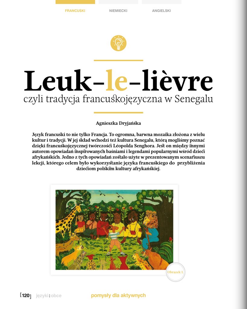 francuski niemiecki angielski Leuk-le-lièvre czyli tradycja francuskojęzyczna w Senegalu Agnieszka Dryjańska Język francuski to nie tylko Francja. To ogromna, barwna mozaika złożona z wielu kultur i tradycji. W jej skład wchodzi też kultura Senegalu, którą mogliśmy poznać dzięki francuskojęzycznej twórczości Léopolda Senghora. Jest on między innymi autorem opowiadań inspirowanych baśniami i legendami popularnymi wśród dzieci afrykańskich. Jedno z tych opowiadań zostało użyte w prezentowanym scenariuszu lekcji, którego celem było wykorzystanie języka francuskiego do przybliżenia dzieciom polskim kultury afrykańskiej. Obrazek 1. [ 120 ] pomysły dla aktywnych angielski niemiecki Czas trwania: 90 min. Poziom: A1-A2, 11-13 lat Cele: interkulturowe: yy uwrażliwienie w zakresie problematyki różnorodności kulturowej; yy zapoznanie się z tematyką tradycji francuskojęzycznej w Afryce przez pryzmat Senegalu; yy zapoznanie się z postacią L. Senghora i jego krajem (sytuacja językowa, położenie, stolica); yy poznanie specyfiki opowiadań afrykańskich i porównanie ich z baśniami i opowiadaniami popularnymi w Polsce. leksykalno-gramatyczne: yy wzbogacenia słownictwa dotyczącego zwierząt; yy wprowadzenie przymiotników opisujących cechy osób i zwierząt; yy wprowadzenie stopnia najwyższego przymiotników. francuski Nauczyciel prosi, by dzieci podawały cechy zająca po francusku (mały, szybki, miły, sprytny itp.). Gdzie może rozgrywać się historia i dlaczego? Nauczyciel zwraca uwagę na to, jakie zwierzęta są przedstawione na obrazku i na widoczny krajobraz, szczególnie drzewa. Następnie zwraca uwagę na kolorystykę ilustracji: bardzo żywe kolory i rodzaj oraz kolorystykę ubrań. Wszystkie te elementy kojarzą się z Afryką, gdzie rozgrywa się historia. Nauczyciel informuje uczniów, że zając jest popularnym bohaterem opowiadań w różnych tradycjach francuskojęzycznych (Haiti, Luizjana czy opowiadania kreolskie). Prezentacja historii Nauczyciel przedstawia historię: podaje autora – L. Senghora i tytuł: La belle histoire de Leuk-le-lièvre. Zapoznanie się z życiem autora Wprowadzenie: Punktem wyjścia do rozważań o specyfice tradycji francuskojęzycznych w krajach afrykańskich przez pryzmat sytuacji w Senegalu będzie krótka rozmowa na temat tego, jakie zwierzęta najczęściej występują w bajkach znanych polskim dzieciom. Ten fragment może odbyć się po polsku, ale nauczyciel podaje francuskie odpowiedniki nazw zwierząt wymienianych przez dzieci (wilk, koza, kurczątka, kaczątko, miś…). Można też podać francuskie odpowiedniki cytowanych przez dzieci baśni, w których występują wymienione zwierzęta. Następnie nauczyciel pokazuje obrazek (Obrazek 1.) i informuje, że jest on ilustracją do pewnego opowiadania dla dzieci. Nauczyciel pyta, jakie zwierzęta są widoczne na obrazku i zapisuje na tablicy ich nazwy. Następnie uczniowie wraz z nauczycielem zastanawiają się, jakie zwierzę może być bohaterem tego opowiadania i dlaczego. Dzieci mogą podawać różne odpowiedzi. Prawdopodobnie padnie odpowiedź, że zwierzę w środku – zając – jest bohaterem. Jeśli tak się nie stanie, nauczyciel pomaga uczniom dojść do tej odpowiedzi. Dlaczego zając może być bohaterem i czy ma on jakieś szczególne cechy? Léopold Sédar Senghor est né en 1906 au Sénégal (Afrique de l’Ouest), quand ce pays est encore une colonie française. Il passe son enfance dans un village de brousse. Ensuite, il est envoyé à «l’école des Blancs» où il est un excellent élève. Puis, il arrive à Paris pour faire ses études supérieures. Pendant ses études, il parle beaucoup de l’originalité et de la richesse des cultures noires : les arts et la façon de vivre des Négro-Africains. Selon lui, c’est en respectant la diversité de toutes les cultures qu’un monde de paix verra le jour. Après ses études il est nommé professeur en France. Il est aussi poète et écrivain. Il écrit La belle histoire de Leuk-le-lièvre pour les enfants sénégalais. C’est une histoire qui présente la tradition sénégalaise mais elle est écrite en français (et pas en wolof qui est une langue traditionnelle des habitants du Sénégal). Le héros de l’histoire est un lièvre qui s’appelle Leuk, ce qui signifie en wolof lièvre. Les illustrations pour ce livre sont peintes avec la technique «sous verre», très populaire au Sénégal. En 1960, L.Senghor devient le premier président du Sénégal libre et il habite à Dakar, capitale du Sénégal. Il est mort en 2001 en France. (Tekst opracowany na podstawie Cartes à parler M. Boiron, J.-R. Bourrel) pomysły dla aktywnych [ 121 ] francuski niemiecki angielski Ćwiczenia zawiązane z tekstem 1. Pytania do tekstu yy Où est-ce que L. Senghor est né? yy Expliquez les termes: «l’école des Blancs», «cultures noires», «Négro-Africains». yy Quelle est la langue traditionnelle au Sénégal? yy Comment dit-on lièvre en wolof. yy Expliquez le sens de la phrase: c’est en respectant la diversité de toutes les cultures qu’un monde de paix verra le jour. yy Est-ce que vous êtes d’accord avec cette opinion? 2. Vrai / Faux yy L. Senghor étudie en Afrique. yy Les gens en Afrique vivent de la même façon qu’en Europe. yy La culture des gens noirs est riche. yy Quand L.Senghor est le président du Sénégal il habite en France. Uczniowie szukają w słowniku terminu brousse. Nauczyciel pokazuje na mapie Afryki uczniom Senegal i Dakar. Dzieci indywidualnie odnajdują na mapkach konturowych Afryki (dostarczonych przez nauczyciela) Senegal, kolorują go i zaznaczają stolicę. Nauczyciel wyjaśnia, że technika malowania pod szkłem sous verre polega na malowaniu na odwrót, czyli w sposób lustrzany i że najpierw umieszcza się szczegóły, a na końcu tło, gdyż efekt jest oglądany po odwróceniu malowidła. Leuk-le-lièvre et d’autres animaux C’est au temps