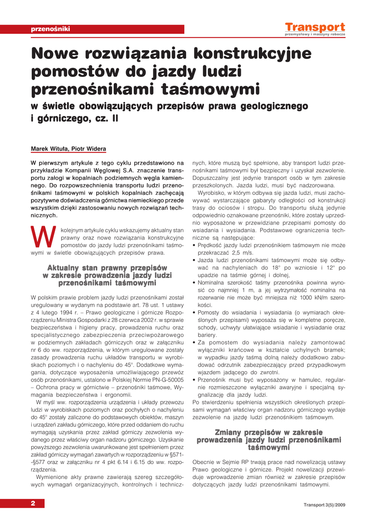 przenośniki Nowe rozwiązania konstrukcyjne pomostów do jazdy ludzi przenośnikami taśmowymi w świetle obowiązujących przepisów prawa geologicznego i górniczego, cz. II Marek Wituła, Piotr Widera W pierwszym artykule z tego cyklu przedstawiono na przykładzie Kompanii Węglowej S.A. znaczenie trans− portu załogi w kopalniach podziemnych węgla kamien− nego. Do rozpowszechnienia transportu ludzi przeno− śnikami taśmowymi w polskich kopalniach zachęcają pozytywne doświadczenia górnictwa niemieckiego przede wszystkim dzięki zastosowaniu nowych rozwiązań tech− nicznych. W kolejnym artykule cyklu wskazujemy aktualny stan prawny oraz nowe rozwiązania konstrukcyjne pomostów do jazdy ludzi przenośnikami taśmo− wymi w świetle obowiązujących przepisów prawa. Aktualny stan prawny przepisów w zakresie prowadzenia jazdy ludzi przenośnikami taśmowymi W polskim prawie problem jazdy ludzi przenośnikami został uregulowany w wydanym na podstawie art. 78 ust. 1 ustawy z 4 lutego 1994 r. – Prawo geologiczne i górnicze Rozpo− rządzeniu Ministra Gospodarki z 28 czerwca 2002 r. w sprawie bezpieczeństwa i higieny pracy, prowadzenia ruchu oraz specjalistycznego zabezpieczenia przeciwpożarowego w podziemnych zakładach górniczych oraz w załączniku nr 6 do ww. rozporządzenia, w którym uregulowane zostały zasady prowadzenia ruchu układów transportu w wyrobi− skach poziomych i o nachyleniu do 45°. Dodatkowe wyma− gania, dotyczące wyposażenia umożliwiającego przewóz osób przenośnikami, ustalono w Polskiej Normie PN−G−50005 – Ochrona pracy w górnictwie – przenośniki taśmowe, Wy− magania bezpieczeństwa i ergonomii. W myśl ww. rozporządzenia urządzenia i układy przewozu ludzi w wyrobiskach poziomych oraz pochyłych o nachyleniu do 45° zostały zaliczone do podstawowych obiektów, maszyn i urządzeń zakładu górniczego, które przed oddaniem do ruchu wymagają uzyskania przez zakład górniczy zezwolenia wy− danego przez właściwy organ nadzoru górniczego. Uzyskanie powyższego zezwolenia uwarunkowane jest spełnieniem przez zakład górniczy wymagań zawartych w rozporządzeniu w §571− −§577 oraz w załączniku nr 4 pkt 6.14 i 6.15 do ww. rozpo− rządzenia. Wymienione akty prawne zawierają szereg szczegóło− wych wymagań organizacyjnych, kontrolnych i technicz− 2 nych, które muszą być spełnione, aby transport ludzi prze− nośnikami taśmowymi był bezpieczny i uzyskał zezwolenie. Dopuszczalny jest jedynie transport osób w tym zakresie przeszkolonych. Jazda ludzi, musi być nadzorowana. Wyrobisko, w którym odbywa się jazda ludzi, musi zacho− wywać wystarczające gabaryty odległości od konstrukcji trasy do ociosów i stropu. Do transportu służą jedynie odpowiednio oznakowane przenośniki, które zostały uprzed− nio wyposażone w przewidziane przepisami pomosty do wsiadania i wysiadania. Podstawowe ograniczenia tech− niczne są następujące: · Prędkość jazdy ludzi przenośnikiem taśmowym nie może przekraczać 2,5 m/s. · Jazda ludzi przenośnikami taśmowymi może się odby− wać na nachyleniach do 18° po wzniosie i 12° po upadzie na taśmie górnej i dolnej, · Nominalna szerokość taśmy przenośnika powinna wyno− sić co najmniej 1 m, a jej wytrzymałość nominalna na rozerwanie nie może być mniejsza niż 1000 kN/m szero− kości. · Pomosty do wsiadania i wysiadania (o wymiarach okre− ślonych przepisami) wyposaża się w kompletne poręcze, schody, uchwyty ułatwiające wsiadanie i wysiadanie oraz bariery. · Za pomostem do wysiadania należy zamontować wyłączniki krańcowe w kształcie uchylnych bramek; w wypadku jazdy taśmą dolną należy dodatkowo zabu− dować odrzutnik zabezpieczający przed przypadkowym wjazdem jadącego do zwrotni. · Przenośnik musi być wyposażony w hamulec, regular− nie rozmieszczone wyłączniki awaryjne i specjalną sy− gnalizację dla jazdy ludzi. Po stwierdzeniu spełnienia wszystkich określonych przepi− sami wymagań właściwy organ nadzoru górniczego wydaje zezwolenie na jazdę ludzi przenośnikiem taśmowym. Zmiany przepisów w zakresie prowadzenia jazdy ludzi przenośnikami taśmowymi Obecnie w Sejmie RP trwają prace nad nowelizacją ustawy Prawo geologiczne i górnicze. Projekt nowelizacji przewi− duje wprowadzenie zmian również w zakresie przepisów dotyczących jazdy ludzi przenośnikami taśmowymi. Transport 3(5)/2009 przenośniki Jednak do czasu wejścia w życie nowych uregulowań prawnych zastosowanie nowych rozwiązań w tym zakresie, ze względu na wskazane powyżej szczegółowe wymagania techniczne i organizacyjne, jest dla zakładów górniczych kło− potliwe i długotrwałe. Zastosowanie nowych rozwiązań ogra− niczone jest głównie poprzez zbyt szczegółowe wymagania konstrukcyjne, które powinny spełniać pomosty i wyłączniki krańcowe oraz arbitralne ograniczenie prędkości jazdy ludzi przenośnikami taśmowymi do prędkości 2,5 m/s niezależnie od warunków lokalnych i konstrukcji pomostów. Nowe rozwiązania techniczne firmy Carbomech sp. z o.o. w zakresie budowy i eksploatacji systemów transportu załogi przenośnikami taśmowymi Wykorzystując doświadczenia w górnictwie europejskim w zakresie jazdy ludzi przenośnikami taśmowymi oraz badania i zalecenia zawarte w planie badawczo−roz− wojowym opracowanym w górnictwie niemieckim, firma Carbomech sp. z o.o. wprowadziła do swej oferty system po− mostów do wsiadania i wysiadania ludzi zarówno na górną, jak i dolną taśmę. Przy projektowaniu uwzględniono aspekty ergo− nomiczne, ekonomiczne i bezpieczeństwa. Szczególną uwagę zwrócono na problem właściwej pozycji ciała przy transporcie osób przenośnikami taśmowymi o różnych nachyleniach trasy. Zastosowanie proponowanych przez firmę Carbomech nowych w polskich warunkach rozwiązań konstrukcyjnych wymaga jednak uzyskania pozytywnej opinii, wydanej przez j