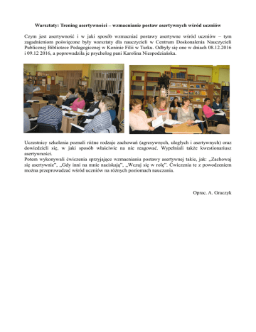 Warsztaty: Trening asertywności – wzmacnianie postaw asertywnych wśród uczniów Czym jest asertywność i w jaki sposób wzmacniać postawy asertywne wśród uczniów – tym zagadnieniom poświęcone były warsztaty dla nauczycieli w Centrum Doskonalenia Nauczycieli Publicznej Bibliotece Pedagogicznej w Koninie Filii w Turku. Odbyły się one w dniach 08.12.2016 i 09.12 2016, a poprowadziła je psycholog pani Karolina Niespodziańska. Uczestnicy szkolenia poznali różne rodzaje zachowań (agresywnych, uległych i asertywnych) oraz dowiedzieli się, w jaki sposób właściwie na nie reagować. Wypełniali także kwestionariusz asertywności. Potem wykonywali ćwiczenia sprzyjające wzmacnianiu postawy asertywnej takie, jak: ,,Zachowaj się asertywnie”, ,,Gdy inni na mnie naciskają”, ,,Wczuj się w rolę”. Ćwiczenia te z powodzeniem można przeprowadzać wśród uczniów na różnych poziomach nauczania. Oprac. A. Graczyk