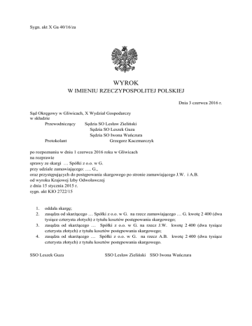 Sygn. akt X Ga 40/16/za WYROK W IMIENIU RZECZYPOSPOLITEJ POLSKIEJ Dnia 3 czerwca 2016 r. Sąd Okręgowy w Gliwicach, X Wydział Gospodarczy w składzie Przewodniczący Sędzia SO Lesław Zieliński Sędzia SO Leszek Guza Sędzia SO Iwona Wańczura Protokolant Grzegorz Kaczmarczyk po rozpoznaniu w dniu 1 czerwca 2016 roku w Gliwicach na rozprawie sprawy ze skargi … Spółki z o.o. w G. przy udziale zamawiającego: …. G., oraz przystępujących do postępowania skargowego po stronie zamawiającego J.W. i A.B. od wyroku Krajowej Izby Odwoławczej z dnia 15 stycznia 2015 r. sygn. akt KIO 2722/15 1. 2. 3. 4. oddala skargę; zasądza od skarżącego … Spółki z o.o. w G. na rzecz zamawiającego … G. kwotę 2 400 (dwa tysiące czterysta złotych) z tytułu kosztów postępowania skargowego; zasądza od skarżącego … Spółki z o.o. w G. na rzecz J.W. kwotę 2 400 (dwa tysiące czterysta złotych) z tytułu kosztów postępowania skargowego; zasądza od skarżącego … Spółki z o.o. w G. na rzecz A.B. kwotę 2 400 (dwa tysiące czterysta złotych) z tytułu kosztów postępowania skargowego. SSO Leszek Guza SSO Lesław Zieliński SSO Iwona Wańczura Transkrypcja uzasadnienia wygłoszonego w dniu 3.06.2016 r. w sprawie X Ga 40/16 w zakresie znaczników czasowych 00:02:24 - 00:32:15. (x_151515000005027_X_Ga_40_16_262_20160603_112816_000224_002951_X.mp4) * * * * * * początek tekstu YYA732799_01 [Przewodniczący 00:02:24.588] Uzasadnienie. Przypomnę, że zamawiający … G. prowadzi w trybie przetargu nieograniczonego postępowanie o udzielenie zamówienia publicznego, którego przedmiotem jest zimowe utrzymanie dróg na terenie miasta G.. Przedmiot zamówienia został podzielony na 12 rejonów. Dnia 14 grudnia 2015 roku wykonawca … Spółka z o.o. w G. wniósł odwołanie do prezesa Krajowej Izby Odwoławczej w zakresie rejonów czwartego, piątego i siódmego. Niniejsza sprawa mieści się w zakresie odwołania dotyczącego rejonu siódmego. Nie przedstawiając szczegółowo zarzutów odwołania, bowiem nie mają one znaczenia dla rozstrzygnięcia Sądu w niniejszej sprawie, należy wskazać, że odwołujący wniósł o uwzględnienie odwołania i nakazanie zamawiającemu unieważnienie czynności wybory oferty najkorzystniejszej między innymi dla rejonu siódmego, dokonania powtórnej czynności badania ofert i oceny ofert, między innymi w rejonie siódmym, odrzucenia ofert złożonych przez … w rejonie siódmym, wykluczenia … z postępowania ze względu na niewykazanie spełnienia warunków udziału w postępowaniu oraz złożenie nieprawdziwych informacji, ewentualnie wcześniejsze skierowanie wezwania do uzupełnienia dokumentów lub udzielenia wyjaśnień w wyżej wymienionym zakresie. Wniósł również o dokonanie wyboru oferty … jako najkorzystniejszej w rejonach, między innymi w rejonie siódmym. Odwołujący wskazał, że ma interes we wniesieniu odwołania, gdyż jest wykonawcą, który złożył ofertę w przedmiotowym postępowaniu, między innymi na rejon siódmy, w którym został sklasyfikowany na pozycji drugiej. Zamawiający w postępowaniu przed Krajową Izbą Odwoławczą nie złożył pisemnej odpowiedzi na odwołanie, do postępowania odwoławczego po stronie zamawiającego skutecznie przystąpili A.B., Zakład … , M.K. i J.W.. Zaskarżonym wyrokiem KIO oddaliła odwołanie w sprawie sygnatura akt KIO 2722/15 i swoje rozstrzygnięcie Izba uzasadniła w ten sposób, iż ustaliła i zważyła, iż oddaliła odwołanie stwierdzając, że odwołujący nie legitymuje się interesem w rozumieniu przepisu artykułu 179 ustęp 1 Prawa zamówień publicznych, gdyż oferta odwołującego w zakresie skarżonych rejonów przestała wiązać, co z kolei w przypadku uwzględnienia zarzutów uniemożliwia jej wybór, wskutek czego zastosowanie znajduje artykuł, przepis artykułu 192 ustęp 1 ustawy Prawo zamówień publicznych, nakazujący Izbie oddalenie odwołania. Dalej stwierdziła Izba, że w przedmiotowym postępowaniu odwołujący nie dopełnił obowiązku wynikającego z przepisu artykułu 85 ustęp 2 Prawa zamówień publicznych, zgodnie z którym wykonawca samodzielnie lub na wniosek zamawiającego może przedłużyć termin związania ofertą. Wskazała Izba, że termin związania ofertą upłynął z dniem 13 grudnia 2015 roku, a odwołujący dopiero w dacie 14 grudnia 2015 roku po terminie, po upływie terminu związania ofertą przedłużył jej ważność, tym samym przerwanie terminu związania ofertą spowodowało wygaśnięcie oferty odwołującego, co z kolei wywołuje skutek uniemożliwienia zamawiającemu dokonanie wyboru tej oferty w tym postępowaniu. Podniosła Izba, że przepisy ustawy Prawo zamówień publicznych traktują odwołanie jako środek ochrony prawnej skierowany na zmianę sytuacji wykonawcy, polegającej na możliwym uzyskaniu w danym postępowaniu zamówienia przez odwołującego. Zatem Krajowa Izba Odwoławcza z urzędu w każdym rozpatrywanym przypadku zobowiązana jest do badania przesłanek wskazanych w artykule 179 ustęp 1 Prawa zamówień publicznych, to jest interesów w uzyskaniu danego zamówienia oraz poniesienia lub możliwości poniesienia szkody. Wskazała Izba dalej, że są to przesłanki materialno-prawne, co oznacza, że odwołanie w przypadku ich braku lub nieudowodnienia podlega oddaleniu z uwagi na brak legitymacji do jego wniesienia, niezależnie od zasadności podnoszonych w odwołaniu zarzutów. Dlatego przyjęła Izba, że odwołujący utracił możliwość wyboru jego oferty jako najkorzystniejszej w momencie, gdy nie przedłużył terminu związania ofertą w ten sposób, aby zapewnić jego ciągłość przez cały okres prowadzenia postępowania o udzielenie zamówienia publicznego. Podkreśliła dalej Izba, że odwołujący nie zaprzeczył okolicznościom wskazanym przez przystępującego Zakład Usług..., mam tutaj skrót, muszę sobie znaleźć, Zakład … , a jedynie próbował wskazywać
