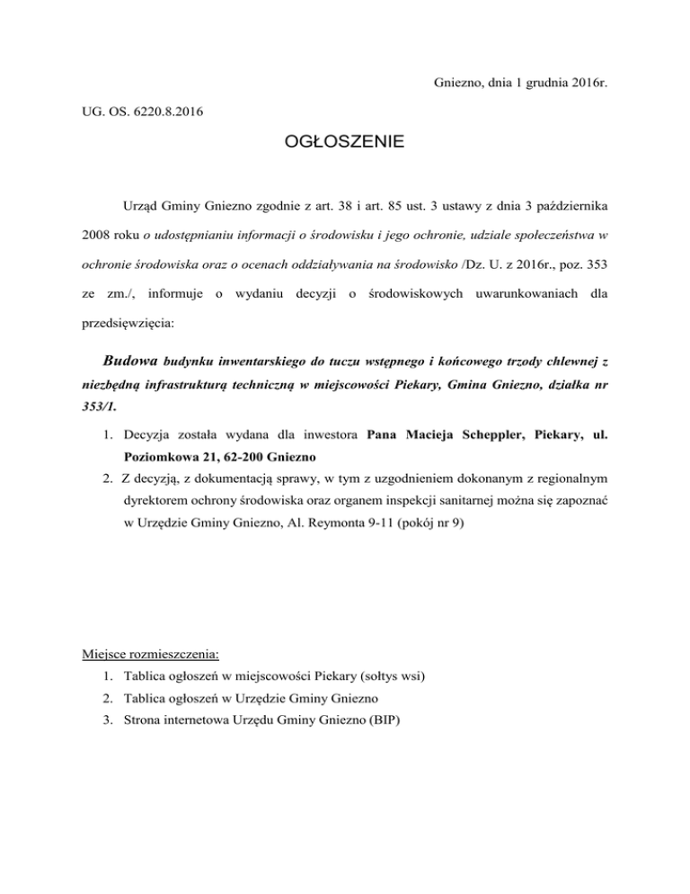 Gniezno, dnia 1 grudnia 2016r. UG. OS. 6220.8.2016 OGŁOSZENIE Urząd Gminy Gniezno zgodnie z art. 38 i art. 85 ust. 3 ustawy z dnia 3 października 2008 roku o udostępnianiu informacji o środowisku i jego ochronie, udziale społeczeństwa w ochronie środowiska oraz o ocenach oddziaływania na środowisko /Dz. U. z 2016r., poz. 353 ze zm./, informuje o wydaniu decyzji o środowiskowych uwarunkowaniach dla przedsięwzięcia: Budowa budynku inwentarskiego do tuczu wstępnego i końcowego trzody chlewnej z niezbędną infrastrukturą techniczną w miejscowości Piekary, Gmina Gniezno, działka nr 353/1. 1. Decyzja została wydana dla inwestora Pana Macieja Scheppler, Piekary, ul. Poziomkowa 21, 62-200 Gniezno 2. Z decyzją, z dokumentacją sprawy, w tym z uzgodnieniem dokonanym z regionalnym dyrektorem ochrony środowiska oraz organem inspekcji sanitarnej można się zapoznać w Urzędzie Gminy Gniezno, Al. Reymonta 9-11 (pokój nr 9) Miejsce rozmieszczenia: 1. Tablica ogłoszeń w miejscowości Piekary (sołtys wsi) 2. Tablica ogłoszeń w Urzędzie Gminy Gniezno 3. Strona internetowa Urzędu Gminy Gniezno (BIP)