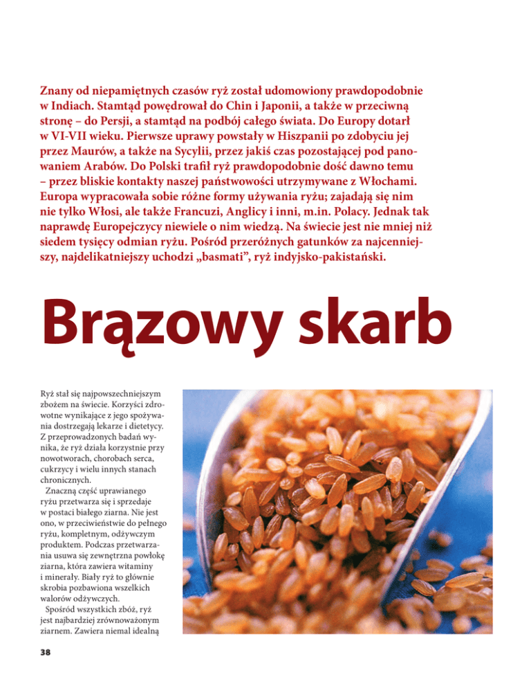 Znany od niepamiętnych czasów ryż został udomowiony prawdopodobnie w Indiach. Stamtąd powędrował do Chin i Japonii, a także w przeciwną stronę – do Persji, a stamtąd na podbój całego świata. Do Europy dotarł w VI-VII wieku. Pierwsze uprawy powstały w Hiszpanii po zdobyciu jej przez Maurów, a także na Sycylii, przez jakiś czas pozostającej pod panowaniem Arabów. Do Polski trafił ryż prawdopodobnie dość dawno temu – przez bliskie kontakty naszej państwowości utrzymywane z Włochami. Europa wypracowała sobie różne formy używania ryżu; zajadają się nim nie tylko Włosi, ale także Francuzi, Anglicy i inni, m.in. Polacy. Jednak tak naprawdę Europejczycy niewiele o nim wiedzą. Na świecie jest nie mniej niż siedem tysięcy odmian ryżu. Pośród przeróżnych gatunków za najcenniejszy, najdelikatniejszy uchodzi „basmati”, ryż indyjsko-pakistański. Brązowy skarb Ryż stał się najpowszechniejszym zbożem na świecie. Korzyści zdrowotne wynikające z jego spożywania dostrzegają lekarze i dietetycy. Z przeprowadzonych badań wynika, że ryż działa korzystnie przy nowotworach, chorobach serca, cukrzycy i wielu innych stanach chronicznych. Znaczną część uprawianego ryżu przetwarza się i sprzedaje w postaci białego ziarna. Nie jest ono, w przeciwieństwie do pełnego ryżu, kompletnym, odżywczym produktem. Podczas przetwarzania usuwa się zewnętrzna powłokę ziarna, która zawiera witaminy i minerały. Biały ryż to głównie skrobia pozbawiona wszelkich walorów odżywczych. Spośród wszystkich zbóż, ryż jest najbardziej zrównoważonym ziarnem. Zawiera niemal idealną 38 proporcję energii i składników odżywczych. Odżywia wszystkie organy, szczególnie mózg, kręgosłup, płuca, jelita, nerki, pęcherz moczowy i układ rozrodczy. Przyczynia się także do zachowania spokojnego umysłu i właściwego osądu. Piramida żywieniowa wyróżnia brązowy ryż. W zaleceniach amerykańskiego rządu stwierdza się, że podstawą każdego posiłku powinny być pełne zboża, wśród których najlepszy jest właśnie brązowy ryż. Ryż pomaga przy zaburzeniach trawiennych, szczególnie ryż brązowy, zawiera bowiem cztery razy więcej włókien niż polerowany, dzięki czemu znacząco zwiększa ilość dobrych dla organizmu bakterii w jelicie grubym. Australijscy naukowcy donoszą, że konsumpcja brązowego ryżu pomogła zmniejszyć produkcję glukozy w wątrobie u zdrowych osób. Jej niewielka ilość spowalnia wydzielanie insuliny i zapobiega cukrzycy oraz innym zaburzeniom trawiennym. Brązowy ryż chroni przed wystąpieniem chorób serca i wysokiego ciśnienia krwi. Amerykańskie Stowarzyszenie Serca już dawno rozpoznało znaczenie pełnego ryżu i innej bogatej we włókna żywności dla utrzymania w zdrowiu układu sercowo-naczyniowego. Dr Dean Ornish w swoim sztandarowym doświadczeniu, które miało wykazać, że choroba wieńcowa może być odwracalna, swoich pacjentów, będących w zaawansowanym stadium choroby, poddał diecie opartej na brązowym ryżu i innych ziarnach. Japończycy, którzy na ogół mają niskie ciśnienie, zawdzięczają to regularnemu jedzeniu ryżu. Inne wyniki badań wskazują, że wiele składników odżywczych znajdujących się w ziarenkach ryżu redukuje ryzyko wystąpienia chorób wieńcowych serca. Te drogocenne składniki to: kwas linoleinowy, włókno, witamina E, selen, folan, a także fitoestrogeny i kwasy fenolowe posiadające właściwości antyutleniające. Brązowy ryż chroni przed nowotworami. Kobiety włączając go do zrównoważonej diety makrobiotycznej, przetwarzają estrogeny znacznie szybciej niż kobiety stosujące standartową dietę współczesną. Badacze z Medycznego Centrum w Nowej Anglii wywnioskowali, że może to przeciwdziałać powstawaniu raka piersi. Naukowcy z Tulan University odkryli, że pacjenci z nowotworem Pełny ryż zmniejsza ryzyko powstawania cukrzycy. Według badaczy z Uniwersytetu w Harwardzie, to właśnie biały ryż i żywność bogata w skrobię przyczyniają się do powstawania cukrzycy. W roku 1997 przeprowadzono badania na 65 173 kobietach i stwierdzono, że wśród tych, które jadły żywność o dużej zawartości skrobi i niskiej zawartości włókien, Pełny ryż zmniejsza ryzyko powstawania cukrzycy. Zdaniem naukowców australijskich, konsumpcja brązowego ryżu pomogła zmniejszyć produkcję glukozy w wątrobie u zdrowych ludzi. Jego niewielka ilość spowalnia wydzielanie insuliny i zapobiega cukrzycy oraz innym zaburzeniom trawiennym. trzustki lub prostaty, stosujący dietę makrobiotyczną bogatą w brązowy ryż, żyli dwa lub trzy razy dłużej niż pozostali pacjenci. Brązowy ryż i inne zboża mogą zabezpieczyć przed nowotworami poprzez hamowanie niszczącego działania utleniaczy na nabłonek jelit i sąsiadujących komórek – stwierdzają badacze z Uniwersytetu w Minnesocie. Związki fitochemiczne w pełnych ziarnach zbóż dodatkowo blokują pierwsze uszkodzenia DNA i hamują dalszy rozwój guza. Brązowy ryż zawiera inozytol heksfosfatowy, naturalną substancję, która aktywuje funkcję obronną komórek i hamuje rozwój nowotworu. Również brytyjscy badacze, po przeprowadzonych testach nad ludzkimi komórkami, stwierdzili, że jedzenie brązowego ryżu może chronić przed rakiem piersi i jelita grubego. Także Włoski Narodowy Instytut Nowotworów w Mediolanie potwierdził, że dieta makrobiotyczna bogata w brązowy ryż może obniżyć ryzyko powstania raka piersi u kobiet. zachorowalność na cukrzycę była 2,5 razy wyższa niż kobiet, które spożywały pełne ziarna. Po przeprowadzonych w Singapurze badaniach interwencyjnych, badacze stwierdzili, że 183 pacjentów z cukrzycą, którzy jedli niepolerowany ryż brązowy, ograniczyli kalorie i produkty tłuste, osiągnięto długoterminową samokontrolę nad chorobą w porównaniu z 95 pacjentami z grupy kontrolnej. Opracowanie Irena Lus 39