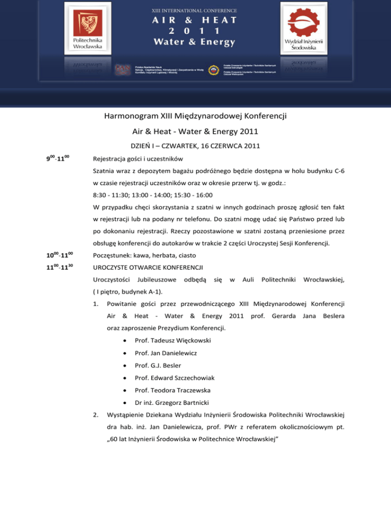 Harmonogram XIII Międzynarodowej Konferencji Air & Heat - Water & Energy 2011 DZIEŃ I – CZWARTEK, 16 CZERWCA 2011 900˗1100 Rejestracja gości i uczestników Szatnia wraz z depozytem bagażu podróżnego będzie dostępna w holu budynku C-6 w czasie rejestracji uczestników oraz w okresie przerw tj. w godz.: 8:30 - 11:30; 13:00 - 14:00; 15:30 - 16:00 W przypadku chęci skorzystania z szatni w innych godzinach proszę zgłosić ten fakt w rejestracji lub na podany nr telefonu. Do szatni mogę udać się Państwo przed lub po dokonaniu rejestracji. Rzeczy pozostawione w szatni zostaną przeniesione przez obsługę konferencji do autokarów w trakcie 2 części Uroczystej Sesji Konferencji. 1000˗1100 Poczęstunek: kawa, herbata, ciasto 1100˗1130 UROCZYSTE OTWARCIE KONFERENCJI Uroczystości Jubileuszowe odbędą się w Auli Politechniki Wrocławskiej, ( I piętro, budynek A-1). 1. Powitanie gości przez przewodniczącego XIII Międzynarodowej Konferencji Air & Heat - Water & Energy 2011 prof. Gerarda Jana Beslera oraz zaproszenie Prezydium Konferencji. 2. • Prof. Tadeusz Więckowski • Prof. Jan Danielewicz • Prof. G.J. Besler • Prof. Edward Szczechowiak • Prof. Teodora Traczewska • Dr inż. Grzegorz Bartnicki Wystąpienie Dziekana Wydziału Inżynierii Środowiska Politechniki Wrocławskiej dra hab. inż. Jan Danielewicza, prof. PWr z referatem okolicznościowym pt. „60 lat Inżynierii Środowiska w Politechnice Wrocławskiej” 3. Wystąpienie J.M. Rektora Politechniki Wrocławskiej prof. dr hab. inż. Tadeusza Więckowskiego. 1130˗1300 5 Referatów Programowych Przewodniczą: Prof. Edward Szczechowiak, Prof. Teodora M. Traczewska, Dr inż. Grzegorz Bartnicki 1. Prof. Edward Szczechowiak, „Przemiany strukturalne systemów HVAC dla budynków przyszłości”. 2. Prof. Teodora M. Traczewska, „Procesy biologiczne w inżynierii środowiska”. 3. Prof. Janusz Wojtkowiak, „Energia gruntu- dla ogrzewania i chłodzenia”. 4. Prof. Wojciech Adamski, „Współczesne trendy w oczyszczaniu wody”. 5. Prof. Sergey Anisimov, „Energooszczędność w klimatyzacji”. 00 13 ˗14 00 Przerwa na lunch 00 30 5 Referatów Programowych 14 ˗15 Przewodniczą: prof. W. Adamski, Prof. Jerzy Zwoździak, dr inż. Piotr Jadwiszczak 6. Prof. Jerzy Zwoździak, „Potrzeba kształcenia w zakresie ochrony i inżynierii atmosfery”. 7. Prof. Jan Syposz, „Modele symulacyjne budynków w systemach zarządzania energią”. 8. Prof. Marek Sozański, „Technologia uzdatniania wody”. 9. Prof. Andrzej Szczurek, „Systemy czujnikowe w ocenie jakości powietrza pomieszczeń”. 10. Dr inż. Ryszard Szpadt, „Recykling i gospodarka odpadami”. 1530˗1600 Przerwa na kawę i herbatę 1600 Przejazd autokarami do Kudowy Zdroju na kolejne sesje Konferencji. Zakwaterowanie uczestników w Hotelu Verde Montana****. 2000˗200 SPOTKANIE INTEGRACYJNE PRZY GRILLU Podczas spotkania organizatorzy zapewniają wyżywienie, napoje oraz oprawę muzyczną na żywo. Zalecany ubiór: strój nieformalny. DZIEŃ II - PIĄTEK, 17 CZERWCA 2011 730˗900 30 8 ˗10 00 Śniadanie Sesja III Niekonwencjonalne źródła energii (6 wystąpień) Przewodniczący: prof. Władysław NOWAK , prof. Aleksander STACHEL, dr Maciej BESLER 1. ORZECHOWSKI T., STOKOWIEC K., ANALIZA PRACY AKUMULATORA CIEPŁA W UKŁADZIE KOLEKTORA SŁONECZNEGO 20/Tom 2 2. GRZĄDZIELSKI W., MRÓZ T. M., SUSTAINABLE ENERGY PLANNING IN COMMUNITIES, POVIAT AND DISTRICTS IN CONNECTION TO THE NATURAL GAS SYSTEM DEVELOPMENT 34/Tom 1 3. GUMUŁA S., PIASKOWSKA-SILARSKA M., TERMICZNE PRZEKSZTAŁCANIE ODPADÓW KOMUNALNYCH W CELU PRODUKCJI CIEPŁA I ENERGII ELEKTRYCZNEJ 35/Tom 1 4. ROSIŃSKI M., SPIK Z., KSIONEK D., BADANIA STABILNOŚCI TERMODYNAMICZNEJ PODCZAS AKUMULOWANIA CIEPŁA W WOSKU PSZCZELIM Z WYKORZYSTANIEM ZJAWISKA PRZEMIANY FAZOWEJ 27/Tom 2 5. 30 8 ˗10 JELEŃ I., PANTERA D., KOLEKTORY SŁONECZNE W BUDYNKACH JEDNORODZINNYCH 41/Tom 1 00 Sesja IV Ogrzewnictwo Wentylacja Klimatyzacja (6 wystąpień) Przewodniczący: prof. Halina KOCZYK, prof. Władysław SZAFLIK, dr Bogdan NOWAK 1. SEKRET R., WILCZYŃSKI J., JACHURA A. ANALIZA ZMIAN TEMPERATUR POWIETRZA ZEWNĘTRZNEGO W OKRESIE 60 LAT DLA MIASTA CZĘSTOCHOWY, 29/Tom 2 2. FOIT H., ŚWIERC A., WYZNACZANIE ZESPOŁU POMIESZCZEŃ REPREZENTATYWNYCH WIELORODZINNEGO BUDYNKU MIESZKALNEGO DLA POTRZEB DIAGNOSTYKI CIEPLNEJ BUDYNKU 28/Tom 1 3. SPECJAŁ A. MODEL TERMOSTATYCZNEGO ZAWORU GRZEJNIKOWEGO DLA SYMULACJI ENERGETYCZNEJ BUDYNKÓW 4. BARANOWSKI, A., FERDYN-GRYGIEREK J., WYMIANA POWIETRZA W BUDYNKACH MUZEALNYCH – SYMULACJA Z ELEMENTAMI WALIDACJI 4/Tom 1 5. JAGLAK K. NOWOCZESNE ROZWIĄZANIA BELIMO W ELEMENTACH WYKONAWCZYCH HVAC 1000˗1015 krótka przerwa na kawę i herbatę 1015˗1145 Sesja V Niekonwencjonalne źródła energii (6 wystąpień) Przewodniczący: prof. Stanisław GOMUŁA, prof. Robert SEKRET, dr Dariusz KWIECIEŃ 1. STĘPIEŃ A., DETERMINANTY EKONOMICZNE I EKOLOGICZNE WSPÓŁSPALANIA BIOMASY I WĘGLA W KOTLE RETORTOWYM 2. NITKIEWICZ A., SEKRET R., ANALIZA EGZERGETYCZNA NISKOTEMPERATUROWEGO SYSTEMU CIEPŁOWNICZEGO WSPÓŁPRACUJĄCEGO Z GEOTERMALNYM ŹRÓDŁEM ENERGII 14/Tom 2 3. AMANOWICZ Ł., WOJTKOWIAK J., WPŁYW NIERÓWNOŚCI PRZEPŁYWU W GAŁĘZIACH NA EFEKTYWNOŚĆ CIEPLNĄ POWIETRZNYCH WIELORUROWYCH GRUNTOWYCH WYMIENNIKÓW CIEPŁA 2/Tom 1 4. TURSKI M., SEKRET R., BADANIA DOŚWIADCZALNE ADSORPCYJNEGO SYSTEMU CHŁODZENIA ZASILANEGO ENERGIĄ PROMIENIOWANIA SŁONECZNEGO 47/Tom2 5. FIDORÓW N., DANIELEWICZ J., PRZYGOTOWANIE CIEPŁEJ WODY UŻYTKOWEJ PRZY POMOCY PODGRZEWACZA POJEMNOŚCIOWEGO ZASILANEGO POMPĄ CIEPŁA POWIETRZE-WODA W OKRESIE PRZEJŚCIOWYM 26/Tom 1 15 10 ˗1145 Sesja VI Ogrzewnictwo Wentylacja Klimatyzacja (6 wystąpień) Przewodniczący: prof. Marian ROSIŃSKI, dr hab. Janusz BUJAK, dr inż. Wojciech CEPIŃSKI 1. JEDLIKOWSKI A., DADAR A., REALIZACJA BEZPIECZNEJ PRACY KRZYŻOWYCH WYMIENNIKÓW STOSOWANYCH DO ODZYSKU CIEPŁA W UKŁADACH WENTYLACYJNYCH W WARUNKACH UJEMNYCH TEMPERATUR POWIETRZA 