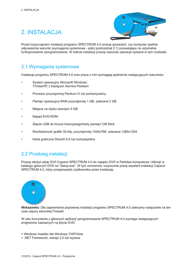 2. INSTALACJA 2. INSTALACJA SPECTRUM 4.0 Installations-DVD Przed rozpoczęciem instalacji programu SPECTRUM 4.0 proszę sprawdzić, czy komputer spełnia odpowiednie warunki (wymagania systemowe - patrz podrozdział 2.1) pozwalające na optymalne funkcjonowanie oprogramowania. W trakcie instalacji proszę wykonać operacje opisane w tym rozdziale. 2.1 Wymagania systemowe Instalacja programu SPECTRUM 4.0 oraz praca z nim wymagają spełnienia następujących warunków: • System operacyjny Microsoft Windows: 7/Vista/XP, z bieżącym Service Packiem • Procesor przynajmniej Pentium IV lub porównywalny • Pamięć operacyjna RAM przynajmniej 1 GB, zalecana 2 GB • Miejsce na dysku twardym 5 GB • Napęd DVD-ROM • Złącze USB do klucza licencyjnego/karty pamięci CM Stick • Rozdzielczość grafiki 32 bity, przynajmniej 1024x768, zalecana 1280x1024 • Karta graficzna DirectX 9.0 lub kompatybilna 2.2 Przebieg instalacji Proszę włożyć płytę DVD Caparol SPECTRUM 4.0 do napędu DVD w Państwa komputerze i kliknąć w katalogu głównym DVD na “Setup.exe”. W tym momencie, rozpocznie pracę asystent instalacji Caparol SPECTRUM 4.0, który przeprowadzi użytkownika przez instalację. Wskazówka: Dla zapewnienia poprawnej instalacji programu SPECTRUM 4.0 zalecamy wyłączenie na ten czas zapory sieciowej Firewall. W celu korzystania z głównych aplikacji oprogramowanie SPECTRUM 4.0 wymaga następujących programów zapisanych na płycie DVD: > Windows Installer dla Windows 7/XP/Vista > .NET Framework, wersja 3.5 lub wyższa 11/2010 - Caparol SPECTRUM 4.0 - Podręcznik 7 2. INSTALACJA Przy uruchomieniu asystenta instalacji Caparol SPECTRUM 4.0 system sprawdza, czy wszystkie potrzebne programy są zainstalowane. Gdyby tak nie było, asystent instalacji automatycznie wywołuje niezbędne programy, które wspomagają użytkownika przy instalowaniu koniecznych programów. Następnie, asystent instalacji wyświetli listę koniecznych programów. Proszę kliknąć na przycisk „Dalej” („Weiter“), by kontynuować instalację. Teraz po kolei zostaną wywoływani asystenci instalacji potrzebnych komponentów. 11/2010 - Caparol SPECTRUM 4.0 - Podręcznik 8 2. INSTALACJA Proszę wykonywać wyświetlane polecenia, w celu zainstalowania właściwych programów. Dodatkowo, za pomocą odpowiedniego pola wyboru mogą Państwo wybrać, czy instalacja programu SPECTRUM 4.0 po wgraniu koniecznych programów ma być przerwana. Standardowo - pole wyboru jest aktywne. Po zainstalowaniu wszystkich programów koniecznych do pracy głównych aplikacji uruchamiany jest asystent instalacji programu SPECTRUM 4.0. Proszę wykonać polecenia asystenta, by zainstalować ten program. Po zakończeniu instalacji proszę włożyć kartę pamięci CM Stick (Państwa klucz licencyjny) do gniazda USB i uruchomić program SPECTRUM 4.0. Wskazówka: Przy pracy z programem SPECTRUM 4.0 karta pamięci CM Stick zawsze musi być przyłączona. 2.3 Aktualizacje Podczas uruchamiania, program SPECTRUM 4.0, informuje o dostępności nowych aktualizacji. Po otrzymaniu informacji o aktualizacji prosimy ją zainstalować, aby zawsze dysponować najnowszym oprogramowaniem. Wskazówka: Aktualizacje oferowane przy starcie oprogramowania unowocześniają jedynie sam program. Gdy do swojego oprogramowania chcą Państwo załadować nowe barwy lub materiały, proszę skorzystać z interakcyjnej materiałowej bazy danych zawartej w module programowym EXPLORER (patrz punkt 4.2.4). 11/2010 - Caparol SPECTRUM 4.0 - Podręcznik 9 3. PRZEGLĄD PROGRAMU 3. PRZEGLĄD PROGRAMU 3.1 Struktura graficznego interfejsu użytkownika Moduły programowe Blok nawigacji głównej Pasek menu Rejestry Kolorymetr 3D ColorMunki (Buntstift 3D) Blok nawigacji głównej Blok nawigacji głównej znajduje się przy górnej krawędzi ekranu i zawiera następujące składniki: Plik, Studio, Widok, Dodatki i Pomoc. Objaśniono je bliżej w podrozdziale 3.2. Blok modułów programowych Blok modułów programowych znajduje się w lewym górnym obszarze ekranu i zawiera pięć modułów: EXPLORER, PHOTOstudio, 3Dstudio, MATERIALstudio i SHOW. Przyciski te są dostępne z każdego obszaru i umożliwiają przemieszczanie się między modułami. Szczegółowe informacje na temat funkcji poszczególnych modułów zamieszczono w rozdziałach od 4 do 8. Przyciski funkcyjne na pasku menu Przyciski funkcyjne poszczególnych modułów znajdują się bezpośrednio pod kolorową linią modułów w środkowym obszarze widoku. Za pomocą tych symboli można dane zależnie od modułu importować, eksportować, zapamiętywać lub drukować. Przyciski te objaśniono bliżej w poszczególnych modułach. 11/2010 - Caparol SPECTRUM 4.0 - Podręcznik 10 3. PRZEGLĄD PROGRAMU Rejestry Z prawej i/lub lewej strony graficznego interfejsu użytkownika znajdują się rejestry o różnych zawartościach i narzędziach, które można otwierać przez kliknięcie nazwy wybranego rejestru. Zawartości rejestrów będą objaśnione szczegółowo w poszczególnych modułach. 3.2 Nawigacja główna W bloku nawigacji głównej widać przyciski pięciu modułów, które umożliwiają przechodzenie między różnymi trybami programu tam i z powrotem. Są one zawsze dostępne z każdego obszaru. Blok nawigacji głównej jest widoczny z każdego obszaru. Zależnie od wybranego aktualnie modułu spełnia on częściowo różne funkcje charakterystyczne dla danego modułu. 3.2.1 Plik Funkcje składnika nawigacji „Plik” („Datei”) różnią się zależnie od modułu pod względem zapamiętywania, drukowania lub otwierania. „Plik” zawsze zawiera możliwość zamknięcia programu za pomocą przycisku „Zakończ” („Beenden”). Informacje na temat funkcji „Plik” podano w poszczególnych modułach. EXPLORER SHOW PHOTOstudio 3Dstudio MATERIALstudio 11/2010 - Caparol SPECTRUM 4.0 - Podręcznik 11 3. PRZEGLĄD PROGRAMU 3.2.2 Studio W pozycji „Studio” istnieje możliwość przemieszczania