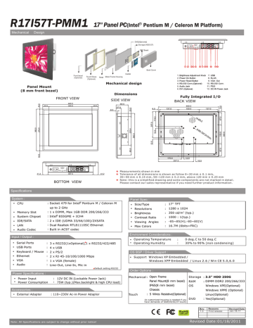 R17I57T-PMM1 Mechanical 17" Panel PC(Intel Pentium M / Celeron M Platform) R Design Storage (HDD/CF) SBC Board Back Cover Front bezel (Optional) Inverter Touch/Glass (Optional) Panel Metal Frame Housing Mechanical design Panel Mount (8 mm front bezel) Dimensions FRONT VIEW Fully Integrated I/O SIDE VIEW BACK VIEW Measurements shown in mm * Tolerance dimensions is shown as follow 0~30 mm ± 0.1 mm, * 30~50 mmof±all0.15 mm, 50~120 mm ± 0.2 mm, above 120 mm ± 0.25 mm Note: this is a simplified drawing and some components are not marked in detail. * Please contact our sales representative if you need further product information. Specifications System : CPU Panel Spec : : Socket 479 for IntelR Pentium M / Celeron M up to 2 GHz Size/Type : 17" TFT Resolutions : 1280 x 1024 Memory Slot : 1 x DIMM, Max 1GB DDR 200/266/333 Brightness : 350 cd/m (typ.) System Chipset : IntelR 855GME + ICH4 : 2 x IDE (UDMA 33/66/100)/2XSATA Contrast Ratio : 1000 : 1(typ.) Viewing Angles : -85~85(H);-80~80(V) : Dual Realtek RTL81110SC Ethernet : Built in AC97 codec Max Colors : 16.7M (6bits+FRC) IDE/SATA LAN Audio Codec Environment Considerations : Input / Output : Serial Ports : 3 x RS232(1xOptional),1 x RS232/422/485 USB Ports : 4 x USB Keyboard / Mouse : 2 x PS/2 Ethernet VGA Audio 2 : 2 x RJ 45-10/100/1000 Mbps : 1 x VGA (female) : Line-Out, Line-In, Mic in Operating Temperature Operating Humidity : : 0 deg.C to 50 deg.C 30% to 90% (non condensing) OS BSP / Driver Support : Support Windows XP Embedded / Windows XPP Embedded / Linux 2.6 / Win CE 5.0,6.0 Default setting:RS232 Order Options : Power Specifications : Power Input Power Consumption : 12V DC IN (Lockable Power Jack) : 75W (typ.)(Max.backlight & high CPU load) Mechanical : Open Frame Panel Mount(8 mm bezel) IP65(8 mm bezel) RAM : DIMM DDR2 200/266/333 OS Windows XPE(Optional) Chassis Accessori es : Externa l Adapter Storage : 3.5" HDD 250G : 110~230V Ac-in Power Adapter Touch Windows XPPE (Optional) : 5 Wires Resistive(Optional) (A customized housing is needed if you have demands of SAW/IR/SC/IT touch) Linux(Optional) DVD : Yes(Optional) Rev. 1.0 Note: All Specifications are subject to change without prior notice! Reasons First release Revised Date Jan-18-11 Revised Date:01/18/2011