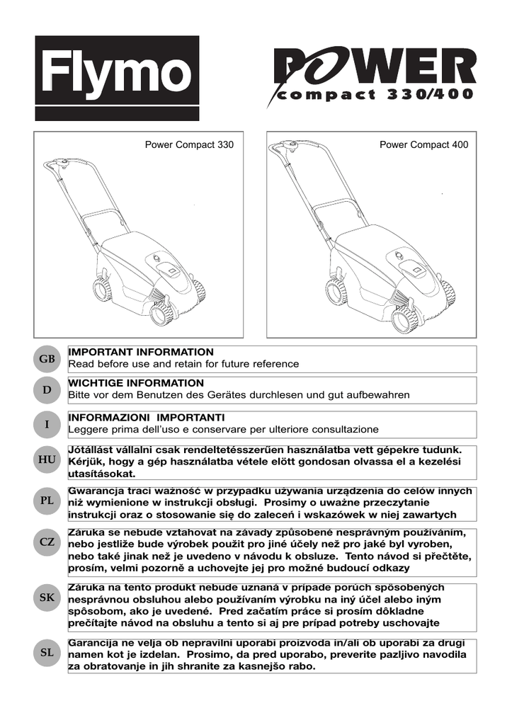 Power Compact 330 GB Power Compact 400 IMPORTANT INFORMATION Read before use and retain for future reference D WICHTIGE INFORMATION Bitte vor dem Benutzen des Gerätes durchlesen und gut aufbewahren I INFORMAZIONI IMPORTANTI Leggere prima dell’uso e conservare per ulteriore consultazione HU Jótállást vállalni csak rendeltetésszerűen használatba vett gépekre tudunk. Kérjük, hogy a gép használatba vétele elött gondosan olvassa el a kezelési utasításokat. PL Gwarancja traci ważność w przypadku używania urządzenia do celów innych niż wymienione w instrukcji obsługi. Prosimy o uważne przeczytanie instrukcji oraz o stosowanie się do zaleceń i wskazówek w niej zawartych CZ SK SL Záruka se nebude vztahovat na závady způsobené nesprávným používáním, nebo jestliže bude výrobek použit pro jiné účely než pro jaké byl vyroben, nebo také jinak než je uvedeno v návodu k obsluze. Tento návod si přečtěte, prosím, velmi pozorně a uchovejte jej pro možné budoucí odkazy Záruka na tento produkt nebude uznaná v prípade porúch spôsobených nesprávnou obsluhou alebo používaním výrobku na iný účel alebo iným spôsobom, ako je uvedené. Pred začatím práce si prosím dôkladne prečítajte návod na obsluhu a tento si aj pre prípad potreby uschovajte Garancija ne velja ob nepravilni uporabi proizvoda in/ali ob uporabi za drugi namen kot je izdelan. Prosimo, da pred uporabo, preverite pazljivo navodila za obratovanje in jih shranite za kasnejšo rabo. A B C D 1 2 1 3 2 F E G 5 3 6 4 5 6 J K 1 grassbox full 2 grassbox empty L 1 2 3 H M N P Q 1 R S T U 1 2 3 4 5 V W 1 GB 1. 2. 3. 4. 5. 6. 7. 8. 9. 10. 11. 12. 13. 14. 15. D1. 2. 3. 4. 5. 6. 7. 8. 9. 10. 11. 12. 13. 14. 15. I1. 2. 3. 4. 5. 6. 7. 8. - CONTENTS Upper handle Cable clip Bolt Washer Handle knob handle Deck Lower handle fixing pin Grassbox Lid Individual height adjustment levers x 4 (Power Compact 330 Only) Height adjustment lever (Power Compact 400 Only) Lock off button Instruction Manual Warning Label Product Rating Label INHALT Oberer Griff Kabelhalter Bolzen Unterlegscheibe Griffknopf Unterer Griff Chassis Befestigungsbolzen, unterer Griff Deckel des Grasauffangbehälters Einzelne Höheneinstellungshebel x 4 (Nur Power Compact 330) Höheneinstellungshebel (Nur Power Compact 400) Knopf zur Festsetzung in AusPosition Bedienungsanweisung Warnetikett Produkttypenschild INDICE CONTENUTI Impugnatura superiore Morsetto per il cavo Bullone Rondella Manopola dell’impugnatura Impugnatura inferiore Telaio Perno di fissaggio dell’impugnatura inferiore 9. Coperchio del canestro raccoglierba 10. 4 leve per la regolazione individuale dell’altezza (solo nel Power Compact 330) 11. Leva per la regolazione dell’altezza (solo nel Power Compact 400) 12. Pulsante di sblocco 13. Manuale di istruzioni 14. Etichetta di pericolo 15. Etichetta dati del prodotto HU 1. 2. 3. 4. 5. 6. 7. 8. 9. 10. 11. 12. 13. 14. 15. - TARTALOMJEGYZÉK Felsò tolókar Kábelrögzítò Csavar Alátét Rögzítògomb Alsó tolókar Borító Alsó fogantyú rögzítòcsap Fûtároló fedél Vágásmagasság állító kar x 4 (csak Power Compact 330) Vágásmagasság állító kar (csak Power Compact 400) Biztonsági gomb Kezelési útmutató Figgelmeztetò címke Termékminòsítò címke PL - OPIS 1. Górny uchwyt 2. Zaczep kabla 3. Śruba 4. Podkładka 5. Gałka mocująca 6. Dolny uchwyt 7. Obudowa 8. Śruba mocująca dolnego uchwytu 9. Pokrywa pojemnika na trawę 10. Dźwigienki regulujące wysokość (x 4) (tylko Power Compact 330) 11. Dźwigienka regulująca wysokość (x 4) (tylko Power Compact 400) 12. Puszka przyłączeniowa 13. Instrukcja obsługi 14. Znaki bezpieczeństwa 15. Tabliczka znamionowa CZ 1. 2. 3. 4. 5. 6. 7. 8. 9. 10. 11. 12. 13. 14. 15. - OBSAH Horní rukojefl Spona kabelu ‡roub Podlo¥ka Plastová matice Spodní rukojefl Kryt sekaïky Upevñovací kolík dolní rukojeti Víko ko•e na trávu Jednotlivé páky k nastavování vƒ•ky seïení x 4 (pouze Power Compact 330 Páka k nastavenní vƒ•ky seïení (pouze Power Compact 400) Spínací sk¡íñka Návod k obsluze Vƒstran¥ƒ •títek Typovƒ •títek vƒrobku SK 1. 2. 3. 4. 5. 6. 7. 8. 9. 10. 11. 12. 13. 14. 15. - OBSAH Vrchná rukoväfl Svorka na kábel Skrutka Podlo¥ka K†b rukoväte Spodná rukoväfl Kryt Upevñovací kolík spodnej rukoväte Veko schránky na trávu Páky na nastavenie individuálnej vƒ•ky rezu 4 x (len pre vƒrobok Power Compact 330) Páky na nastavenie vƒ•ky rezu (len pre vƒrobok Power Compact 400) Vypínacia zámka Príruïka Varovnƒ •títok Prístrojovƒ •títok SL - VSEBINA 1. Zgornje dr¥alo 2. Sponka za kabel 3. Vijak 4. Podlo¥ka 5. Pritrdilna matica 6. Spodnje dr¥alo 7. Pokrov 8. Pritrdilni trn spodnjega dr¥ala 9. Pokrov zbiralnika trave 10. Roïke (4 x) za posamezne nastavitve vi•ine (Power Compact 330 only) 11. Roïke za nastavitev vi•ine (Power Compact 400 only) 12. Varnostni stikalni gumb 13. Priroïnik 14. Opozorilna oznaka 15. Napisna tablica (GB) CARTON CONTENTS (PL) ZAWARTOŚĆ KARTONU (D) KARTONINHALT (CZ) OBSAH KRABICE ((I) CONTENUTO (SK) OBSAH BALENIA (HU) A DOBOZ TARTALMA (SL) VSEBINA ŠKATLE Power Compact 330 4 15 3 9 14 8 5 10 2 7 13 12 1 6 Power Compact 400 14 4 9 15 8 3 11 5 7 2 13 12 1 6 INSTRUKCJA OBSŁUGI Kosiarka Power Compact 330/400 Wydanie I, 2001 SPIS TREŚCI 1. Objaśnienie symboli 2. Zasady bezpieczeństwa 3. Montaż 4. Regulacja 5. Uruchamianie i zatrzymywanie 6. Technika pracy 7. Konserwacja kosiarki 8. Usuwanie usterek str. 1 1 2 2 3 3 4 5 DANE TECHNICZNE Napięcie zasilania Moc silnika Klasa izolacji Ciężar Szerokość koszenia Wysokość koszenia Pojemność zbiornika na trawę Wskaźnik wypełnienia trawą PC 330 PC 400 230 V, 50 Hz 1600 W 1700 W II 12 kg 14 kg 33 cm 40 cm 12 - 75 mm 27 l 38 l tak UWAGA ! Kosiarka przeznaczona jest wyłącznie do zastosowań przydomowych i nie może być używana w innym celu niż koszenie trawy. UWAGA ! Znaki bezp