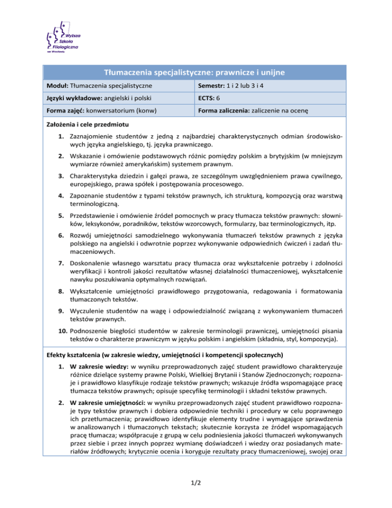 Tłumaczenia specjalistyczne: prawnicze i unijne Moduł: Tłumaczenia specjalistyczne Semestr: 1 i 2 lub 3 i 4 Języki wykładowe: angielski i polski ECTS: 6 Forma zajęć: konwersatorium (konw) Forma zaliczenia: zaliczenie na ocenę Założenia i cele przedmiotu 1. Zaznajomienie studentów z jedną z najbardziej charakterystycznych odmian środowiskowych języka angielskiego, tj. języka prawniczego. 2. Wskazanie i omówienie podstawowych różnic pomiędzy polskim a brytyjskim (w mniejszym wymiarze również amerykańskim) systemem prawnym. 3. Charakterystyka dziedzin i gałęzi prawa, ze szczególnym uwzględnieniem prawa cywilnego, europejskiego, prawa spółek i postępowania procesowego. 4. Zapoznanie studentów z typami tekstów prawnych, ich strukturą, kompozycją oraz warstwą terminologiczną. 5. Przedstawienie i omówienie źródeł pomocnych w pracy tłumacza tekstów prawnych: słowników, leksykonów, poradników, tekstów wzorcowych, formularzy, baz terminologicznych, itp. 6. Rozwój umiejętności samodzielnego wykonywania tłumaczeń tekstów prawnych z języka polskiego na angielski i odwrotnie poprzez wykonywanie odpowiednich ćwiczeń i zadań tłumaczeniowych. 7. Doskonalenie własnego warsztatu pracy tłumacza oraz wykształcenie potrzeby i zdolności weryfikacji i kontroli jakości rezultatów własnej działalności tłumaczeniowej, wykształcenie nawyku poszukiwania optymalnych rozwiązań. 8. Wykształcenie umiejętności prawidłowego przygotowania, redagowania i formatowania tłumaczonych tekstów. 9. Wyczulenie studentów na wagę i odpowiedzialność związaną z wykonywaniem tłumaczeń tekstów prawnych. 10. Podnoszenie biegłości studentów w zakresie terminologii prawniczej, umiejętności pisania tekstów o charakterze prawniczym w języku polskim i angielskim (składnia, styl, kompozycja). Efekty kształcenia (w zakresie wiedzy, umiejętności i kompetencji społecznych) 1. W zakresie wiedzy: w wyniku przeprowadzonych zajęć student prawidłowo charakteryzuje różnice dzielące systemy prawne Polski, Wielkiej Brytanii i Stanów Zjednoczonych; rozpoznaje i prawidłowo klasyfikuje rodzaje tekstów prawnych; wskazuje źródła wspomagające pracę tłumacza tekstów prawnych; opisuje specyfikę terminologii i składni tekstów prawnych. 2. W zakresie umiejętności: w wyniku przeprowadzonych zajęć student prawidłowo rozpoznaje typy tekstów prawnych i dobiera odpowiednie techniki i procedury w celu poprawnego ich przetłumaczenia; prawidłowo identyfikuje elementy trudne i wymagające sprawdzenia w analizowanych i tłumaczonych tekstach; skutecznie korzysta ze źródeł wspomagających pracę tłumacza; współpracuje z grupą w celu podniesienia jakości tłumaczeń wykonywanych przez siebie i przez innych poprzez wymianę doświadczeń i wiedzy oraz posiadanych materiałów źródłowych; krytycznie ocenia i koryguje rezultaty pracy tłumaczeniowej, swojej oraz 1/2 innych członków grupy; umiejętnie organizuje swój warsztat i metody pracy. 3. W zakresie kompetencji społecznych: w wyniku przeprowadzonych zajęć student wykazuje dbałość o jakość i rzetelność wykonywanych przez siebie zadań tłumaczeniowych; ma świadomość wagi tłumaczenia prawnego i odpowiedzialności ciążącej na tłumaczu tekstów prawnych; wykazuje kreatywność na drodze poszukiwania optymalnych rozwiązań i procedur w zakresie wykonywanych zadań tłumaczeniowych; jest zmotywowany do nieustannego podnoszenia swoich kwalifikacji i umiejętności; ma świadomość własnej niedoskonałości i omylności, dlatego chętnie weryfikuje efekty swojej pracy tłumaczeniowej. Stosowane metody dydaktyczne 1. Konwersatorium oparte na przeczytanych przez studentów tekstach źródłowych. 2. Ćwiczenia warsztatowe z dużym udziałem samodzielnej pracy studenta. 3. Analiza wybranych tekstów prawnych. 4. Ćwiczenia rozwijające umiejętność współpracy pomiędzy studentami. 5. Kierowana praca własna studenta. 2/2