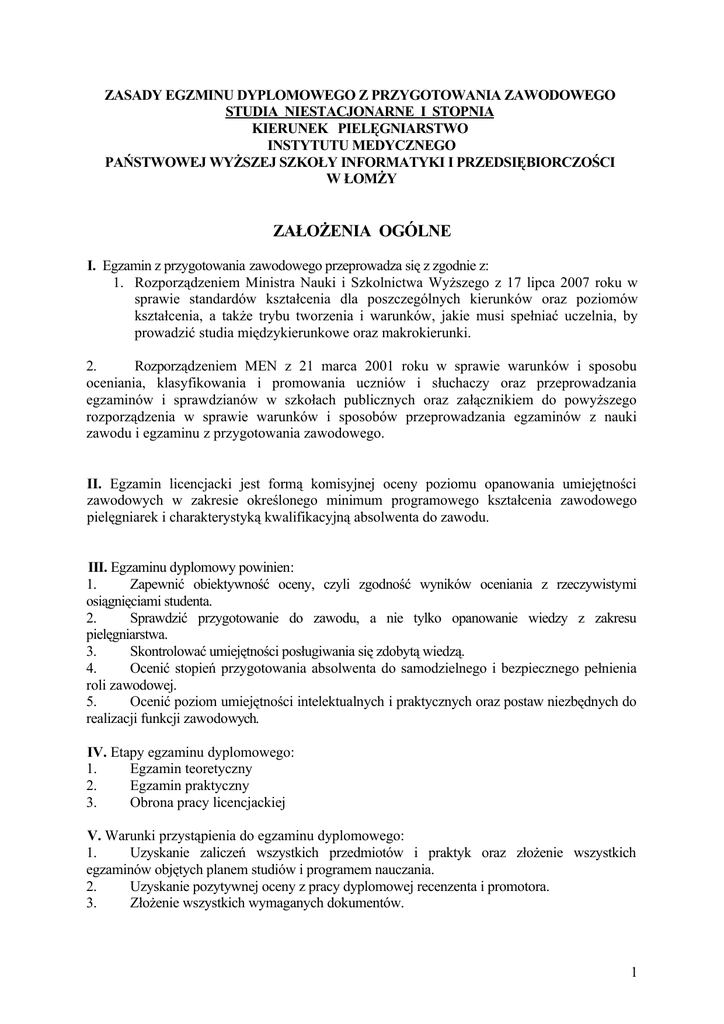 ZASADY EGZMINU DYPLOMOWEGO Z PRZYGOTOWANIA ZAWODOWEGO STUDIA NIESTACJONARNE I STOPNIA KIERUNEK PIELĘGNIARSTWO INSTYTUTU MEDYCZNEGO PAŃSTWOWEJ WYŻSZEJ SZKOŁY INFORMATYKI I PRZEDSIĘBIORCZOŚCI W ŁOMŻY ZAŁOŻENIA OGÓLNE I. Egzamin z przygotowania zawodowego przeprowadza się z zgodnie z: 1. Rozporządzeniem Ministra Nauki i Szkolnictwa Wyższego z 17 lipca 2007 roku w sprawie standardów kształcenia dla poszczególnych kierunków oraz poziomów kształcenia, a także trybu tworzenia i warunków, jakie musi spełniać uczelnia, by prowadzić studia międzykierunkowe oraz makrokierunki. 2. Rozporządzeniem MEN z 21 marca 2001 roku w sprawie warunków i sposobu oceniania, klasyfikowania i promowania uczniów i słuchaczy oraz przeprowadzania egzaminów i sprawdzianów w szkołach publicznych oraz załącznikiem do powyższego rozporządzenia w sprawie warunków i sposobów przeprowadzania egzaminów z nauki zawodu i egzaminu z przygotowania zawodowego. II. Egzamin licencjacki jest formą komisyjnej oceny poziomu opanowania umiejętności zawodowych w zakresie określonego minimum programowego kształcenia zawodowego pielęgniarek i charakterystyką kwalifikacyjną absolwenta do zawodu. III. Egzaminu dyplomowy powinien: 1. Zapewnić obiektywność oceny, czyli zgodność wyników oceniania z rzeczywistymi osiągnięciami studenta. 2. Sprawdzić przygotowanie do zawodu, a nie tylko opanowanie wiedzy z zakresu pielęgniarstwa. 3. Skontrolować umiejętności posługiwania się zdobytą wiedzą. 4. Ocenić stopień przygotowania absolwenta do samodzielnego i bezpiecznego pełnienia roli zawodowej. 5. Ocenić poziom umiejętności intelektualnych i praktycznych oraz postaw niezbędnych do realizacji funkcji zawodowych. IV. Etapy egzaminu dyplomowego: 1. Egzamin teoretyczny 2. Egzamin praktyczny 3. Obrona pracy licencjackiej V. Warunki przystąpienia do egzaminu dyplomowego: 1. Uzyskanie zaliczeń wszystkich przedmiotów i praktyk oraz złożenie wszystkich egzaminów objętych planem studiów i programem nauczania. 2. Uzyskanie pozytywnej oceny z pracy dyplomowej recenzenta i promotora. 3. Złożenie wszystkich wymaganych dokumentów. 1 VI. Warunkiem przystąpienia do egzaminu praktycznego jest zdanie egzaminu teoretycznego. VII. Warunkiem przystąpienia do obrony pracy licencjackiej jest zdanie egzaminu teoretycznego i praktycznego. VIII. Za organizację i przebieg egzaminu dyplomowego odpowiedzialny jest Dyrektor Instytutu Medycznego PWSIiP w Łomży lub wyznaczony przez niego Zastępca, który: 1. Przedstawia studentom wykaz promotorów prac licencjackich. 2. Powołuje komisje egzaminacyjne. 3. Zatwierdza wykaz jednostek opieki zdrowotnej do przeprowadzania egzaminu praktycznego. 4. Ustala harmonogram przebiegu egzamin. IX. W przypadku uzyskania z egzaminu licencjackiego oceny niedostatecznej lub nieusprawiedliwionego nieprzystąpienia do tego egzaminu w terminie ustalonym przez Dyrektora lub wyznaczonego przez niego Zastępcę Instytutu Medycznego PWSIiP w Łomży, wyznacza drugi termin egzaminu, jako ostateczny. ORGANIZACJA I PRZEBIEG EGZAMINU TEORETYCZNEGO I. Część teoretyczna egzaminu dyplomowego poprzedza część praktyczną egzaminu i obronę pracy dyplomowej. II. Część teoretyczna egzaminu dyplomowego polega na udzieleniu przez studenta odpowiedzi na 30 pytań testowych obejmujących treści nauczania w zakresie podstaw pielęgniarstwa oraz pielęgniarstw: internistycznego, chirurgicznego, pediatrycznego. III.Student za każde pytanie może otrzymać 1 punkt, maksymalnie 30 pkt. z całego testu. IV. Do zaliczenia testu wymagane jest uzyskanie co najmniej 17 punktów. ORGANIZACJA I PRZEBIEG EGZAMINU PRAKTYCZNEGO I. Egzamin przeprowadzają komisje, powołane przez Dyrektora lub wyznaczonego przez niego Zastępcę Dyrektora Instytutu Medycznego PWSIiP w Łomży, składające się z; 1. przewodniczącego 2. członków komisji – na każdym wytypowanym oddziale, z co najmniej trzech nauczycieli akademickich prowadzących zajęcia ze studentami na studiach licencjackich kierunek pielęgniarstwo, posiadających kierunkowe wykształcenie zawodowe i stopień naukowy co najmniej magister. II. W pracach komisji egzaminacyjnej, w charakterze obserwatora, mogą brać udział przedstawiciele Samorządu Pielęgniarek i Położnych, Polskiego Towarzystwa Pielęgniarskiego oraz opiekun roku. III. W skład komisji mogą wchodzić przedstawiciele zakładu opieki zdrowotnej, w którym odbywa się egzamin dyplomowy – pielęgniarki oddziałowe, naczelne. 2 IV. W części praktycznej egzaminu może pracować równolegle kilka komisji oceniających. V. Przewodniczącego komisji oraz jej członków powołuje Dyrektor lub wyznaczony przez niego Zastępca. VI. Przewodniczący komisji: Zatwierdza zadania egzaminacyjne do części praktycznej i teoretycznej. Czuwa nad prawidłowym przebiegiem egzaminu. Rozstrzyga kwestie sporne powstałe w czasie egzaminu. Ogłasza wyniki egzaminu. VII. Egzaminatorzy: Przygotowują zadania egzaminacyjne do części praktycznej i teoretycznej. Oceniają wykonywanie zadań egzaminacyjnych oraz zasób wiadomości i umiejętności zdającego posługując się ustalonymi kryteriami oceniania zatwierdzonymi przez Senat PWSIP w Łomży VIII. Na 2-3 dni przed planowanym egzaminem praktycznym odbywa się losowanie miejsca przeprowadzenia egzaminu. 1. Miejscem egzaminu są oddziały wewnętrzne, chirurgiczne i pediatryczne. 2. Kartki do losowania oddziału przygotowuje i przechowuje przewodniczący komisji egzaminacyjnej. 3. Na kartce do losowania znajdują się informacje, w jakim oddziale losujący będzie zdawał egzamin, data egzaminu, godzina rozpoczęcia i zakończenia egzaminu. 4. Kartki są oznakowane pieczątką Instytutu Medycznego PWSIP w Łomży. 5. Liczba kartek musi odpowiadać liczbie zdających. 6. Kartki do dnia losowania przechowywane są w sejfie. IX. Egzamin praktyczny przeprowadzany jest zgodnie z postanowieniem Kolegium Dziekanów wydziałów kształc