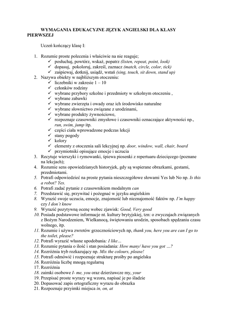 WYMAGANIA EDUKACYJNE JĘZYK ANGIELSKI DLA KLASY PIERWSZEJ Uczeń kończący klasę I: 1. Rozumie proste polecenia i właściwie na nie reaguje; posłuchaj, powtórz, wskaż, popatrz (listen, repeat, point, look) dopasuj, pokoloruj, zakreśl, zaznacz (match, circle, color, tick) zaśpiewaj, dotknij, usiądź, wstań (sing, touch, sit down, stand up) 2. Nazywa obiekty w najbliższym otoczeniu: liczebniki w zakresie 1 – 10 członków rodziny wybrane przybory szkolne i przedmioty w szkolnym otoczeniu , wybrane zabawki wybrane zwierzęta i owady oraz ich środowisko naturalne wybrane słownictwo związane z urodzinami, wybrane produkty żywnościowe, rozpoznaje czasowniki zmysłowe i czasowniki oznaczające aktywności np., run, swim, jump itp. części ciała wprowadzone podczas lekcji stany pogody kolory elementy z otoczenia sali lekcyjnej np. door, window, wall, chair, board przymiotniki opisujące emocje i uczucia 3. Recytuje wierszyki i rymowanki, śpiewa piosenki z repertuaru dziecięcego (poznane na lekcjach); 4. Rozumie sens opowiedzianych historyjek, gdy są wspierane obrazkami, gestami, przedmiotami. 5. Potrafi odpowiedzieć na proste pytania nieszczegółowe słowami Yes lub No np. Is this a robot? Yes. 6. Potrafi zadać pytanie z czasownikiem modalnym can 7. Przedstawić się, przywitać i pożegnać w języku angielskim 8. Wyrazić swoje uczucia, emocje, znajomość lub nieznajomość faktów np. I’m happy czy I don’t know 9. Wyrazić pozytywną ocenę wobec zjawisk: Good, Very good 10. Posiada podstawowe informacje nt. kultury brytyjskiej, tzn: o zwyczajach związanych z Bożym Narodzeniem, Wielkanocą, świętowaniu urodzin, sposobach spędzaniu czasu wolnego, itp. 11. Rozumie i używa zwrotów grzecznościowych np, thank you, here you are can I go to the toilet, please? 12. Potrafi wyrazić własne upodobania: I like… 13. Rozumie pytania o ilość i stan posiadania: How many/ have you got …? 14. Rozróżnia tryb rozkazujący np. Mix the colours, please! 15. Potrafi odmówić i rozpoznaje strukturę prośby po angielsku 16. Rozróżnia liczbę mnogą regularną 17. Rozróżnia 18. zaimki osobowe I- me, you oraz dzierżawcze my, your 19. Przepisać proste wyrazy wg wzoru, napisać je po śladzie 20. Dopasować zapis ortograficzny wyrazu do obrazka 21. Rozpoznaje przyimki miejsca in, on, at 22. Potrafi ułożyć wyrazy lub obrazki z historyjki we właściwej kolejności – ze słuchu 23. Potrafi powtórzyć za nagraniem lub nauczycielem pojedyncze wyrazy lub proste zwroty np. clap your hands, hello I’m, let’s play, It’s windy KRYTERIA OCENIANIA UCZNIÓW KLASY PIERWSZEJ W ROKU SZKOLNYM 2011/2012 Poziom umiejętności Wysoki (celujący) Bardzo dobry Dobry Zadawalający Dopuszczający Niewystarczający Rodzaj obrazka (stempla) WSPANIALE BARDZO DOBRZE ŁADNIE POSTARAJ SIĘ POMYŚŁ PRACUJ WIĘCEJ Zapis w dzienniku 6 5 4 3 2 1 Na ocenę celującą: Uczeń wykazuje dużą aktywność podczas lekcji Uczeń posiada wiadomości wykraczające poza określony program nauczania Uczestniczy w konkursach językowych, samodzielnie rozwija swoje zainteresowania językowe korzystając z różnych źródeł Wszystkie testy jest w stanie napisać na ocenę bardzo dobrą lub celującą Jest zawsze przygotowany do zajęć, odrabia prace domowe, posiada bardzo dobrze prowadzony zeszyt Na ocenę bardzo dobrą: Uczeń aktywnie i chętnie uczestniczy w lekcjach Bardzo dobrze opanował piosenki i rymowanki wprowadzane na lekcji Potrafi posługiwać się słownictwem czynnym i biernym wprowadzanym podczas lekcji Rozpoznaje i reaguje odpowiednio na proste polecenia nauczyciela Potrafi samodzielnie powtórzyć za nauczycielem lub nagraniem wyrazy lub proste zwroty wprowadzane podczas lekcji w historyjkach i rymowankach Potrafi samodzielnie przedstawić się, przywitać i pożegnać w języku angielskim Wszystkie testy jest w stanie napisać na ocenę bardzo dobrą Jest zawsze przygotowany do zajęć, odrabia prace domowe, posiada bardzo dobrze prowadzony zeszyt Na ocenę dobrą: Uczeń aktywnie i chętnie uczestniczy w lekcjach, choć nie zawsze udaje mu się poprawnie odpowiedzieć na zadawane pytania Zna piosenki i rymowanki poznawane podczas lekcji Potrafi posługiwać się słownictwem czynnym i biernym wprowadzanym podczas lekcji popełniając niekiedy drobne błędy Rozpoznaje proste polecenia nauczyciela Na ogół jest przygotowany do zajęć, odrabia prace domowe, choć czasem zdarza mu się zapomnieć zeszytu, podręczników lub nie odrobić pracy domowej Potrafi powtórzyć za nauczycielem choć potrzebuje do tego stymulacji i popełnia drobne błędy Na ocenę dostateczną: Rozumie proste polecenia nauczyciela Potrafi posługiwać się tylko biernie słownictwem popełniając przy tym, błędy Potrafi z pomocą nauczyciela wykonać zadania podczas lekcji Z pomocą nauczyciela powtarza tylko pojedyncze wyrazy – mowa nie zawsze jest wyraźna Bywa nieprzygotowany do lekcji Na ocenę dopuszczającą; Rozumie polecenia nauczyciela ale nie potrafi na nie zareagować Nie potrafi powtórzyć za nauczycielem ani nagraniem Nie potrafi bez pomocy nauczyciela przywołać piosenek i rymowanek oraz słownictwa poznanego na lekcji Często nie jest przygotowany do lekcji Nie potrafi napisać pojedynczego wyrazu według wzoru