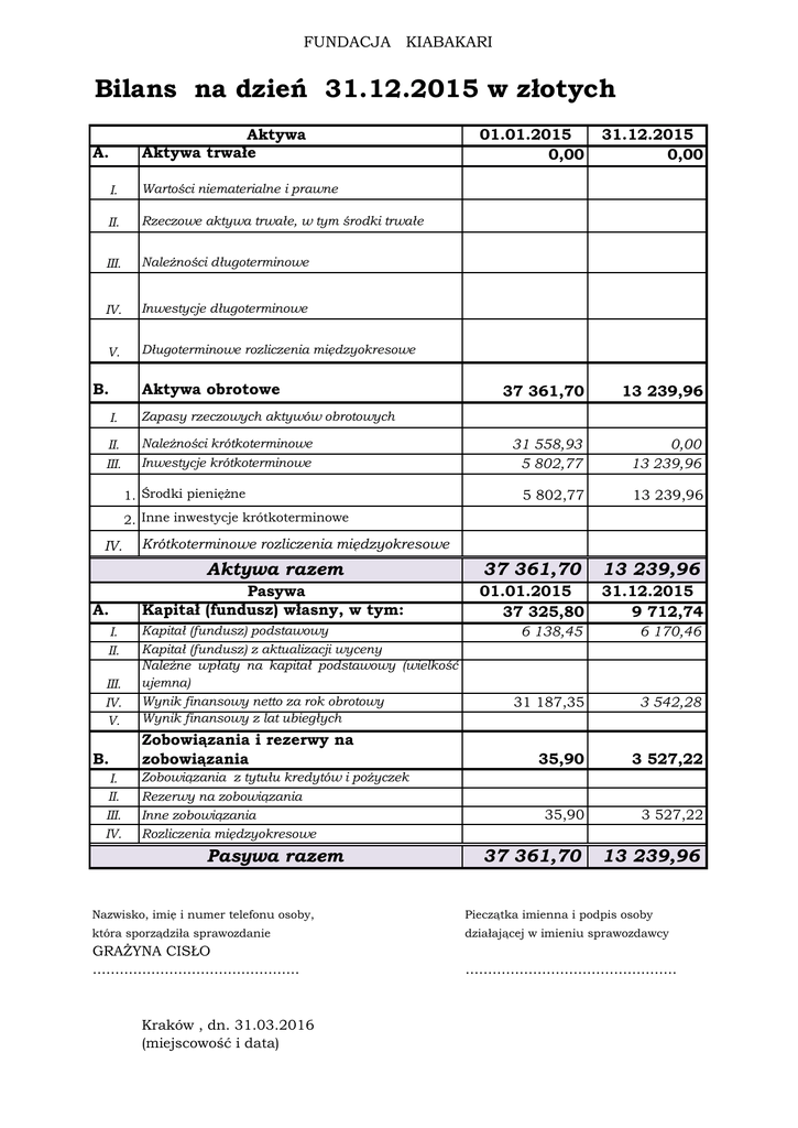 FUNDACJA KIABAKARI Bilans na dzień 31.12.2015 w złotych Aktywa Aktywa trwałe A. 01.01.2015 0,00 31.12.2015 0,00 37 361,70 13 239,96 31 558,93 5 802,77 0,00 13 239,96 5 802,77 13 239,96 Aktywa razem 37 361,70 13 239,96 Pasywa Kapitał (fundusz) własny, w tym: 01.01.2015 37 325,80 31.12.2015 9 712,74 6 138,45 6 170,46 31 187,35 3 542,28 35,90 3 527,22 35,90 3 527,22 37 361,70 13 239,96 I. Wartości niematerialne i prawne II. Rzeczowe aktywa trwałe, w tym środki trwałe III. Należności długoterminowe IV. Inwestycje długoterminowe V. Długoterminowe rozliczenia międzyokresowe B. Aktywa obrotowe I. Zapasy rzeczowych aktywów obrotowych II. Należności krótkoterminowe III. Inwestycje krótkoterminowe 1. Środki pieniężne 2. Inne inwestycje krótkoterminowe IV. A. I. II. III. IV. V. B. I. II. III. IV. Krótkoterminowe rozliczenia międzyokresowe Kapitał (fundusz) podstawowy Kapitał (fundusz) z aktualizacji wyceny Należne wpłaty na kapitał podstawowy (wielkość ujemna) Wynik finansowy netto za rok obrotowy Wynik finansowy z lat ubiegłych Zobowiązania i rezerwy na zobowiązania Zobowiązania z tytułu kredytów i pożyczek Rezerwy na zobowiązania Inne zobowiązania Rozliczenia międzyokresowe Pasywa razem Nazwisko, imię i numer telefonu osoby, Pieczątka imienna i podpis osoby która sporządziła sprawozdanie działającej w imieniu sprawozdawcy GRAŻYNA CISŁO .............................................. ............................................... Kraków , dn. 31.03.2016 (miejscowość i data) FUNDACJA KIABAKARI RACHUNEK ZYSKÓW I STRAT ZA OKRES 01.01.2015-31.12.2015 (w zł i gr) WYSZCZEGÓLNIENIE Przychody z podstawowej działalności operacyjnej i zrównane z nimi, w tym zmiana stanu produktów (zwiększenie - wartość dodatnia, zmniejszenie - wartość ujemna) A. 31.12.2014 31.12.2015 92 319,06 189 857,43 92 319,06 189 857,43 92 319,06 189 857,43 Koszty podstawowej działalności operacyjnej 60 564,04 188 127,98 Koszty działalności pożytku publicznego 60 564,04 188 127,98 60 564,04 188 127,98 b) Zużycie materiałów i energii 10 764,10 96 095,07 c) Wynagrodzenia oraz ubezpieczenia społeczne i inne świadczenia d) Pozostałe koszty 49 799,94 17 808,94 74 223,97 0,00 0,00 9,15 2 355,39 576,82 542,56 I. Przychody z działalności pożytku publicznego i zrównane z nimi: 1 Przychody z nieodpłatnej działalności pożytku publicznego Przychody z odpłatnej działalności pożytku publicznego, w tym zmiana stanu produktów ( zwiększenie - wartość dodatnia, 2 zmniejszenie - wartość ujemna) B. I 1. Koszty nieodpłatnej działalności pożytku publicznego a) Amortyzacja 2. Koszty odpłatnej działalności pożytku publicznego a) Amortyzacja b) Zużycie materiałów i energii c) Wynagrodzenia oraz ubezpieczenia społeczne i inne świadczenia d) Pozostałe koszty C. Pozostałe przychody i zyski, w tym aktualizacja wartości aktywów D. Pozostałe koszty i straty, w tym aktualizacja wartości aktywów E. Wynik finansowy netto ogółem 31 187,35 3 542,28 Nadwyżka przychodów nad kosztami (wartość dodatnia) 31 187,35 3 542,28 0,00 0,00 I. Nadwyżka kosztami nad przychodami (wartość II. ujemna) Nazwisko, imię i numer telefonu osoby, która sporządziła sprawozdanie GRAŻYNA CISŁO .................................................................. Pieczątka imienna i podpis osoby działającej w imieniu sprawozdawcy ..................................................... Kraków , dn. 31.03.2016 (miejscowość i data)
