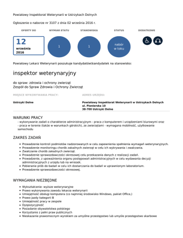 Powiatowy Inspektorat Weterynarii w Ustrzykach Dolnych Ogłoszenie o naborze nr 3107 z dnia 02 września 2016 r. OFERTY DO WYMIAR ETATU STANOWISKA STATUS 1 1 nabór w toku 12 września 2016 DODATKOWE Powiatowy Lekarz Weterynarii poszukuje kandydatów\kandydatek na stanowisko: inspektor weterynaryjny do spraw: zdrowia i ochrony zwierząt Zespół do Spraw Zdrowia i Ochrony Zwierząt MIEJSCE WYKONYWANIA PRACY: ADRES URZĘDU: Ustrzyki Dolne Powiatowy Inspektorat Weterynarii w Ustrzykach Dolnych ul. Pionierska 10 38-700 Ustrzyki Dolne WARUNKI PRACY - wykonywanie zadań o charakterze administracyjnym - praca z komputerem i urządzeniami biurowymi oraz - praca w terenie (także w warunkach górskich), ze zwierzętami - wymagana mobilność, użytkowanie samochodu ZAKRES ZADAŃ Prowadzenie kontroli podmiotów nadzorowanych w celu zapewnienia spełnienia wymagań weterynaryjnych. Prowadzenie monitoringu chorób zakaźnych zwierząt w celu ich wykrywania i zwalczania. Zwalczanie chorób zakaźnych zwierząt. Prowadzenie sprawozdawczości okresowej celu przekazania danych z realizacji zadań. Prowadzenie, z upoważnienia organu postępowań administracyjnych w celu wydawania decyzji administracyjnych z urzędu lub na wniosek. Pobieranie prób do badań w celu ich dostarczania do badań w uprawnionym laboratorium. Prowadzenie sprawozdawczości okresowej. WYMAGANIA NIEZBĘDNE Wykształcenie: wyższe weterynaryjne Prawo wykonywania zawodu lekarza weterynarii Umiejętność obsługi komputera (co najmniej środowisko Windows, pakiet Office,) Prawo jazdy kategorii B Umiejętność pracy w zespole Dyspozycyjność Posiadanie obywatelstwa polskiego Korzystanie z pełni praw publicznych Nieskazanie prawomocnym wyrokiem za umyślne przestępstwo lub umyśle przestępstwo skarbowe WYMAGANIA DODATKOWE staż pracy: 1 rok w obszarze zdrowia i ochrony zwierząt Znajomość przepisów dotyczących Inspekcji Weterynaryjnej oraz zdrowia i ochrony zwierząt DOKUMENTY I OŚWIADCZENIA NIEZBĘDNE Życiorys/CV i list motywacyjny Kopie dokumentów potwierdzających spełnienie wymagania niezbędnego w zakresie wykształcenia Kopia zaświadczenia o posiadaniu prawa wykonywania zawodu lekarza weterynarii Oświadczenie o posiadaniu obywatelstwa polskiego albo kopia dokumentu potwierdzającego posiadanie polskiego obywatelstwa Oświadczenie o wyrażeniu zgody na przetwarzanie danych osobowych do celów naboru Oświadczenie o korzystaniu z pełni praw publicznych Oświadczenie o nieskazaniu prawomocnym wyrokiem za umyślne przestępstwo lub umyślne przestępstwo skarbowe DOKUMENTY I OŚWIADCZENIA DODATKOWE kopia dokumentu potwierdzającego niepełnosprawność - w przypadku kandydatek/kandydatów, zamierzających skorzystać z pierwszeństwa w zatrudnieniu w przypadku, gdy znajdą się w gronie najlepszych kandydatek/kandydatów Kopie dokumentów potwierdzających spełnienie wymagania dodatkowego w zakresie doświadczenia zawodowego / stażu pracy TERMINY I MIEJSCE SKŁADANIA DOKUMENTÓW Dokumenty należy złożyć do: 12 września 2016 r. Decyduje data: wpływu oferty do urzędu Miejsce składania dokumentów: Powiatowy Inspektorat Weterynarii w Ustrzykach Dolnych ul. Pionierska 10 38-700 Ustrzyki Dolne INNE INFORMACJE: W miesiącu poprzedzającym datę upublicznienia ogłoszenia wskaźnik zatrudnienia osób niepełnosprawnych w urzędzie, w rozumieniu przepisów o rehabilitacji zawodowej i społecznej oraz zatrudnianiu osób niepełnosprawnych, nie wynosi co najmniej 6%. Szczegółowe informacje można uzyskać pod nr tel. 13 461 13 16 / 694 455 736 Legenda Pierwszeństwo dla osób z niepełnosprawnościami Ogłoszenie z tym symbolem oznacza, że pierwszeństwo w zatrudnieniu mają osoby z niepełnosprawnościami, które spełniają wszystkie następujące warunki: • złożyły w terminie ofertę wraz z dokumentem potwierdzającym niepełnosprawność, • spełniają warunki wymienione w ogłoszeniu, • po rekrutacji znalazły się w gronie najlepszych kandydatów. Zastępstwo Ogłoszenie z tym symbolem oznacza, że urząd poszukuje kandydatów do pracy na czas przewidywanej nieobecności swojego pracownika. Jeśli w ogłoszeniu nie wskazano okresu zastępstwa, możesz o to spytać w urzędzie. Osoba zatrudniona na zastępstwo jest członkiem korpusu służby cywilnej. Nabór otwarty dla cudzoziemców Ogłoszenie z tym symbolem oznacza, że o stanowisko mogą starać się, poza polskimi obywatelami, również cudzoziemcy. Kandydaci muszą spełniać następujące warunki: • są obywatelami państwa Unii Europejskiej lub innego państwa, którego obywatelom na podstawie umów międzynarodowych lub przepisów prawa wspólnotowego przysługuje prawo podjęcia zatrudnienia na terytorium Polski, • ich znajomość języka polskiego jest potwierdzona jednym z dokumentów wskazanych w rozporządzeniu w sprawie rodzajów dokumentów potwierdzających znajomość języka polskiego przez osoby nieposiadające obywatelstwa polskiego, ubiegające się o zatrudnienie w służbie cywilnej.