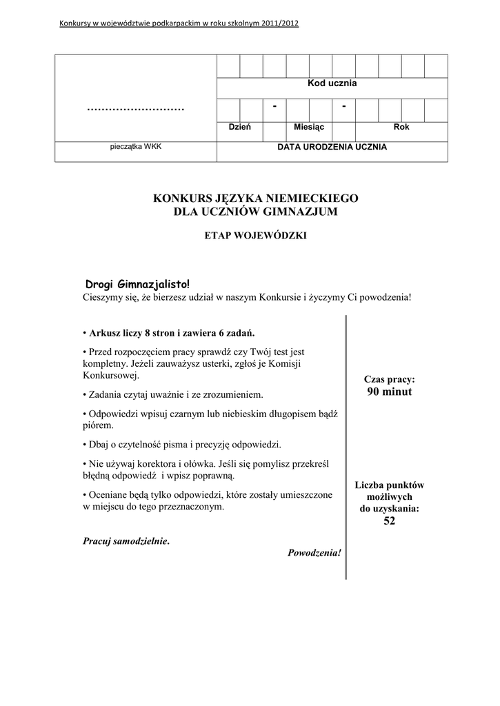 KONKURS JĘZYKA NIEMIECKIEGO DLA UCZNIÓW GIMNAZJUM