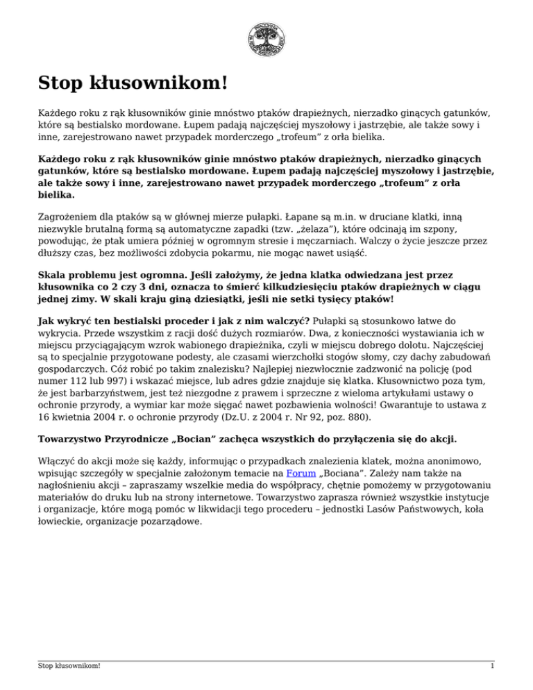 Stop kłusownikom! Każdego roku z rąk kłusowników ginie mnóstwo ptaków drapieżnych, nierzadko ginących gatunków, które są bestialsko mordowane. Łupem padają najczęściej myszołowy i jastrzębie, ale także sowy i inne, zarejestrowano nawet przypadek morderczego „trofeum” z orła bielika. Każdego roku z rąk kłusowników ginie mnóstwo ptaków drapieżnych, nierzadko ginących gatunków, które są bestialsko mordowane. Łupem padają najczęściej myszołowy i jastrzębie, ale także sowy i inne, zarejestrowano nawet przypadek morderczego „trofeum” z orła bielika. Zagrożeniem dla ptaków są w głównej mierze pułapki. Łapane są m.in. w druciane klatki, inną niezwykle brutalną formą są automatyczne zapadki (tzw. „żelaza”), które odcinają im szpony, powodując, że ptak umiera później w ogromnym stresie i męczarniach. Walczy o życie jeszcze przez dłuższy czas, bez możliwości zdobycia pokarmu, nie mogąc nawet usiąść. Skala problemu jest ogromna. Jeśli założymy, że jedna klatka odwiedzana jest przez kłusownika co 2 czy 3 dni, oznacza to śmierć kilkudziesięciu ptaków drapieżnych w ciągu jednej zimy. W skali kraju giną dziesiątki, jeśli nie setki tysięcy ptaków! Jak wykryć ten bestialski proceder i jak z nim walczyć? Pułapki są stosunkowo łatwe do wykrycia. Przede wszystkim z racji dość dużych rozmiarów. Dwa, z konieczności wystawiania ich w miejscu przyciągającym wzrok wabionego drapieżnika, czyli w miejscu dobrego dolotu. Najczęściej są to specjalnie przygotowane podesty, ale czasami wierzchołki stogów słomy, czy dachy zabudowań gospodarczych. Cóż robić po takim znalezisku? Najlepiej niezwłocznie zadzwonić na policję (pod numer 112 lub 997) i wskazać miejsce, lub adres gdzie znajduje się klatka. Kłusownictwo poza tym, że jest barbarzyństwem, jest też niezgodne z prawem i sprzeczne z wieloma artykułami ustawy o ochronie przyrody, a wymiar kar może sięgać nawet pozbawienia wolności! Gwarantuje to ustawa z 16 kwietnia 2004 r. o ochronie przyrody (Dz.U. z 2004 r. Nr 92, poz. 880). Towarzystwo Przyrodnicze „Bocian” zachęca wszystkich do przyłączenia się do akcji. Włączyć do akcji może się każdy, informując o przypadkach znalezienia klatek, można anonimowo, wpisując szczegóły w specjalnie założonym temacie na Forum „Bociana”. Zależy nam także na nagłośnieniu akcji – zapraszamy wszelkie media do współpracy, chętnie pomożemy w przygotowaniu materiałów do druku lub na strony internetowe. Towarzystwo zaprasza również wszystkie instytucje i organizacje, które mogą pomóc w likwidacji tego procederu – jednostki Lasów Państwowych, koła łowieckie, organizacje pozarządowe. Stop kłusownikom! 1