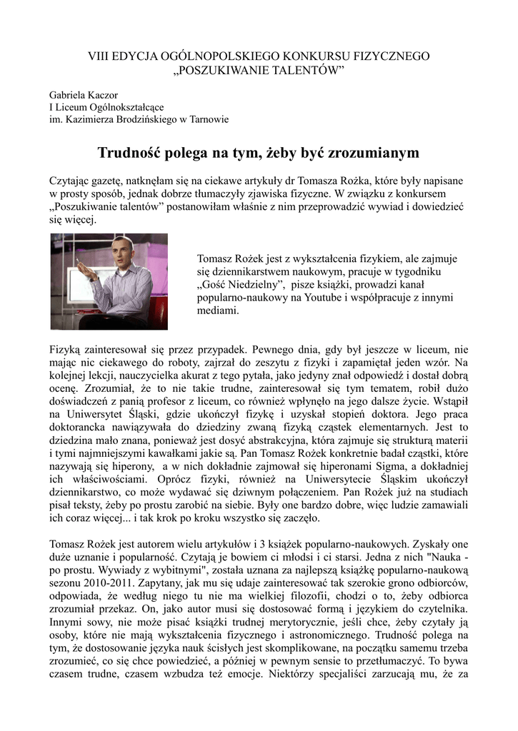 VIII EDYCJA OGÓLNOPOLSKIEGO KONKURSU FIZYCZNEGO „POSZUKIWANIE TALENTÓW” Gabriela Kaczor I Liceum Ogólnokształcące im. Kazimierza Brodzińskiego w Tarnowie Trudność polega na tym, żeby być zrozumianym Czytając gazetę, natknęłam się na ciekawe artykuły dr Tomasza Rożka, które były napisane w prosty sposób, jednak dobrze tłumaczyły zjawiska fizyczne. W związku z konkursem „Poszukiwanie talentów” postanowiłam właśnie z nim przeprowadzić wywiad i dowiedzieć się więcej. Tomasz Rożek jest z wykształcenia fizykiem, ale zajmuje się dziennikarstwem naukowym, pracuje w tygodniku „Gość Niedzielny”, pisze książki, prowadzi kanał popularno-naukowy na Youtube i współpracuje z innymi mediami. Fizyką zainteresował się przez przypadek. Pewnego dnia, gdy był jeszcze w liceum, nie mając nic ciekawego do roboty, zajrzał do zeszytu z fizyki i zapamiętał jeden wzór. Na kolejnej lekcji, nauczycielka akurat z tego pytała, jako jedyny znał odpowiedź i dostał dobrą ocenę. Zrozumiał, że to nie takie trudne, zainteresował się tym tematem, robił dużo doświadczeń z panią profesor z liceum, co również wpłynęło na jego dalsze życie. Wstąpił na Uniwersytet Śląski, gdzie ukończył fizykę i uzyskał stopień doktora. Jego praca doktorancka nawiązywała do dziedziny zwaną fizyką cząstek elementarnych. Jest to dziedzina mało znana, ponieważ jest dosyć abstrakcyjna, która zajmuje się strukturą materii i tymi najmniejszymi kawałkami jakie są. Pan Tomasz Rożek konkretnie badał cząstki, które nazywają się hiperony, a w nich dokładnie zajmował się hiperonami Sigma, a dokładniej ich właściwościami. Oprócz fizyki, również na Uniwersytecie Śląskim ukończył dziennikarstwo, co może wydawać się dziwnym połączeniem. Pan Rożek już na studiach pisał teksty, żeby po prostu zarobić na siebie. Były one bardzo dobre, więc ludzie zamawiali ich coraz więcej... i tak krok po kroku wszystko się zaczęło. Tomasz Rożek jest autorem wielu artykułów i 3 książek popularno-naukowych. Zyskały one duże uznanie i popularność. Czytają je bowiem ci młodsi i ci starsi. Jedna z nich "Nauka po prostu. Wywiady z wybitnymi", została uznana za najlepszą książkę popularno-naukową sezonu 2010-2011. Zapytany, jak mu się udaje zainteresować tak szerokie grono odbiorców, odpowiada, że według niego tu nie ma wielkiej filozofii, chodzi o to, żeby odbiorca zrozumiał przekaz. On, jako autor musi się dostosować formą i językiem do czytelnika. Innymi sowy, nie może pisać książki trudnej merytorycznie, jeśli chce, żeby czytały ją osoby, które nie mają wykształcenia fizycznego i astronomicznego. Trudność polega na tym, że dostosowanie języka nauk ścisłych jest skomplikowane, na początku samemu trzeba zrozumieć, co się chce powiedzieć, a później w pewnym sensie to przetłumaczyć. To bywa czasem trudne, czasem wzbudza też emocje. Niektórzy specjaliści zarzucają mu, że za bardzo spłyca, ale pan Tomasz Rożek się z nimi nie zgadza, ponieważ uważa, że podstawową zasadą jest to, żeby być zrozumianym. Pan Rożek podczas wywiadu udzielił również na pytanie dotyczące szkolnictwa i problemu niechęci uczniów do fizyki. Uważa bowiem, że to nie jest jeden problem, to jest wiele rzeczy, które się na siebie nakładają. Bardzo często zdarza się tak, że uczeń już w szkole podstawowej nie lubi fizyki, pomimo tego, że tego przedmiotu jeszcze nie ma, bo gdzieś usłyszał, że jest trudna. A to że coś może być trudne, nie oznacza, że nie jest ciekawe. Bardzo często zdarza się tak, że uczeń nie uczy się fizyki, bo jest trudna, ale jednocześnie uprawia jakiś sport, bo tej trudności tutaj nie zauważa. Po pierwsze jest to negatywne nastawienie, drugą rzeczą jest to, że program szkoły nie jest perfekcyjnie stworzony, jest optymalnie stworzony. Za mały nacisk kładzie się na to, że nauki ścisłe to nie są nauki oderwane od rzeczywistości, że to są nauki które o niej mówią, nie ukazuje się praktycznych aspektów tego o czym dzieci się uczą. Za mało robi się eksperymentów, żeby pokazać, że nie mówi się o abstrakcji, można wykonać dużo ciekawych doświadczeń o ciśnieniu, temperaturze, ale są one niestety pomijane. Trzeci problem to jest kwestia nauczycieli, którzy w jakiejś części są osobami niekompetentnymi. Taka osoba będzie w stanie przeprowadzić lekcje, ale będzie ona nieciekawa, nie będzie oparta na interakcji z uczniem, ponieważ czasem nauczyciele sami nie znają odpowiedzi i boją się do tego przyznać. Pan Rożek w książce „Kosmos” i poprzednich książkach wielokrotnie używał stwierdzenia, że czegoś nie wie i nie uważa, że to jest coś złego. Naukowcy nie wiedzą wielu rzeczy, bo gdyby wiedzieli wszystko, to nie byłoby sensu uprawiać nauki. Prowadzenie vloga, pisanie artykułów do gazet, koordynowanie „Stowarzyszenia Śląska Kawiarnia” to tylko niektóre z zajęć pana Rożka. Zadziwiające jest to, że potrafi on to wszystko pogodzić. Stara się tan czas całkowicie racjonalizować, jednak nie zawsze to wychodzi. Przyznaje, że zajmuje się wieloma rzeczami, ale jak się udaje mu to połączyćsam nie do końca wie. Wszystkie te działalności nie są od siebie rożne, to właściwie jest cały czas to samo, tylko robione innymi formami. I w kawiarni i w videoblogu chodzi o popularyzowanie nauki, nie ma wśród nich jednej jedynej, którą pan Rożek by faworyzował. Dużym osiągnięciem jest, kiedy praca jest również pasją. I tak jest w przypadku pana Rożka. Dzięki temu, nie potrzebuje on oddechu od pracy, wiele osób pracuje w miejscu, którego nie akceptują i żeby się odstresować potrzebują odskoczni, on tego nie potrzebuje. Owszem, czasem bywa zmęczony i odpocznie, ale nie zdarza się to często. Jednak nawet wykonując tak wiele zajęć znajduje czas na jego inne mniejsze hobby. Pan Ro