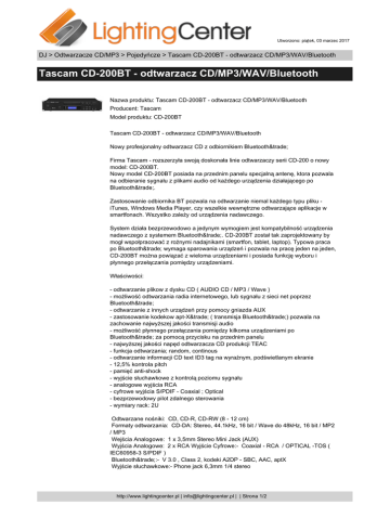Utworzono: piątek, 03 marzec 2017 DJ > Odtwarzacze CD/MP3 > Pojedyńcze > Tascam CD-200BT - odtwarzacz CD/MP3/WAV/Bluetooth Tascam CD-200BT - odtwarzacz CD/MP3/WAV/Bluetooth Nazwa produktu: Tascam CD-200BT - odtwarzacz CD/MP3/WAV/Bluetooth Producent: Tascam Model produktu: CD-200BT Tascam CD-200BT - odtwarzacz CD/MP3/WAV/Bluetooth Nowy profesjonalny odtwarzacz CD z odbiornikiem Bluetooth™ Firma Tascam - rozszerzyła swoją doskonała linie odtwarzaczy serii CD-200 o nowy model: CD-200BT. Nowy model CD-200BT posiada na przednim panelu specjalną antenę, ktora pozwala na odbieranie sygnału z plikami audio od każdego urządzenia działającego po Bluetooth™. Zastosowanie odbiornika BT pozwala na odtwarzanie niemal każdego typu pliku iTunes, Windows Media Player, czy wszelkie wewnętrzne odtwarzające aplikacje w smartfonach. Wszystko zależy od urządzenia nadawczego. System działa bezprzewodowo a jedynym wymogiem jest kompatybilność urządzenia nadawczego z systemem Bluetooth™. CD-200BT został tak zaprojektowany by mogł wspołpracować z rożnymi nadajnikami (smartfon, tablet, laptop). Typowa praca po Bluetooth™ wymaga sparowania urządzeń i pozwala na pracę jeden na jeden, CD-200BT można powiązać z wieloma urządzeniami i posiada funkcję wyboru i płynnego przełączania pomiędzy urządzeniami. Właściwości: - odtwarzanie plikow z dysku CD ( AUDIO CD / MP3 / Wave ) - możliwość odtwarzania radia internetowego, lub sygnału z sieci net poprzez Bluetooth™ - odtwarzanie z innych urządzeń przy pomocy gniazda AUX - zastosowanie kodekow apt-X™ ( transmisja Bluetooth™) pozwala na zachowanie najwyższej jakości transmisji audio - możliwość płynnego przełączania pomiędzy kilkoma urządzeniami po Bluetooth™ za pomocą przycisku na przednim panelu - najwyższej jakości napęd odtwarzacza CD produkcji TEAC - funkcja odtwarzania; random, continous - odtwarzanie informacji CD text ID3 tag na wyraźnym, podświetlanym ekranie - 12,5% kontrola pitch - pamięć anti-shock - wyjście słuchawkowe z kontrolą poziomu sygnału - analogowe wyjścia RCA - cyfrowe wyjścia S/PDIF - Coaxial ; Optical - bezprzewodowy pilot zdalnego sterowania - wymiary rack: 2U Odtwarzane nośniki: CD, CD-R, CD-RW (8 - 12 cm) Formaty odtwarzania: CD-DA: Stereo, 44.1kHz, 16 bit / Wave do 48kHz, 16 bit / MP2 / MP3 Wejścia Analogowe: 1 x 3,5mm Stereo Mini Jack (AUX) Wyjścia Analogowe: 2 x RCA Wyjście Cyfrowe:- Coaxial - RCA / OPTICAL -TOS ( IEC60958-3 S/PDIF ) Bluetooth™:- V 3.0 , Class 2, kodeki A2DP - SBC, AAC, aptX Wyjście słuchawkowe:- Phone jack 6,3mm 1/4 stereo http://www.lightingcenter.pl | [email protected] | | Strona 1/2 Utworzono: piątek, 03 marzec 2017 DJ > Odtwarzacze CD/MP3 > Pojedyńcze > Tascam CD-200BT - odtwarzacz CD/MP3/WAV/Bluetooth Tascam CD-200BT - odtwarzacz CD/MP3/WAV/Bluetooth Zasilanie:- 230V, ~50Hz- Waga:- 4,5kg Cena: 1801.00zł Cena promocyjna: 1699.00zł http://www.lightingcenter.pl | [email protected] | | Strona 2/2