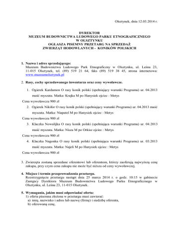 Olsztynek, dnia 12.03.2014 r. DYREKTOR MUZEUM BUDOWNICTWA LUDOWEGO PARKU ETNOGRAFICZNEGO W OLSZTYNKU OGŁASZA PISEMNY PRZETARG NA SPRZEDAŻ ZWIERZĄT HODOWLANYCH - KONIKÓW POLSKICH 1. Nazwa i adres sprzedającego: Muzeum Budownictwa Ludowego Park Etnograficzny w Olsztynku, ul. Leśna 23, 11-015 Olsztynek, tel. (89) 519 21 64, faks (89) 519 38 45, strona internetowa: www.muzeumolsztynek.pl 2. Rasy, cechy sprzedawanego inwentarza oraz ceny wywoławcze. 1. Ogierek Kardamon O rasy konik polski (spełniający warunki Programu) ur. 04.2013 maść myszata. Matka: Krajka M po Hanysiek ojciec : Metys Cena wywoławcza 900 zł 2. Ogierek Nikifor O rasy konik polski (spełniający warunki Programu) ur. 04.2013 maść myszata. Matka: Niapatel M po Hanysiek ojciec : Metys Cena wywoławcza 900 zł 3. Klaczka Nowalijka O rasy konik polski (spełniająca warunki Programu) ur. 04.2013 maść myszata. Matka: Nisza M po Orkisz ojciec : Metys Cena wywoławcza 900 zł 4. Klaczka Nagonka O rasy konik polski (spełniająca warunki Programu) ur. 03.2013 maść myszata. Matka: Najeli M po Hanysiek ojciec : Metys Cena wywoławcza 900 zł 3. Zwierzęta zostaną sprzedane oferentowi lub oferentom, którzy zaoferują najwyższą cenę zakupu, przy czym cena zakupu nie może być niższa od ceny wywoławczej. 4. Miejsce i termin przeprowadzenia przetargu. Rozstrzygnięcie przetargu nastąpi dnia 25 marca 2014 r. o godz. 10:15 w gabinecie Zastępcy Dyrektora Muzeum Budownictwa Ludowego Parku Etnograficznego w Olsztynku, ul. Leśna 23, 11-015 Olsztynek. 5. Wymagania, jakim musi odpowiadać oferta: 1) oferta pisemna złożona w przetargu musi zawierać: a) imię, nazwisko i adres lub nazwę (firmę) i siedzibę oferenta, b) oferowaną cenę, c) oświadczenie oferenta, że zapoznał się ze stanem sprzedawanego inwentarza lub ponosi odpowiedzialność za skutki wynikające z rezygnacji z oględzin, 2) sprzedający proponuje przygotować ofertę na formularzu, którego wzór dostępny jest w siedzibie sprzedającego lub na stronie internetowej www.muzeumolsztynek.pl, 6. Miejsce i termin, w którym można obejrzeć sprzedawany inwentarz. Zwierzęta można oglądać w dniach od 13.03.2014 r. – 24.03.2014 r. w godz. od 9:00 do 14:00 w siedzibie sprzedającego – 11-015 Olsztynek, ul. Leśna 23. Wskazane jest wcześniejsze uzgodnienie terminu i godziny przyjazdu pod numerem telefonu (89) 5191230. 7. Wysokość wadium oraz forma, termin i miejsce jego wniesienia: 1) warunkiem przystąpienia do przetargu jest wniesienie wadium w wysokości 10% od wysokości ceny wywoławczej zwierzęcia przewidzianego do kupna 2) wadium wnosi się wyłącznie w pieniądzu, 3) wadium złożone przez nabywcę zalicza się na poczet ceny, 4) wadium nie podlega zwrotowi w przypadku, gdy oferent, który wygrał przetarg, uchyli się od zawarcia umowy sprzedaży, 5) wadium należy wpłacić w kasie sprzedającego lub na rachunek bankowy 23 8823 0007 2001 0000 0491 000 1 w terminie do dnia 25.03.2014 r. do godz. 10:00. 8. Termin, miejsce i tryb złożenia oferty oraz okres, w którym oferta jest wiążąca: 1) oferty należy składać w terminie do dnia 25.03.2014 r. do godz. 10:00 w sekretariacie Muzeum Budownictwa Ludowego Parku Etnograficznego w Olsztynku, ul. Leśna 23, 2) wypełnioną i podpisaną ofertę należy złożyć w zamkniętej kopercie z dopiskiem „Oferta na kupno zwierząt hodowlanych”. 9. Sprzedającemu przysługuje prawo zamknięcia przetargu bez wybrania którejkolwiek z ofert, bez podania przyczyn. 10. Oferta będzie podlegała odrzuceniu, jeżeli: 1) zostanie złożona po wyznaczonym terminie, w niewłaściwym miejscu lub przez oferenta, który nie wniósł wadium, 2) zawiera dane niekompletne, nieczytelne lub nie zawiera podpisu. 11. Termin zawarcia umowy sprzedaży: w ciągu 7 dni licząc od upływu terminu składania ofert.