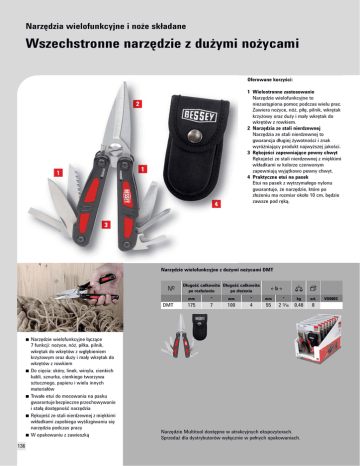 Narzędzia wielofunkcyjne i noże składane Wszechstronne narzędzie z dużymi nożycami Oferowane korzyści: 1 Wielostronne zastosowanie Narzędzie wielofunkcyjne to niezastąpiona pomoc podczas wielu prac. Zawiera nożyce, nóż, piłę, pilnik, wkrętak krzyżowy oraz duży i mały wkrętak do wkrętów z rowkiem. 2 Narzędzia ze stali nierdzewnej Narzędzia ze stali nierdzewnej to gwarancja długiej żywotności i znak wyróżniający produkt najwyższej jakości. 3 Rękojeści zapewniające pewny chwyt Rękojeści ze stali nierdzewnej z miękkimi wkładkami w kolorze czerwonym zapewniają wyjątkowo pewny chwyt. 4 Praktyczne etui na pasek Etui na pasek z wytrzymałego nylonu gwarantuje, że narzędzie, które po złożeniu ma rozmiar około 10 cm, będzie zawsze pod ręką. Narzędzie wielofunkcyjne z dużymi nożycami DMT Długość całkowita Długość całkowita po rozłożeniu po złożeniu DMT ■ ■ ■ ■ ■ 136 Narzędzie wielofunkcyjne łączące 7 funkcji: nożyce, nóż, piłka, pilnik, wkrętak do wkrętów z wgłębieniem krzyżowym oraz duży i mały wkrętak do wkrętów z rowkiem Do cięcia: skóry, linek, winylu, cienkich kabli, sznurka, cienkiego tworzywa sztucznego, papieru i wielu innych materiałów Trwałe etui do mocowania na pasku gwarantuje bezpieczne przechowywanie i stałą dostępność narzędzia Rękojeść ze stali nierdzewnej z miękkimi wkładkami zapobiega wyślizgiwaniu się narzędzia podczas pracy W opakowaniu z zawieszką mm 175 " 7 mm 100 " 4 mm 55 " 2E kg 0,48 Narzędzie Multitool dostępne w atrakcyjnych ekspozytorach. Sprzedaż dla dystrybutorów wyłącznie w pełnych opakowaniach. szt. 8 VD0003 Noże składane Zestaw noży DBK PH Wyposażenie szt. DBKPH-SET VD0003 Nóż składany z chowanym ostrzem w praktycznym nylonowym etui ■ + 10 ostrzy trapezowych DBK-T 8 ■ + 5 ostrzy hakowych DBK-H ■ + 2 ostrza do cięcia linoleum DBK-L ■ + 2 ostrza do wycinania DBK-A ■ ■ ■ Wszystkie noże oraz zestaw noży dostępne w atrakcyjnych ekspozytorach. Sprzedaż dla dystrybutorów wyłącznie w pełnych opakowaniach. ■ Nóż z wygodną rękojeścią z tworzywa sztucznego Praktyczne nylonowe etui z zamkiem błyskawicznym Cztery wymienne ostrza do cięcia różnych materiałów W opakowaniu z zawieszką Nóż ze składanym ostrzem ■ DBKPH-EU DBKWH-EU DBKAH-EU mm 160 160 160 " mm 6R 6R 6R 28 28 28 " 1W 1W 1W kg szt. 0,22 0,20 0,14 12 12 12 VD0003 ■ ■ ■ DBK PH-EU DBK WH-EU ■ DBK AH-EU ■ Wszystkie noże oraz zestaw noży dostępne w atrakcyjnych ekspozytorach. Sprzedaż dla dystrybutorów wyłącznie w pełnych opakowaniach. DBKPH-EU: wygodna rękojeść z tworzywa sztucznego, podpórka pod kciuk zapewniająca maksymalną siłę docisku, magazynek z 5 ostrzami zapasowymi DBKWH-EU: rękojeść z drewna szlachetnego DBKAH-EU: lekka rękojeść aluminiowa Szybki mechanizm wymiany ostrza Uchwyt do mocowania na pasku W opakowaniu z zawieszką Ostrza zapasowe Zawartość opakowania DBK-T DBK-H DBK-L DBK-A mm 60 50 87 80 " 2Z 2 3I 3W szt. 10 10 5 5 ■ szt. 1 1 1 1 VD0003 ■ Przeznaczone do wszystkich noży składanych BESSEY z chowanym ostrzem W opakowaniu z zawieszką 137