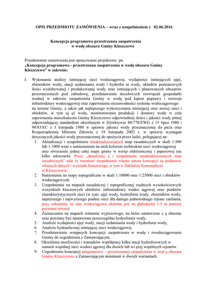 OPIS PRZEDMIOTU ZAMÓWIENIA – wraz z uzupełnieniem z 02.06.2016 Koncepcja programowo przestrzenna zaopatrzenia w wodę obszaru Gminy Kleszczewo Przedmiotem zamówienia jest opracowanie projektowe pn. „Koncepcja programowo - przestrzenna zaopatrzenia w wodę obszaru Gminy Kleszczewo” w zakresie: I. Wykonania analizy istniejącej sieci wodociągowej, wydajności istniejących ujęć, zbiorników wody, stacji uzdatniania wody i hydrofor ni wody, układów pomiarowych ilości wydobywanej i produkowanej wody oraz istniejących i planowanych obszarów przeznaczonych pod zabudowę, przedstawienie docelowych rozwiązań gospodarki wodnej w zakresie zaopatrzenia Gminy w wodę pod kątem poprawy i rozwoju infrastruktury wodociągowej oraz zapewnienia niezawodności systemu wodociągowego na terenie Gminy, a także jak najlepszego wykorzystania istniejącej oraz nowej sieci i obiektów, w tym uj ęć wody, monitorowania produkcji i dostawy wody w celu zapewnienia mieszkańcom Gminy Kleszczewo odpowiedniej ilości i jakości wody pitnej odpowiadającej standardom określonym w Dyrektywie 80/778/EWG z 15 lipca 1980 i 98/83/EC z 3 listopada 1988 w sprawie jakości wody przeznaczonej do picia oraz Rozporządzenia Ministra Zdrowia z 19 listopada 2002 r. w sprawie wymagań dotyczących jakości wody przeznaczonej do spożycia przez ludzi, polegającej na: 1. Aktualizacji i uzupełnieniu nieaktualizowanych map zasadniczych w skali 1:500 lub 1:1000 wraz z naniesieniem na nich kolorem niebieskim sieci wodociągowej oraz stworzeniu jednej całej mapy gminy w wersji elektronicznej i papierowej (na kilku arkuszach). Przez „aktualizacj ę i uzupełnienie nieaktualizowanych map zasadniczych” nale ży rozumieć uzupełnienie własne autora koncepcji na podstawie własnych danych i wywiadu branżowego, w tym w Zakładzie Komunalnym w Kleszczewie. 2. Naniesieniu na mapy topograficzne w skali 1:10000 oraz 1:25000 sieci i obiektów wodociągowych. 3. Uzupełnieniu na mapach zasadniczej i topograficznej rzędnych wysokościowych wszystkich kluczowych obiektów infrastruktury wodoc iągowej oraz punktów charakterystycznych sieci (w tym: ujęć wody, hydroforni wody, zbiorników wody, najniższego i najwyższego punktu sieci dla danego jednorodnego rejonu zasilania, przy założeniu, że sieć wodociągowa ułożona jest na głębokości 1,5 m poniżej poziomu terenu). 4. Zaznaczeniu na mapach ciśnienia wyjściowego, na które nastawione s ą obecnie oraz powinny być nastawione poszczególne hydrofornie wody. 5. Analizie wydajności ujęć wody, stacji uzdatniania wody i hydroforni wody, 6. Analizie hydraulicznej istniejącej sieci wodociągowej. 7. Przedstawieniu wstępnych koncepcji zaopatrzenia w wodę i zwodociągowania Gminy do uzgodnienia z Zamawiającym. 8. Określeniu możliwości i warunków współpracy kilku stacji hydroforowych w ramach wspólnej sieci wodoci ągowej dla dwóch lub wi ęcej wspólnych rejonów. 9. Uzgodnieniu koncepcji programowo – przestrzennej zaopatrzenia w wod ę obszaru Gminy Kleszczewo z Zamawiającym minimum w dwóch wariantach. 10. Opracowaniu końcowej koncepcji zaopatrzenia w wodę obszaru Gminy w dwóch wariantach. 11. Opracowaniu zbiorczego zestawienia kosztów z podzia łem na rejony obsługiwane przez poszczególne uj ęcia wody lub źródła zewn ętrznego zakupu wody lub rejony mieszane. II. Uzgodnienia z Zamawiającym proponowanych rozwiązań koncepcyjnych pod kątem: celowości przyjętych rozwiązań, koniecznych do poniesienia środków finansowych oraz spodziewanych korzyści eksploatacyjnych. III. Sporządzenia koncepcji projektowej zaopatrzenia w wodę obszaru całej Gminy (wraz z niezbędnymi opiniami i uzgodnieniami), z odniesieniem na mapie topograficznej i mapach zasadniczych (zgodnie z wyżej wymienionymi zapisami odnośnie sporządzania map), przedstawiającej kompleksowo, docelowe, perspektywiczne zwodociągowanie całej Gminy (w perspektywie 20-sto letniej), przyjmując rozwiązania gospodarki wodnej w zakresie zaopatrzenia gminy w wodę pod kątem wytyczenia kierunków rozwoju infrastruktury wodociągowej na terenie gminy w celu zapewnienia niezawodności systemu wodociągowego, a także mające na celu jak najlepsze wykorzystanie istniejącej sieci i obiektów (w tym uj ęć wody). Koncepcja powinna zostać wykonana na podstawie istniejącego systemu zaopatrzenia gminy w wodę oraz uwzględnić kierunki rozwoju gminy pod kątem planu zagospodarowania terenów gminy. Opracowan a koncepcja ma być podstawą planowania inwestycji oraz istotną wskazówk ą przy sporządzaniu dokumentacji technicznych. Należy zaproponować najlepsze możliwe rozwiązania, które służyć będą obniżeniu kosztów eksploatacji wodoci ągu w zakresie: wzrostu niezawodności systemu zaopatrzenia w wodę obszaru Gminy, optymalnego wykorzystania istniejących ujęć wody i istniejących sieci wodociągowych, monitorowania produkcji, ubytków i dostawy wody. Na tomiast zaopatrzenie w wodę z wodociągów obcych w miar ę możliwości należy potraktować jako rozwiązanie alternatywne, zapewniając najbardziej optymalne koszty wykonania połączenia wodociągów (pod wzgl ędem długości i szybkości wykonania planowanej trasy) a także pokrycie perspektywiczne zwiększonego zapotrzebowania wody (nowe ujęcia). Koncepcja może być wielowariantowa, co najmniej dwuwariantowa. Podczas opracowywania koncepcji projektowej należy przyjąć rozwiązania techniczne umożliwiające: a) wskazanie działań modernizacyjnych i inwestycyjnych Gminy, koniecznych do wykonania w najbliższych latach, do prawidłowego działania systemu zaopatrzenia Gminy w wodę, b) podejmowanie decyzji w sprawie dalszej budowy, rozbudowy i modernizacji sieci i obiektów wodoci ągowych w zakresie: - modernizacji: na mapach zasadniczych należy wskazać, które sieci i obiekty wodociągowe Gmina powinna przebudować (wraz ze wskazaniem: tras, średnic i parametrów obiektów słu żących zaopat