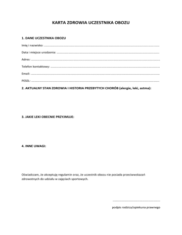 KARTA ZDROWIA UCZESTNIKA OBOZU 1. DANE UCZESTNIKA OBOZU Imię i nazwisko: ........................................................................................................................................ Data i miejsce urodzenia: ......................................................................................................................... Adres: ........................................................................................................................................................ Telefon kontaktowy: ................................................................................................................................. Email: ........................................................................................................................................................ PESEL: ....................................................................................................................................................... 2. AKTUALNY STAN ZDROWIA I HISTORIA PRZEBYTYCH CHORÓB (alergie, leki, astma): 3. JAKIE LEKI OBECNIE PRZYJMUJE: 4. INNE UWAGI: Oświadczam, że akceptuję regulamin oraz, że uczestnik obozu nie posiada przeciwwskazań zdrowotnych do udziału w zajęciach sportowych. ........................................................ podpis rodzica/opiekuna prawnego