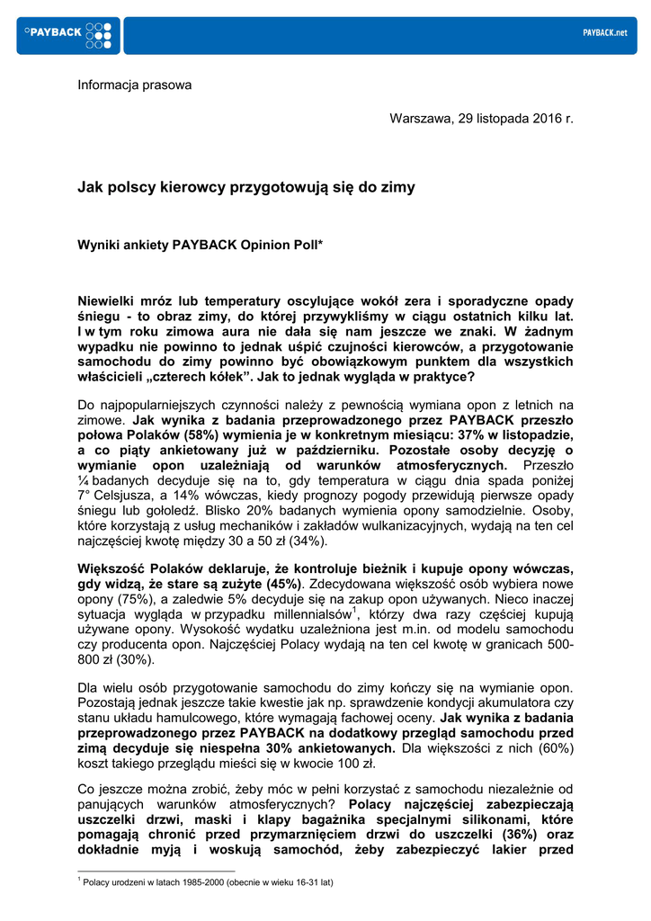 Informacja prasowa Warszawa, 29 listopada 2016 r. Jak polscy kierowcy przygotowują się do zimy Wyniki ankiety PAYBACK Opinion Poll* Niewielki mróz lub temperatury oscylujące wokół zera i sporadyczne opady śniegu - to obraz zimy, do której przywykliśmy w ciągu ostatnich kilku lat. I w tym roku zimowa aura nie dała się nam jeszcze we znaki. W żadnym wypadku nie powinno to jednak uśpić czujności kierowców, a przygotowanie samochodu do zimy powinno być obowiązkowym punktem dla wszystkich właścicieli „czterech kółek”. Jak to jednak wygląda w praktyce? Do najpopularniejszych czynności należy z pewnością wymiana opon z letnich na zimowe. Jak wynika z badania przeprowadzonego przez PAYBACK przeszło połowa Polaków (58%) wymienia je w konkretnym miesiącu: 37% w listopadzie, a co piąty ankietowany już w październiku. Pozostałe osoby decyzję o wymianie opon uzależniają od warunków atmosferycznych. Przeszło ¼ badanych decyduje się na to, gdy temperatura w ciągu dnia spada poniżej 7° Celsjusza, a 14% wówczas, kiedy prognozy pogody przewidują pierwsze opady śniegu lub gołoledź. Blisko 20% badanych wymienia opony samodzielnie. Osoby, które korzystają z usług mechaników i zakładów wulkanizacyjnych, wydają na ten cel najczęściej kwotę między 30 a 50 zł (34%). Większość Polaków deklaruje, że kontroluje bieżnik i kupuje opony wówczas, gdy widzą, że stare są zużyte (45%). Zdecydowana większość osób wybiera nowe opony (75%), a zaledwie 5% decyduje się na zakup opon używanych. Nieco inaczej sytuacja wygląda w przypadku millennialsów1, którzy dwa razy częściej kupują używane opony. Wysokość wydatku uzależniona jest m.in. od modelu samochodu czy producenta opon. Najczęściej Polacy wydają na ten cel kwotę w granicach 500800 zł (30%). Dla wielu osób przygotowanie samochodu do zimy kończy się na wymianie opon. Pozostają jednak jeszcze takie kwestie jak np. sprawdzenie kondycji akumulatora czy stanu układu hamulcowego, które wymagają fachowej oceny. Jak wynika z badania przeprowadzonego przez PAYBACK na dodatkowy przegląd samochodu przed zimą decyduje się niespełna 30% ankietowanych. Dla większości z nich (60%) koszt takiego przeglądu mieści się w kwocie 100 zł. Co jeszcze można zrobić, żeby móc w pełni korzystać z samochodu niezależnie od panujących warunków atmosferycznych? Polacy najczęściej zabezpieczają uszczelki drzwi, maski i klapy bagażnika specjalnymi silikonami, które pomagają chronić przed przymarznięciem drzwi do uszczelki (36%) oraz dokładnie myją i woskują samochód, żeby zabezpieczyć lakier przed 1 Polacy urodzeni w latach 1985-2000 (obecnie w wieku 16-31 lat) działaniem chemikaliów stosowanych zimą na drogach i żeby pojazd tak szybko się nie brudził (34%). Ankietowani decydują się również na wymianę dywaników welurowych na gumowe (24%) oraz zmianę wycieraczek (23%). Co trzeci badany deklaruje jednak, że nie wykonuje żadnych dodatkowych czynności, żeby przygotować swój samochód do zimy. Korzystanie z zimowego płynu do spryskiwaczy to już standard wśród kierowców. Ankietowani kupują go najczęściej w hiper- lub supermarketach (57%) oraz na stacjach benzynowych (31%). W większości Polacy płacą za niego między 10 a 20 zł (59%). Zimą przydatne okazują się również różnego rodzaju akcesoria. Do tych najczęściej wożonych w samochodzie należą: skrobaczka (96%), szczotka do odśnieżania (77%), odmrażacz do szyb (45%), kable rozruchowe (43%) oraz łopatka do odśnieżania (37%). Zimową porą spłatać figla kierowcom może także zamarzające w baku paliwo. Przeszło połowa Polaków (58%) nie zmienia jednak zimą swoich przyzwyczajeń w zakresie tankowania paliw i korzystania ze stacji benzynowych. 24% ankietowanych deklaruje wybieranie tylko dużych i markowych stacji, żeby zredukować ryzyko słabej jakości paliwa, a 22% osób zapytanych przez PAYBACK twierdzi, że zimą tankuje do pełna, żeby w baku pozostawić możliwie mało miejsca na skraplającą się wodę. *PAYBACK Opinion Poll To badanie zostało przeprowadzone na uczestnikach Programu PAYBACK w dniach od 9 listopada do 15 listopada 2016 metodą ankiety online na grupie 365 osób. Grupa badawcza w wieku 18-65 lat dobrana została tak, aby odpowiadać strukturze demograficznej kraju. PAYBACK Polska PAYBACK to multipartnerski Program Bonusowy, którego uczestnicy mogą zbierać punkty podczas zakupów w wielu popularnych sklepach sprzedaży tradycyjnej oraz online. Dzięki specjalnym promocjom, ofertom oraz kuponom (również elektronicznym) posiadacze kart PAYBACK mogą szybko i łatwo zwiększyć stan konta punktowego. Zebrane punkty PAYBACK można wymienić na atrakcyjne nagrody, mile Miles & More, płacić za zakupy u wybranych partnerów lub przekazać je na program dożywiania dzieci Pajacyk. W Polsce Program PAYBACK rozpoczął swoją działalność 16 września 2009 roku. Obecnie współpracuje z nim blisko 900 partnerów, w tym prawie 200 sklepów internetowych. Korzyścią dla partnerów Programu jest bezpośrednia komunikacja z konsumentami za pomocą platformy marketingowej PAYBACK oraz pozyskanie lojalnych i zadowolonych klientów. W Polsce aktualnie liczba aktywnych uczestników PAYBACK to blisko 7 milionów. PAYBACK jest częścią Grupy American Express. Kontakt dla mediów: Krzysztof Pilaszek Communications Manager PAYBACK Polska | American Express Group Tel. +48 22 20 66 914 [email protected] [email protected]