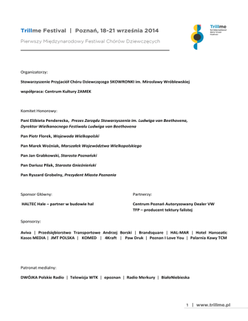 Trillme Festival | Poznań, 18-21 września 2014 Organizatorzy: Stowarzyszenie Przyjaciół Chóru Dziewczęcego SKOWRONKI im. Mirosławy Wróblewskiej współpraca: Centrum Kultury ZAMEK Komitet Honorowy: Pani Elżbieta Penderecka, Prezes Zarządu Stowarzyszenia im. Ludwiga van Beethovena, Dyrektor Wielkanocnego Festiwalu Ludwiga van Beethovena Pan Piotr Florek, Wojewoda Wielkopolski Pan Marek Woźniak, Marszałek Województwa Wielkopolskiego Pan Jan Grabkowski, Starosta Poznański Pan Dariusz Pilak, Starosta Gnieźnieński Pan Ryszard Grobelny, Prezydent Miasta Poznania Sponsor Główny: Partnerzy: HALTEC Hale – partner w budowie hal Centrum Poznań Autoryzowany Dealer VW TFP – producent tektury falistej Sponsorzy: Aviva | Przedsiębiorstwo Transportowe Andrzej Borski | Brandsquare | HAL-MAR | Hotel Hanseatic Kasos MEDIA | JMT POLSKA | KOMED | 4Kraft | Paw Druk | Poznan I Love You | Palarnia Kawy TCM Patronat medialny: DWÓJKA Polskie Radio | Telewizja WTK | epoznan | Radio Merkury | BiałoNiebieska 1 | www.trillme.pl Trillme Festival | Program Poznań, 18-21 września 2014 Uczestnicy: CHÓR DZIEWCZĘCY AURIN, Kecskemét, Węgry Dyrygent: László Durányik CHÓR DZIEWCZĘCY BREVIS, Osijek, Chorwacja Dyrygent: Antoaneta Radočaj-Jerković CHÓR DZIECIĘCY „THE STARS”, Leskovac, Serbia Dyrygent: Jelena Cvetković CHÓR DZIECIĘCY „VIVAT MUSICA”, Riwne, Ukraina Dyrygent: Natalia Pawluczuk CHÓR DZIEWCZĘCY POZNAŃSKIEJ SZKOŁY CHÓRALNEJ JERZEGO KURCZEWSKIEGO, Poznań, Polska Dyrygent: Dorota Wojnowska CHÓR DZIEWCZĘCY MAŁE SKOWRONKI, CHÓR DZIEWCZĘCY SKOWRONECZKI, Poznań, Polska Dyrygent: Julia Łynsza CHÓR DZIEWCZĘCY SKOWRONKI, Poznań, Polska Dyrygent: Alicja Szeluga SZCZEGÓŁOWY PROGRAM FESTIWALU: 18 września 2014 (czwartek) Koncert inauguracyjny g. 19:00 - Sala Wielka, Centrum Kultury Zamek ul. Św. Marcin 80/82, Poznań CHÓR DZIEWCZĘCY SKOWRONKI, Poznań, Polska Dyrygent: Alicja Szeluga 2 | www.trillme.pl 19 września 2014 (piątek) - KONCERTY SZKOLNE g. 12:00 - I Liceum Ogólnokształcące im. Bolesława Chrobrego ul. Kostrzewskiego 3, Gniezno CHÓR DZIECIĘCY „VIVAT MUSICA”, Riwne, Ukraina Dyrygent: Natalia Pawluczuk g.11.30 - Gimnazjum im. Władysława hr. Zamoyskiego ul. Dworcowa 11, Kórnik CHÓR DZIECIĘCY „THE STARS”, Leskovac, Serbia Dyrygent: Jelena Cvetković g. 12.15 - II Liceum Ogólnokształcące im. Generałowej Zamoyskiej i Heleny Modrzejewskiej ul. Matejki 8/10, Poznań CHÓR DZIEWCZĘCY AURIN, Kecskemét, Węgry Dyrygent: László Durányik g. 12.30 - I Liceum Ogólnokształcące im. Karola Marcinkowskiego ul. Bukowska 16, Poznań CHÓR DZIEWCZĘCY BREVIS, Osijek, Chorwacja Dyrygent: Antoaneta Radočaj-Jerković g.12.30 - Szkoła Podstawowa nr 34 im. Wojska Polskiego os. Bolesława Śmiałego 107, Poznań CHÓR DZIEWCZĘCY POZNAŃSKIEJ SZKOŁY CHÓRALNEJ JERZEGO KURCZEWSKIEGO, Poznań, Polska Dyrygent: Dorota Wojnowska 19 września 2014 (piątek) - KONCERTY POPOŁUDNIOWE g.19.00 - Sala Wielka, Centrum Kultury Zamek, ul. Św. Marcin 80/82, Poznań CHÓR DZIEWCZĘCY MAŁE SKOWRONKI CHÓR DZIEWCZĘCY SKOWRONECZKI, Poznań, Polska Dyrygent: Julia Łynsza CHÓR DZIECIĘCY „VIVAT MUSICA”, Riwne, Ukraina Dyrygent: Natalia Pawluczuk CHÓR DZIECIĘCY „THE STARS”, Leskovac, Serbia Dyrygent: Jelena Cvetković CHÓR DZIEWCZĘCY AURIN, Kecskemét, Węgry Dyrygent: László Durányik 3 | www.trillme.pl g.19.30 - Scena Wspólna Teatru Łejery i Centrum Sztuki Dziecka ul. Brandstaettera 1, Poznań CHÓR DZIEWCZĘCY POZNAŃSKIEJ SZKOŁY CHÓRALNEJ JERZEGO KURCZEWSKIEGO, Poznań, Polska Dyrygent: Dorota Wojnowska CHÓR DZIEWCZĘCY BREVIS, Osijek, Chorwacja Dyrygent: Antoaneta Radocaj- Jerkovic 20 września 2014 (sobota) Koncert Galowy g.18.00 - Aula Uniwersytecka ul. Wieniawskiego 1, Poznań Prezentacje chórów uczestniczących w Trillme Festival Prawykonanie utworu na głosy równe, fortepian i perkusję „What is music” (muzyka: Marek Raczyński, tekst: Yascel Rodriquez). Wykonawcy: wszystkie chóry uczestniczące w Trillme Festival, Beata Polak – perkusja, Czesław Łynsza – fortepian, Alicja Szeluga – dyrygent 21 września 2014 (niedziela) - OPRAWA MUZYCZNA MSZY ŚW. W KOŚCIOŁACH g.10.00 - Kościół pw. św. Józefa (oo. Karmelici) ul. Działowa 2, Poznań CHÓR DZIEWCZĘCY AURIN, Kecskemét, Węgry Dyrygent: László Durányik g.12.00 - Kościół pw. Wszystkich Świętych ul. Grobla 1, Poznań CHÓR DZIEWCZĘCY POZNAŃSKIEJ SZKOŁY CHÓRALNEJ JERZEGO KURCZEWSKIEGO, Poznań, Polska Dyrygent: Dorota Wojnowska g.12.30 - Kościół oo. Franciszkanów na Wzgórzu Przemysła ul. Franciszkańska 2 , Poznań CHÓR DZIEWCZĘCY SKOWRONKI, Poznań, Polska Dyrygent: Alicja Szeluga Na koncerty wstęp wolny. 4 | www.trillme.pl