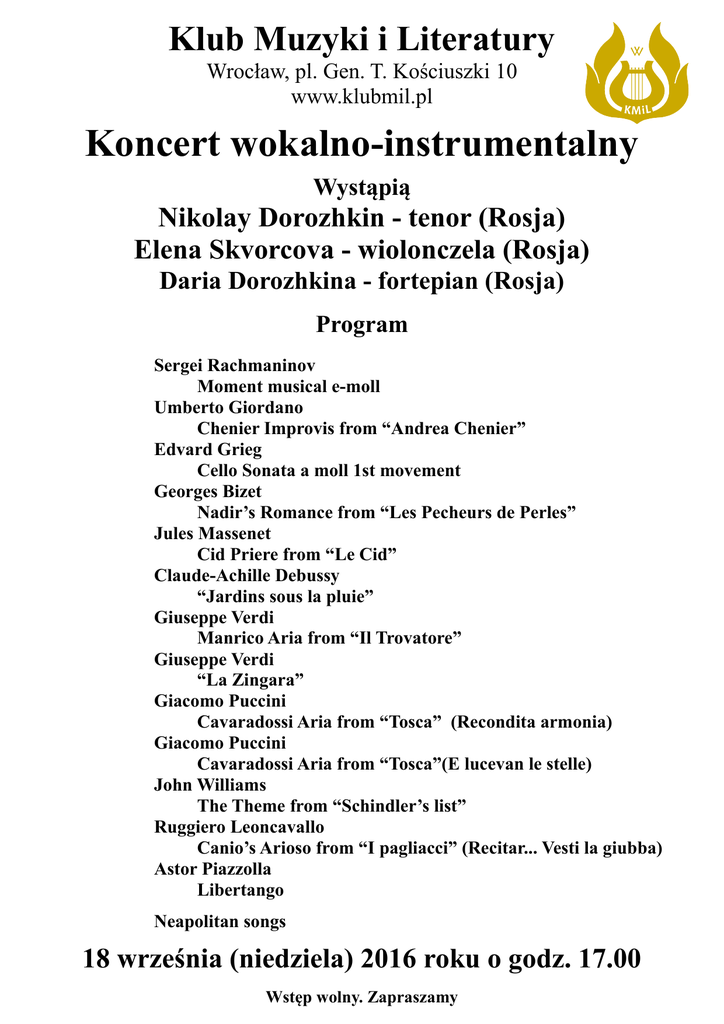 Klub Muzyki i Literatury Wrocław, pl. Gen. T. Kościuszki 10 www.klubmil.pl Koncert wokalno-instrumentalny Wystąpią Nikolay Dorozhkin - tenor (Rosja) Elena Skvorcova - wiolonczela (Rosja) Daria Dorozhkina - fortepian (Rosja) Program Sergei Rachmaninov Moment musical e-moll Umberto Giordano Chenier Improvis from “Andrea Chenier” Edvard Grieg Cello Sonata a moll 1st movement Georges Bizet Nadir’s Romance from “Les Pecheurs de Perles” Jules Massenet Cid Priere from “Le Cid” Claude-Achille Debussy “Jardins sous la pluie” Giuseppe Verdi Manrico Aria from “Il Trovatore” Giuseppe Verdi “La Zingara” Giacomo Puccini Cavaradossi Aria from “Tosca” (Recondita armonia) Giacomo Puccini Cavaradossi Aria from “Tosca”(E lucevan le stelle) John Williams The Theme from “Schindler’s list” Ruggiero Leoncavallo Canio’s Arioso from “I pagliacci” (Recitar... Vesti la giubba) Astor Piazzolla Libertango Neapolitan songs 18 września (niedziela) 2016 roku o godz. 17.00 Wstęp wolny. Zapraszamy