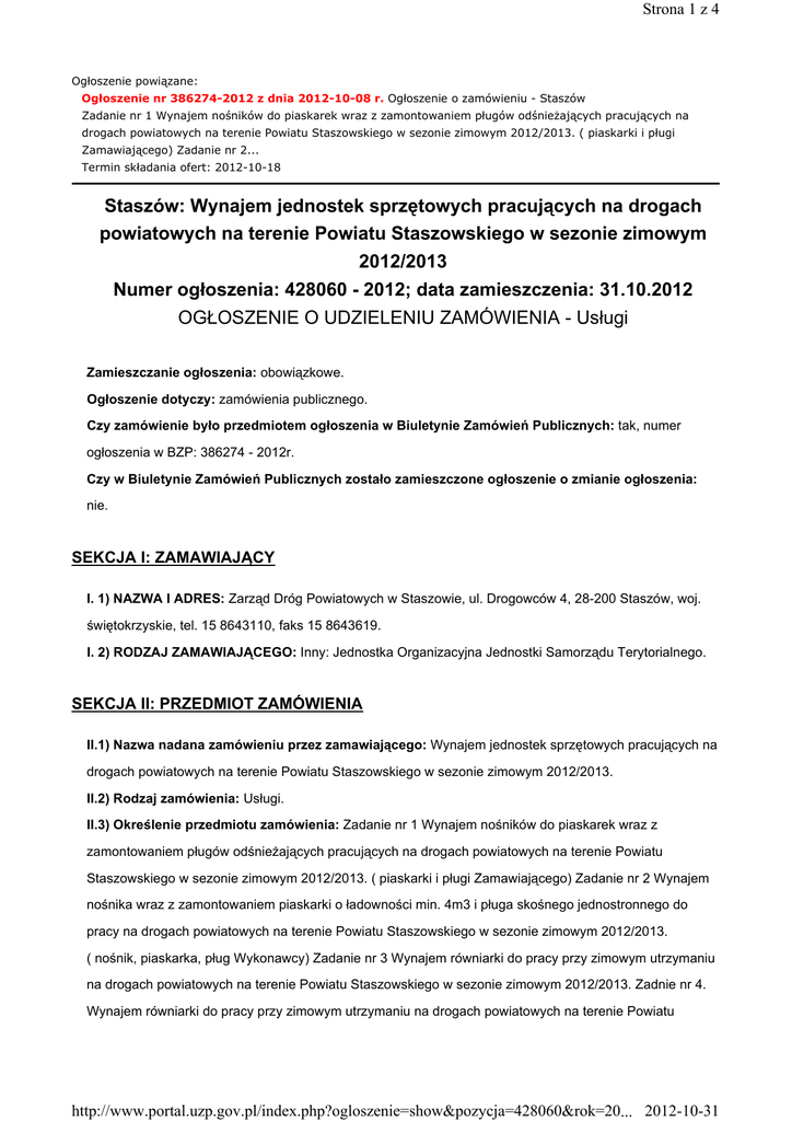 Strona 1 z 4 Ogłoszenie powiązane: Ogłoszenie nr 386274-2012 z dnia 2012-10-08 r. Ogłoszenie o zamówieniu - Staszów Zadanie nr 1 Wynajem nośników do piaskarek wraz z zamontowaniem pługów odśnieżających pracujących na drogach powiatowych na terenie Powiatu Staszowskiego w sezonie zimowym 2012/2013. ( piaskarki i pługi Zamawiającego) Zadanie nr 2... Termin składania ofert: 2012-10-18 Staszów: Wynajem jednostek sprzętowych pracujących na drogach powiatowych na terenie Powiatu Staszowskiego w sezonie zimowym 2012/2013 Numer ogłoszenia: 428060 - 2012; data zamieszczenia: 31.10.2012 OGŁOSZENIE O UDZIELENIU ZAMÓWIENIA - Usługi Zamieszczanie ogłoszenia: obowiązkowe. Ogłoszenie dotyczy: zamówienia publicznego. Czy zamówienie było przedmiotem ogłoszenia w Biuletynie Zamówień Publicznych: tak, numer ogłoszenia w BZP: 386274 - 2012r. Czy w Biuletynie Zamówień Publicznych zostało zamieszczone ogłoszenie o zmianie ogłoszenia: nie. SEKCJA I: ZAMAWIAJĄCY I. 1) NAZWA I ADRES: Zarząd Dróg Powiatowych w Staszowie, ul. Drogowców 4, 28-200 Staszów, woj. świętokrzyskie, tel. 15 8643110, faks 15 8643619. I. 2) RODZAJ ZAMAWIAJĄCEGO: Inny: Jednostka Organizacyjna Jednostki Samorządu Terytorialnego. SEKCJA II: PRZEDMIOT ZAMÓWIENIA II.1) Nazwa nadana zamówieniu przez zamawiającego: Wynajem jednostek sprzętowych pracujących na drogach powiatowych na terenie Powiatu Staszowskiego w sezonie zimowym 2012/2013. II.2) Rodzaj zamówienia: Usługi. II.3) Określenie przedmiotu zamówienia: Zadanie nr 1 Wynajem nośników do piaskarek wraz z zamontowaniem pługów odśnieżających pracujących na drogach powiatowych na terenie Powiatu Staszowskiego w sezonie zimowym 2012/2013. ( piaskarki i pługi Zamawiającego) Zadanie nr 2 Wynajem nośnika wraz z zamontowaniem piaskarki o ładowności min. 4m3 i pługa skośnego jednostronnego do pracy na drogach powiatowych na terenie Powiatu Staszowskiego w sezonie zimowym 2012/2013. ( nośnik, piaskarka, pług Wykonawcy) Zadanie nr 3 Wynajem równiarki do pracy przy zimowym utrzymaniu na drogach powiatowych na terenie Powiatu Staszowskiego w sezonie zimowym 2012/2013. Zadnie nr 4. Wynajem równiarki do pracy przy zimowym utrzymaniu na drogach powiatowych na terenie Powiatu http://www.portal.uzp.gov.pl/index.php?ogloszenie=show&pozycja=428060&rok=20... 2012-10-31 Strona 2 z 4 Staszowskiego w sezonie zimowym 2012/2013. Zadnie nr 5. Wynajem równiarki do pracy przy zimowym utrzymaniu na drogach powiatowych na terenie Powiatu Staszowskiego w sezonie zimowym 2012/2013.. II.4) Wspólny Słownik Zamówień (CPV): 90.21.20.00-6, 90.21.30.00-3. SEKCJA III: PROCEDURA III.1) TRYB UDZIELENIA ZAMÓWIENIA: Przetarg nieograniczony III.2) INFORMACJE ADMINISTRACYJNE Zamówienie dotyczy projektu/programu finansowanego ze środków Unii Europejskiej: nie SEKCJA IV: UDZIELENIE ZAMÓWIENIA Część NR: 1 Nazwa: Zadanie nr 1 Wynajem nośników do piaskarek wraz z zamontowaniem pługów odśnieżających pracujących na drogach powiatowych na terenie Powiatu Staszowskiego w sezonie zimowym 2012/2013. ( piaskarki i pługi Zamawiającego) IV.1) DATA UDZIELENIA ZAMÓWIENIA: 30.10.2012. IV.2) LICZBA OTRZYMANYCH OFERT: 3. IV.3) LICZBA ODRZUCONYCH OFERT: 0. IV.4) NAZWA I ADRES WYKONAWCY, KTÓREMU UDZIELONO ZAMÓWIENIA: Firma Transportowo - Remontowa Usług Drogowo- Budowlanych, DROG-BUD Zbigniew Bąk,, Czajków Płd. 142,, 28-200 Staszów, kraj/woj. świętokrzyskie. IV.5) Szacunkowa wartość zamówienia (bez VAT): 115000,00 PLN. IV.6) INFORMACJA O CENIE WYBRANEJ OFERTY ORAZ O OFERTACH Z NAJNIŻSZĄ I NAJWYŻSZĄ CENĄ Cena wybranej oferty: 5,00 Oferta z najniższą ceną: 5,00 / Oferta z najwyższą ceną: 11,00 Waluta: PLN. Część NR: 2 Nazwa: Zadanie nr 2 Wynajem nośnika wraz z zamontowaniem piaskarki o ładowności min. 4m3 i pługa skośnego jednostronnego do pracy na drogach powiatowych na terenie Powiatu Staszowskiego w sezonie zimowym 2012/2013. ( nośnik, piaskarka, pług Wykonawcy) IV.1) DATA UDZIELENIA ZAMÓWIENIA: 30.10.2012. IV.2) LICZBA OTRZYMANYCH OFERT: 2. IV.3) LICZBA ODRZUCONYCH OFERT: 0. IV.4) NAZWA I ADRES WYKONAWCY, KTÓREMU UDZIELONO ZAMÓWIENIA: Firma Transportowo - Budowlano - Drogowa DYLMEX Tomasz Dyl ,, ul. Rakowska 33, 28-200 Staszów, kraj/woj. świętokrzyskie. http://www.portal.uzp.gov.pl/index.php?ogloszenie=show&pozycja=428060&rok=20... 2012-10-31 Strona 3 z 4 IV.5) Szacunkowa wartość zamówienia (bez VAT): 115000,00 PLN. IV.6) INFORMACJA O CENIE WYBRANEJ OFERTY ORAZ O OFERTACH Z NAJNIŻSZĄ I NAJWYŻSZĄ CENĄ Cena wybranej oferty: 14,00 Oferta z najniższą ceną: 14,00 / Oferta z najwyższą ceną: 15,00 Waluta: PLN. Część NR: 3 Nazwa: Zadanie nr 3 Wynajem równiarki do pracy przy zimowym utrzymaniu na drogach powiatowych na terenie Powiatu Staszowskiego w sezonie zimowym 2012/2013. IV.1) DATA UDZIELENIA ZAMÓWIENIA: 30.10.2012. IV.2) LICZBA OTRZYMANYCH OFERT: 2. IV.3) LICZBA ODRZUCONYCH OFERT: 0. IV.4) NAZWA I ADRES WYKONAWCY, KTÓREMU UDZIELONO ZAMÓWIENIA: Przedsiębiorstwo Robót Drogowych Staszów Sp. z.o.o., ul. Rakowska 40, 28-200 Staszów, kraj/woj. świętokrzyskie. IV.5) Szacunkowa wartość zamówienia (bez VAT): 115000,00 PLN. IV.6) INFORMACJA O CENIE WYBRANEJ OFERTY ORAZ O OFERTACH Z NAJNIŻSZĄ I NAJWYŻSZĄ CENĄ Cena wybranej oferty: 144,00 Oferta z najniższą ceną: 144,00 / Oferta z najwyższą ceną: 145,00 Waluta: PLN. Część NR: 4 Nazwa: Zadnie nr 4. Wynajem równiarki do pracy przy zimowym utrzymaniu na drogach powiatowych na terenie Powiatu Staszowskiego w sezonie zimowym 2012/2013. IV.1) DATA UDZIELENIA ZAMÓWIENIA: 30.10.2012. IV.2) LICZBA OTRZYMANYCH OFERT: 2. IV.3) LICZBA ODRZUCONYCH OFERT: 0. IV.4) NAZWA I ADRES WYKONAWCY, KTÓREMU UDZIELONO ZAMÓWIENIA: Przedsiębiorstwo Robót Drogowych Staszów Sp. z.o.o., ul. Rakowska 40, 28-200 Staszów, kraj/woj. świętokrzyskie. IV.5) Szacunkowa wartość zamówienia (bez VAT): 115000,00 PLN. IV.6) INFORMACJA O CENIE WYBRANEJ OFERTY ORAZ O OFER