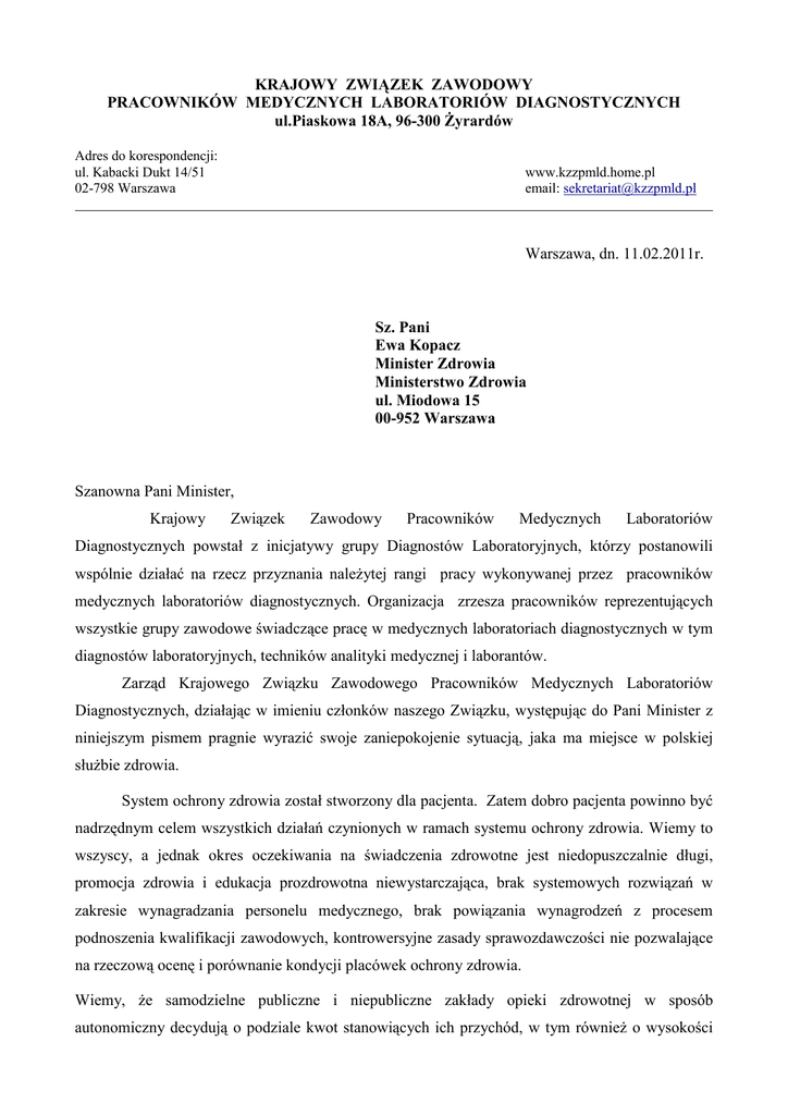 KRAJOWY ZWIĄZEK ZAWODOWY PRACOWNIKÓW MEDYCZNYCH LABORATORIÓW DIAGNOSTYCZNYCH ul.Piaskowa 18A, 96-300 Żyrardów Adres do korespondencji: ul. Kabacki Dukt 14/51 02-798 Warszawa www.kzzpmld.home.pl email: [email protected] Warszawa, dn. 11.02.2011r. Sz. Pani Ewa Kopacz Minister Zdrowia Ministerstwo Zdrowia ul. Miodowa 15 00-952 Warszawa Szanowna Pani Minister, Krajowy Związek Zawodowy Pracowników Medycznych Laboratoriów Diagnostycznych powstał z inicjatywy grupy Diagnostów Laboratoryjnych, którzy postanowili wspólnie działać na rzecz przyznania należytej rangi pracy wykonywanej przez pracowników medycznych laboratoriów diagnostycznych. Organizacja zrzesza pracowników reprezentujących wszystkie grupy zawodowe świadczące pracę w medycznych laboratoriach diagnostycznych w tym diagnostów laboratoryjnych, techników analityki medycznej i laborantów. Zarząd Krajowego Związku Zawodowego Pracowników Medycznych Laboratoriów Diagnostycznych, działając w imieniu członków naszego Związku, występując do Pani Minister z niniejszym pismem pragnie wyrazić swoje zaniepokojenie sytuacją, jaka ma miejsce w polskiej służbie zdrowia. System ochrony zdrowia został stworzony dla pacjenta. Zatem dobro pacjenta powinno być nadrzędnym celem wszystkich działań czynionych w ramach systemu ochrony zdrowia. Wiemy to wszyscy, a jednak okres oczekiwania na świadczenia zdrowotne jest niedopuszczalnie długi, promocja zdrowia i edukacja prozdrowotna niewystarczająca, brak systemowych rozwiązań w zakresie wynagradzania personelu medycznego, brak powiązania wynagrodzeń z procesem podnoszenia kwalifikacji zawodowych, kontrowersyjne zasady sprawozdawczości nie pozwalające na rzeczową ocenę i porównanie kondycji placówek ochrony zdrowia. Wiemy, że samodzielne publiczne i niepubliczne zakłady opieki zdrowotnej w sposób autonomiczny decydują o podziale kwot stanowiących ich przychód, w tym również o wysokości KRAJOWY ZWIĄZEK ZAWODOWY PRACOWNIKÓW MEDYCZNYCH LABORATORIÓW DIAGNOSTYCZNYCH ul.Piaskowa 18A, 96-300 Żyrardów Adres do korespondencji: ul. Kabacki Dukt 14/51 02-798 Warszawa środków przeznaczonych www.kzzpmld.home.pl email: [email protected] na wynagrodzenia pracowników w poszczególnych grupach zawodowych. Ze względu na brak wzmiankowanych wyżej systemowych rozwiązań dotyczących wynagrodzeń, regułą jest, że przeważająca część środków przeznaczonych na wzrost płac zawsze przypada najliczniejszym i najsilniejszym grupom zawodowym, dysponującym największą siłą nacisku. Przy podziale środków na zwiększenie wynagrodzeń, pracownicy medycznych laboratoriów diagnostycznych reprezentujący zawód medyczny są często pomijani, zamiast być traktowani na równi z innymi pracownikami posiadającymi porównywalne wykształcenie i wykonującymi zawód medyczny. Pod fałszywymi sztandarami „oszczędności” niekompetentni dyrektorzy szpitali „sprzedają” laboratoria medyczne, zamiast je rozwijać z korzyścią dla szpitali. Te w większości niestety nieodwracalne pseudo oszczędności skutkują znacznym spadkiem jakości i dostępności badań dla pacjenta, a przede wszystkim zwolnieniami, najczęściej wykwalifikowanej kadry. Diagnostyka laboratoryjna jest jednym z fundamentów profilaktyki zdrowia, jak i rzetelną podstawą odpowiedzialnej diagnozy lekarskiej i całego procesu leczenia pacjenta. Pragniemy na dzisiejszym spotkaniu poruszyć temat miejsca diagnostyki laboratoryjnej w procesie leczenia pacjentów. Nasuwa się nam pytanie, jakie są plany, co do diagnostyki laboratoryjnej w Polsce, miejsca laboratorium w szpitalu w sytuacji restrukturyzacji i wyprowadzania laboratoriów na zewnątrz jednostek służby zdrowia. Ustawa o ZOZ narzuca na pracodawcę konieczność zapewnienia szybkiej i wysokiej jakości diagnostyki dla pacjentów hospitalizowanych. Czy MZ dostrzega potrzebę zapisu w Ustawie z dnia 30 sierpnia 1991 r. o zakładach opieki zdrowotnej (Dz.U. 2007.14.89) , że medyczne laboratoria diagnostyczne powinny stanowić integralną część szpitala.? Chcielibyśmy poznać, jakie kryteria MZ stosuje do wyceny pracy pracowników w poszczególnych grupach zawodowych, co może w przyszłości pozwoli na stworzenie kryteriów wyceny pracy pracowników laboratoriów medycznych. Czemu służą działania MZ, które powodują powstawanie rażących dysproporcji w wynagradzaniu pracowników służby zdrowia (porozumienie zawarte pomiędzy Panią Minister Zdrowia Ewą Kopacz a reprezentantem OZZPiP Panią Dorotą Gardias w dniu 30.06.2010 roku, które jawnie dyskryminuje pozostałe grupy zawodowe w ustalaniu z KRAJOWY ZWIĄZEK ZAWODOWY PRACOWNIKÓW MEDYCZNYCH LABORATORIÓW DIAGNOSTYCZNYCH ul.Piaskowa 18A, 96-300 Żyrardów Adres do korespondencji: ul. Kabacki Dukt 14/51 02-798 Warszawa www.kzzpmld.home.pl email: [email protected] pracodawcą wysokości wynagrodzeń )? Naszym zdaniem MZ winno dążyć do opracowania spójnego systemu wynagradzania pracowników Służby Zdrowia, określającego relację między płacą lekarza, diagnosty laboratoryjnego, farmaceuty, pielęgniarki, technika analityki medycznej itd., obowiązującego we wszystkich podległych MZ jednostkach Służby Zdrowia, niezależnie od ich statusu prawnego. Uważamy, że argument o ograniczaniu swobody działalności gospodarczej NZOZ-ów jest chybiony, gdyż to NFZ (zależny przecież od MZ) płaci za świadczenia zdrowotne i ma prawo ustalać swoje warunki. Nasza organizacja reprezentuje wszystkie grupy pracowników medycznych laboratoriów diagnostycznych, zarówno diagnostów laboratoryjnych jak i techników analityki medycznej. W tym miejscu należy zauważyć, że zawód technika analityki medycznej został usunięty z ustawy o innych zawodach medycznych. Zwracamy się z pytaniem o konsekwencje takiej decyzji dla tej grupy zawodowej? Czy brak zapisu o wykonywaniu zawodu technika analityki medycznej nie pozbawi te osoby za kilka lat możliwości wykonywa