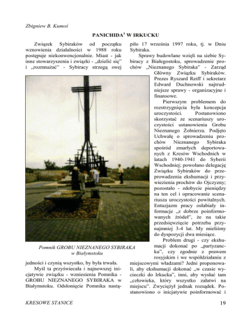 Zbigniew B. Kumoś PANICHIDA1 W IRKUCKU Związek Sybiraków od początku wznowienia działalności w 1988 roku postępuje niekonwencjonalnie. Miast - jak inne stowarzyszenia i związki - „dzielić się” i „rozmnażać” - Sybiracy strzegą swej piło 17 września 1997 roku, tj. w Dniu Sybiraka. Sprawy budowlane wzięli na siebie Sybiracy z Białegostoku, sprowadzenie prochów „Nieznanego Sybiraka” - Zarząd Główny Związku Sybiraków. Prezes Ryszard Reiff i sekretarz Edward Duchnowski najtrudniejsze sprawy - organizacyjne i finansowe. Pierwszym problemem do rozstrzygnięcia była koncepcja uroczystości. Postanowiono skorzystać ze scenariuszy uroczystości ustanowienia Grobu Nieznanego Żołnierza. Podjęto Uchwałę o sprowadzeniu prochów Nieznanego Sybiraka spośród zmarłych deportowanych z Kresów Wschodnich w latach 1940-1941 do Syberii Wschodniej; powołano delegację Związku Sybiraków do przeprowadzenia ekshumacji i przywiezienia prochów do Ojczyzny; pozostało - zdobycie pieniędzy na ten cel i opracowanie scenariusza uroczystości powitalnych. Entuzjazm pracy osłabiały informacje „z dobrze poinformowanych źródeł”, że na takie przedsięwzięcie potrzeba przynajmniej 3-4 lat. My mieliśmy do dyspozycji dwa miesiące. Problem drugi - czy ekshumacji dokonać po „partyzancPomnik GROBU NIEZNANEGO SYBIRAKA ku”, czy zgodnie z prawem w Białymstoku rosyjskim i we współdziałaniu z jedności i czynią wszystko, by była trwała. miejscowymi władzami? Jedni proponowaMyśl ta przyświecała i najnowszej inili, aby ekshumacji dokonać „w czasie wycjatywie związku - wzniesienia Pomnika cieczki do Irkucka”, inni, aby wysłać tam GROBU NIEZNANEGO SYBIRAKA w „człowieka, który wszystko załatwi na Białymstoku. Odsłonięcie Pomnika nastąmiejscu”. Zwyciężył jednak rozsądek. Postanowiono o inicjatywie poinformować i KRESOWE STANICE 19 poprosić o pomoc Ministerstwo Spraw Zagranicznych, ambasadę Rzeczypospolitej Polskiej w Moskwie, gubernatora Irkucka oraz władze Federacji Rosyjskiej w Moskwie. Problem trzeci - na kim „oprzeć się” w Irkucku. Rozmowy przyniosły nieoczekiwany efekt: struktury oficjalnej, polskiej organizacji w Irkucku nie odpowiedziały „ani tak - ani nie”, uznając, że brak odpowiedzi będzie odpowiedzią wystarczającą... Odpowiedziała natomiast pani Natalia Falińska - Polka „po paszporcie” co z dumą ona i jej ojciec podkreślają, honorowa Przedstawicielka fundacji „Fundusz Pomocy Sybirakom” w Irkucku... Na początku maja 1997 roku wszystkie prace organizacyjne i prawne ruszyły „z kopyta”. Prezes Oddziału z Białegostoku Olizarowicz zamówił u miejscowego rzemieślnika piękną urnę na prochy Nieznanego Sybiraka. Srebrzysty metal wzbogacony złoceniami ornamentu i symbolami odznaki sybirackiej czynił urnę dostojną - godną wielkiego celu, dla jakiego została wykonana. Pani Falińska w Irkucku przez miejscowe koneksje i materiały otrzymane z Polski wyznaczyła cztery miejscowości, gdzie na pewno osiedlani byli Polacy z deportacji 1940 i 1941 roku. Najtrudniej szło znalezienie cmentarza z mogiłami Polaków. Wreszcie znaleziono takie mogiły w miejscowości KWITOK, kilkadziesiąt kilometrów na wschód od stolicy OZIERŁAG-u w Tajszecie. Niestety, zgody władz rosyjskich nie było. Mimo to, 31 maja dwuosobowa delegacja: pani Klara Rogalska - wiceprezes Związku Sybiraków w Białymstoku oraz niżej podpisany, wylecieli do Moskwy. Na lotnisku w Moskwie oczekiwał na nas Konsul Generalny RP w Federacji Rosyjskiej pan Jerzy Rychlik. Wiadomości miał złe: „do dnia dzisiejszego władze rosyjskie nie wydały żadnej decyzji. Na wniosek Ambasadora RP skierowana została do rosyjskiego MSZ oficjalna nota dyplomatyczna, a ja w poniedziałek przylecę do 20 Irkucka wspierać wasze starania”. Po kilkugodzinnym oczekiwaniu, w minorowych nastrojach, delegacja Związku Sybiraków odleciała do Irkucka. Odlatywaliśmy z Moskwy bogatsi także o wiedzę, że Moskwa to po Tokio najdroższe miasto świata. Za skromny obiad - w tym jedno danie wegetariańskie - zapłaciliśmy ponad 50 dolarów... 1 czerwca 97 r. - pierwszy dzień syberyjskiego lata - o 840 rano wylądowaliśmy na irkuckim lotnisku. Powitała nas ciepła, słoneczna pogoda... i pani Falińska. Nie miała nic nowego do zakomunikowania: decyzji władz nie ma! Postanowiliśmy czekać do poniedziałku na konsula Rychlika. Czasu jednak nie marnujemy. Pani Klara jest w Irkucku pierwszy raz, chce zobaczyć i poznać co się tylko da. W samo południe wyruszamy na zwiedzanie. Zaczynamy od polskiego kościoła. Niestety, zamknięty. Dowiadujemy się, że ksiądz Darek, ojciec zakonu salwatorianów z Krakowa pojechał odprawiać mszę do Wierszyny - polskiej wsi „na końcu świata”. Zwiedzamy cerkwie i muzea. Wszędzie widzimy ślady polskości; ulica Polskich Powstańców (z 1866 roku na Zabajkalu), polski Orzeł na pomniku cara Aleksandra II, nazwiska Czerskiego, Dybowskiego i innych w muzeach... 2 czerwca poranek zastaje nas na lotnisku. Czekamy na pana Konsula i „Panią od Gubernatora”. Samolot dzięki Bogu ląduje planowo. Pani od gubernatora niestety, nie ma. W rozmowie telefonicznej dowiadujemy się, że „pojechała witać konsula z Moskwy”... O terminie spotkania w urzędzie gubernatora Irkucka dowiemy się „może” później - o 12 lub 14. Postanawiamy z konsulem Rychlikiem odbyć „naradę sztabową”. Ustalamy różne warianty postępowania. Przygotowujemy treść różnych pism, które zamierzamy wysłać do kompetentnych ludzi, licząc na ich pomoc „w razie czego”. KRESOWE STANICE Czekamy na telefon - o godz. 14 wreszcie jest. Jesteśmy zaproszeni do kierownika wydziału pana Jershe. Zajmuje się ekonomią i kulturą... Liczymy na kulturę... Punktualnie o godz. 16 wchodzimy do gmachu Gubernatora Irkuckiej Obłasti. Wita nas nieco spięta pani Natalia Stolarowa i prowadzi do swego szefa. Powitanie nadzwyczaj serde