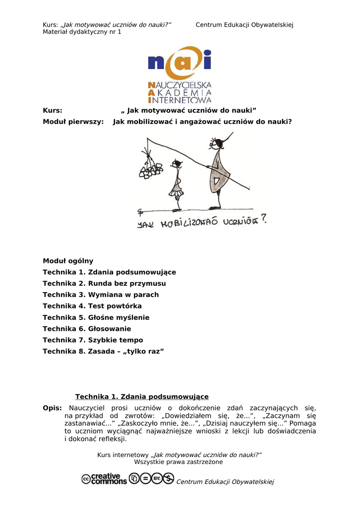 Kurs: „Jak motywować uczniów do nauki?” Materiał dydaktyczny nr 1 Kurs: Centrum Edukacji Obywatelskiej „ Jak motywować uczniów do nauki” Moduł pierwszy: Jak mobilizować i angażować uczniów do nauki? Moduł ogólny Technika 1. Zdania podsumowujące Technika 2. Runda bez przymusu Technika 3. Wymiana w parach Technika 4. Test powtórka Technika 5. Głośne myślenie Technika 6. Głosowanie Technika 7. Szybkie tempo Technika 8. Zasada – „tylko raz” Technika 1. Zdania podsumowujące Opis: Nauczyciel prosi uczniów o dokończenie zdań zaczynających się, na przykład od zwrotów: „Dowiedziałem się, że...”, „Zaczynam się zastanawiać...” „Zaskoczyło mnie, że...”, „Dzisiaj nauczyłem się...” Pomaga to uczniom wyciągnąć najważniejsze wnioski z lekcji lub doświadczenia i dokonać refleksji. Kurs internetowy „Jak motywować uczniów do nauki?” Wszystkie prawa zastrzeżone Centrum Edukacji Obywatelskiej Kurs: „Jak motywować uczniów do nauki?” Materiał dydaktyczny nr 1 Centrum Edukacji Obywatelskiej Cele: • Nauczenie uczniów formułowania ważnych dla nich wniosków. • Wyrobienie nawyku uczenia się na podstawie doświadczenia. Komentarz: Uczenie się w szkole nie może ograniczać się jedynie do pamięciowego opanowania pojęć. Ważne jest wyrobienie w uczniach umiejętności samodzielnego wyciągania wniosków z doświadczenia, co pozwala im wyłowić sens tego, co robią, skłania do autorefleksji. Konsekwentne stosowanie techniki „zdań podsumowujących” sprzyja osiąganiu tego celu, a w dalszej perspektywie wyrabia w uczniach nawyk świadomego kształcenia się przez całe życie. Technikę tę można stosować w różnych sytuacjach, przy każdej okazji. Po omówieniu partii materiału warto napisać na tablicy początkowe zwroty zdań podsumowujących i poprosić uczniów, by rozwinęli je w zeszytach lub przygotowali ustną wypowiedź. Wielu nauczycieli na stałe umieszcza te zwroty w widocznym miejscu w klasie, np. na plakacie. Gdy większość uczniów skończy pisać rozpoczęte zdania, lekcję można kontynuować na jeden z dwóch sposobów: • Kilku ochotników odczytuje na głos swoje wnioski. Następnie uczniowie dobierają się w pary (metoda 3 – wymiana w parach) i czytają sobie nawzajem po kilka zdań zaczynających się od słów: „Dowiedziałem się, że...”, „Zastanawia mnie fakt, że…”, „Zaskoczyło mnie…”, „Dzisiaj nauczyłem się...”. W ten sposób uczniowie mogą poznać wnioski wynikające z lekcji, których być może, sami nie dostrzegli. • Wszyscy uczniowie czytają kolejno jeden ze swoich wniosków albo, mówiąc „pasuję” – zwalniają się z odpowiedzi (metoda 2 – runda bez przymusu). W ten sposób uczniowie poznają wnioski pozostałych koleżanek i kolegów. Obie możliwości mogą prowadzić do dyskusji podsumowującej temat. Nauczyciel ma wtedy okazję do podkreślenia najważniejszych spraw. Wnioski te bywają też istotną informacją zwrotną dla nauczyciela. Technika ta znana jest nauczycielom, ewentualna nowość polega na wprowadzeniu tego elementu jako stałego punktu każdej lekcji lub na koniec jakiegoś działu. Systematyczność służy przyzwyczajeniu uczniów do samodzielnej refleksji o tym, czego się nauczyli. Technika 2. Runda bez przymusu Opis: Poproś każdego ucznia po kolei o zabranie głosu lub, jeśli nie chce tego robić, powiedzenie „pasuję”. Cele: • Umożliwienie każdemu uczniowi wypowiedzenia się. • Stworzenie sytuacji, w której uczeń odpowiedzialnie decyduje o sobie. Kurs internetowy „Jak motywować uczniów do nauki?” Wszystkie prawa zastrzeżone Centrum Edukacji Obywatelskiej Kurs: „Jak motywować uczniów do nauki?” Materiał dydaktyczny nr 1 Centrum Edukacji Obywatelskiej „Rundę bez przymusu” można stosować w stosunku do całej klasy lub do jej części. Technika ta jest użyteczna zwłaszcza wtedy, gdy na zadane pytanie można się spodziewać różnych odpowiedzi, bo daje uczniom szansę poznania różnorodnych opinii. Oto dwa inne przykłady wykorzystania tej strategii. Nauczyciel zwraca się do klasy: • „Mamy różne zdania na ten temat. Każdy z was może się krótko wypowiedzieć w tej sprawie. Jeśli ktoś nie chce, mówi „pasuję”. Najpierw zastanówcie się przez chwilę nad tym, co chcielibyście powiedzieć. (pauza) Robert, zaczynaj.” • „Przyjrzyjmy się wnioskom, jakie zapisaliście po zapoznaniu się z tym tematem. Posłuchajmy osób siedzących pod ścianą. Każdy przeczyta głośno jeden wybrany wniosek. Jeśli ktoś nie chce, mówi „pasuję”. Zaczniemy od Anny.” Uczniów spoza grupki „dyżurnych ochotników” można zachęcić do zabrania głosu słowami: „Teraz może wypowiedzą się po kolei osoby z rzędu pod oknem. Każdy, na kogo przyjdzie kolej, może podzielić się z nami swoimi przemyśleniami. Jeśli ktoś nie chce odpowiadać, mówi „pasuję”. Technika „runda bez przymusu” nie tylko daje wszystkim możliwość wypowiedzenia się, ale także wzmaga zainteresowanie. Uczniowie zwykłe uważnie słuchają, jak na pytanie, na które przyjdzie im za chwilę odpowiedzieć, odpowiadają inni. Technika ta ponadto przynosi dobre rezultaty w pracy z uczniami nieśmiałymi, którzy w innych warunkach mogliby nie zdecydować się na wypowiedź, a przy tym daje możliwość wyboru i stanowienia o sobie: „Czy mam zaryzykować i zabrać głos, czy też zaryzykować i spasować?” Należy bowiem pamiętać, że „spasowanie” dla wielu uczniów też może wiązać się z ryzykiem i stresem. Nie obawiaj się, że wielu uczniów skorzysta z możliwości spasowania. Po pewnym czasie wszyscy będą chcieli podzielić się swoją opinią. Jeśli nie ma przymusu, to nie ma też napięcia związanego z ocenianiem! Technika 3: Wymiana w parach Opis: Uczniowie dobierają się w pary i dzielą się swymi poglądami. Cel: Ćwiczenie wyrażania swoich poglądów 