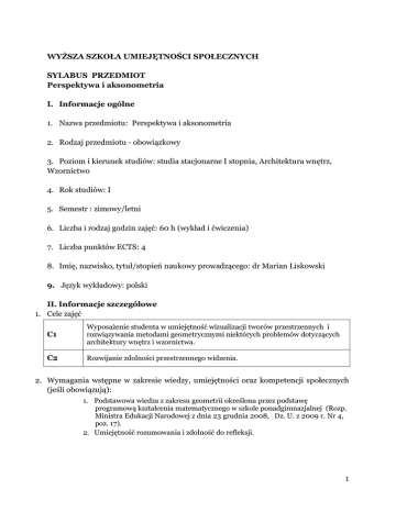 WYŻSZA SZKOŁA UMIEJĘTNOŚCI SPOŁECZNYCH SYLABUS PRZEDMIOT Perspektywa i aksonometria I. Informacje ogólne 1. Nazwa przedmiotu: Perspektywa i aksonometria 2. Rodzaj przedmiotu - obowiązkowy 3. Poziom i kierunek studiów: studia stacjonarne I stopnia, Architektura wnętrz, Wzornictwo 4. Rok studiów: I 5. Semestr : zimowy/letni 6. Liczba i rodzaj godzin zajęć: 60 h (wykład i ćwiczenia) 7. Liczba punktów ECTS: 4 8. Imię, nazwisko, tytuł/stopień naukowy prowadzącego: dr Marian Liskowski 9. Język wykładowy: polski II. Informacje szczegółowe 1. Cele zajęć C1 Wyposażenie studenta w umiejętność wizualizacji tworów przestrzennych i rozwiązywania metodami geometrycznymi niektórych problemów dotyczących architektury wnętrz i wzornictwa. C2 Rozwijanie zdolności przestrzennego widzenia. 2. Wymagania wstępne w zakresie wiedzy, umiejętności oraz kompetencji społecznych (jeśli obowiązują): 1. Podstawowa wiedza z zakresu geometrii określona przez podstawę programową kształcenia matematycznego w szkole ponadgimnazjalnej (Rozp. Ministra Edukacji Narodowej z dnia 23 grudnia 2008, Dz. U. z 2009 r. Nr 4, poz. 17). 2. Umiejętność rozumowania i zdolność do refleksji. 1 3. Efekty kształcenia w zakresie wiedzy, umiejętności oraz kompetencji społecznych Efekty kształcenia w odniesieniu do wiedzy Symbol Opis efektów kształcenia efektu kształcenia EK1 Student zna zasady przedstawiania tworów przestrzennych na płaszczyźnie metodą rzutowania prostokątnego na dwie rzutnie wzajemnie prostopadłe. EK2 Student zna zasady czytania rysunków otrzymanych w/w metodą. EK3 Student zna technikę wyznaczania przekrojów wielościanów, rozwijania ich powierzchni oraz konstruowania linii przenikania między wielościanami. EK4 Student zna zasady przedstawiania tworów przestrzennych na płaszczyźnie metodą rzutowania aksonometrycznego. EK5 Student zna zasady przedstawiania tworów przestrzennych na płaszczyźnie metodą rzutowania perspektywicznego (perspektywa pośrednia). Efekty kształcenia w odniesieniu do umiejętności Symbol Opis efektów kształcenia efektu kształcenia EK6 Student potrafi przedstawić na płaszczyźnie w sposób jednoznaczny obserwowane lub powstające w wyobraźni twory geometryczne. EK7 Student potrafi odtwarzać (lub wyobrażać sobie) twór przestrzenny na podstawie jego płaskiego obrazu. EK8 Student potrafi konstruować przekroje, linie przenikania i rozwinięcia powierzchni wielościanów. EK9 Student potrafi wykonywać rysunki poglądowe tworów przestrzennych metodą rzutu aksonometrycznego i metodą rzutu perspektywicznego. Efekty kształcenia w odniesieniu do kompetencji społecznych Symbol efektu kształcenia Opis efektów kształcenia EK10 Student jest świadomy znaczenia rysunku technicznego jako sposobu komunikowania się. EK11 Student ma nawyk dokładnego i starannego wykonywania rysunków (graficznego wyrażania myśli) i krytycznej oceny geometrycznych rozwiązań stawianych przed nim problemów. 2 4. Treści programowe Symbol Opis treści programowych treści programowych TP1 Rzutowanie prostokątne punktu, prostej i płaszczyzny na dwie rzutnie wzajemnie prostopadłe. TP2 Obrazowanie relacji zachodzących między punktem, prostą i płaszczyzną. TP3 Przekroje i rozwinięcia wielościanów. TP4 Przenikania wielościanów. TP5 Aksonometrie prostokątne i ukośne. TP6 Perspektywa pośrednia. Odniesienie do efektów kształcenia dla przedmiotu (symbol efektów) EK1, EK6 EK2, EK6, EK7, EK10 EK2, EK3, EK6, EK7 EK2, EK3, EK8, EK10 EK2, EK4, EK9, EK10 EK2, EK5, EK9, EK11 5. Literatura podstawowa: 1. B. Grochowski, Geometria wykreślna z perspektywą stosowaną, Wydawnictwo Naukowe PWN, 2010 2. W. Mierzejewski, Geometria wykreślna, Oficyna Wydawnicza Politechniki Warszawskiej, 2006 dodatkowa: 1. W. Jankowski, Geometria wykreślna, Wydawnictwo Politechniki Poznańskiej, 1999 6. Informacja o przewidywanej możliwości wykorzystania e-learningu Nie przewiduje się. 3 7. Odniesienie efektów kształcenia przedmiotu do efektów kształcenia ustalonych dla obszaru kształcenia Symbol Symbol efektu efektu kształcenia kształcenia w obszarze dla przedmiotu kształcenia w zakresie sztuki EK1 A1_W10, A1_W13 EK2 A1_W10, A1_W13 EK3 A1_W10 EK4 A1_W10, A1_W13 EK5 A1_W10, A1_W13 EK6 A1_U14, A1_U15, A1_U18 EK7 A1_U18, A1_U21 EK8 A1_U14, A1_U15, A1_U21 EK9 A1_U14,A1_U15, A1_U17, A1_U21 EK10 A1_K01, A1_K03 EK11 A1_K02, A1_K04 8. Kalkulacja nakładu pracy studenta Symbol Opis stosowanych form aktywności efektu umożliwiające osiągniecie założonych kształcenia efektów kształcenia dla przedmiotu EK1 Wykład, ćwiczenia audytoryjne, praca własna EK2 Wykład, ćwiczenia audytoryjne, praca własna EK3 Wykład, ćwiczenia audytoryjne, praca własna EK4 Wykład, ćwiczenia audytoryjne, praca własna EK5 Wykład, ćwiczenia audytoryjne, praca własna EK6 Wykład, ćwiczenia audytoryjne, praca własna EK7 Wykład, ćwiczenia audytoryjne, praca własna EK8 Wykład, ćwiczenia audytoryjne, praca własna EK9 Wykład, ćwiczenia audytoryjne, praca własna EK10 Wykład, ćwiczenia audytoryjne, praca własna Przygotowanie do egzaminu, egzamin Suma godzin Liczba punktów ECTS dla przedmiotu Szacunkowa liczba godzin poświęcona na daną aktywność 2+2+4 4+2+4 4+2+4 6+2+4 6+2+4 0+2+2 0+2+2 2+8+12 0+12+15 2+0+0 7+2 120 4 4 9. Kryteria i metody oceny realizacji zamierzonych efektów kształcenia. Zaliczenie I semestru odbywa się na podstawie kolokwium sprawdzającego umiejętności praktyczne dotyczące rysowania rzutów prostokątnych obiektów geometrycznych, czytania rzutów, wykonywania przekrojów i linii przenikania wielościanów oraz rozwinięć wielościanów. Kolokwium oceniane jest w systemie punktowym na skali 0-20 punktów. Zaliczenie II semestru odbywa się na podstawie egzaminu sprawdzającego wiedzę dotyczącą zasad i metod wykonywania rzutu aksonometrycznego, rzutu perspektywicznego (perspektywa pośrednia) oraz praktycznych umiejętno