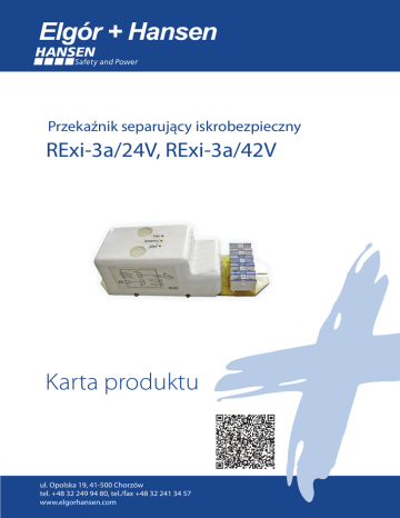 Przekaźnik separujący iskrobezpieczny RExi-3a/24V, RExi-3a/42V Karta produktu ul. Opolska 19, 41-500 Chorzów tel. +48 32 249 94 80, tel./fax +48 32 241 34 57 www.elgorhansen.com CECHY CHARAKTERYSTYCZNE Przekaźnik separujący iskrobezpieczny typu RExi-3a/24V, RExi-3a/42V służy do galwanicznego oddzielenia obwodów iskrobezpiecznych od obwodów nieiskrobezpiecznych sterowanych elementami stykowymi. Może być wykorzystany do zdalnego sterowania elektrycznych urządzeń górniczych z pulpitów sterowniczych lub przycisków dopuszczonego typu wyposażonych w diodę prostowniczą. Iskrobezpieczny obwód sterujący przekaźnika zapewnia wyłączenie i blokowanie przy: • zwarciu obwodu sterowniczego, • przerwie w obwodzie sterowniczym, • wzroście rezystancji pętli sterowania ponad wartość krytyczną, • obniżeniu rezystancji izolacji między żyłami sterowniczymi. Przekaźnik separujący przewidziany jest do zabudowy zarówno w ognioszczelnych przedziałach głównych i/lub przyłączeniowych urządzeń górniczych. Przekaźniki RExi-3a/24V oraz RExi-3a/42V różnią się między sobą jedynie wielkością napięcia zasilającego i zastępują wcześniejsze wykonania przekaźników separujących typu RExi-2 i RExi-3. Przekaźnik separujący typu RExi-3a/24V i RExi-3a/42V, będąc elementem wchodzącym w skład iskrobezpiecznego obwodu sterującego, może być stosowany tylko w urządzeniu (obwodzie), które posiada certyfikat stwierdzający zgodność wykonania z wymaganiami norm. Przekaźnik RExi-3a/24V i RExi-3a/42V może: • współpracować wyłącznie z iskrobezpiecznym obwodem zdalnego sterowania. Parametry wyjściowe przekaźnika (zaciski 4 - 5): Uo=16,8V Io=17,3 mA Po = 72 mW Co=0,5 μF Lo=10 mH • współpracować z iskrobezpiecznymi obwodami. Parametry elektryczne tych obwodów (zaciski 1-2 -6 oraz 8-9-10): Ui = 60 V, Ii = 1,5A • współpracować z obwodami nieiskrobezpiecznymi o maksymalnym napięciu skutecznym Um=250 V Im = 5 A (zaciski 15-16-17 oraz 18-20) • być zasilany prądem przemiennym o napięciu: RExi-3a/24 V: 20,4 V÷28,8 V (zaciski 12-13) RExi-3a/42 V: 35,7 V÷50,4 V (zaciski 12-13) BUDOWA W górnej części przekaźnika separującego widoczne są trzy diody świecące LED z umieszczonymi obok napisami: • PK1 (kolor zielony): sygnalizuje zadziałanie przekaźnika PK1, • ZASILANIE (kolor żółty): sygnalizuje przyłączenie napięcia zasilającego i gotowość do pracy, • PK2 (kolor zielony): sygnalizuje zadziałanie przekaźnika Pk2. Z boku umieszczona jest tabliczka przedstawiająca w sposób schematyczny zaciski przyłączeniowe oraz ich opis. Ze względu na sposób mocowania oraz wyprowadzenia obwodów iskrobezpiecznych rozróżnia się trzy rodzaje wykonań: 01, 02 lub 03. CECHA BUDOWY PRZECIWWYBUCHOWEJ I (M1) [Ex ia Ma] I 1453 Certyfikat badania typu WE: FTZÚ 05 ATEX 0127X/5 www.elgorhansen.com Przekaźnik separujący iskrobezpieczny RExi-3a/24V, RExi-3a/42V DANE TECHNICZNE Typy RExi-3a/24V RExi-3a/42V Napięcie zasilające: RExi-3a/24V 24V, 50Hz RExi-3a/42V 42V, 50Hz Tolerancja napięcia zasilającego 0,85÷1,2UN Pobór mocy do 5VA Rezystancja szeregowa wyłączania Rw 570±30Ω Rezystancja szeregowa blokowania Rb 300÷500Ω Napięcie wyjściowe obwodu sterującego iskrobezpiecznego 15V, 133Hz (±10Hz) Prąd wyjściowy obwodu sterującego iskrobezpiecznego 15mA Rezystancja izolacji obwodu sterującego > 2000Ω Maks. pojemność obwodu sterującego iskrobezpiecznego 0,5μF Czas zadziałania członu podstawowego (Pk1) ≤ 150ms Czas powrotu członu podstawowego (PK1) przy: przerwaniu lub zwarciu obwodu sterującego ≤ 80ms zaniku napięcia zasilania ≤ 20ms wzroście rezystancji obwodu ster. do wartości Rw ≤ 20ms obniżeniu rezystancji izolacji do 2 kΩ ≤ 1000ms Czas zadziałania i powrotu członu pomocniczego (Pk2) ≤ 100ms Dane zestyków: człon podstawowy (przekaźnik Pk1) 5 A/250VAC - człon pomocniczy (przekaźnik Pk2) 1 A/42VAC Wibracje sinusoidalne 10÷150Hz, amplituda 0,75 mm Położenie w czasie pracy dowolne Stopień ochrony obudowy IP 00 Wymiary 240x82x75 mm Masa ~ 1,6kg Warunki pracy: Przekaźniki separujące typu RExi-3a/24V oraz RExi-3a/42V są przystosowane do pracy w następujących warunkach środowiskowych: temperatura otoczenia: -5ºC÷70ºC wilgotność powietrza: 93% w temp. 35ºC pozycja pracy: dowolna - napięcie eksploatacyjne: 0,85÷1,2 UN Przekaźniki powinny być przechowywane w pomieszczeniach zamkniętych. ul. Opolska 19, 41-500 Chorzów tel. +48 32 249 94 80, tel./fax +48 32 241 34 57 www.elgorhansen.com