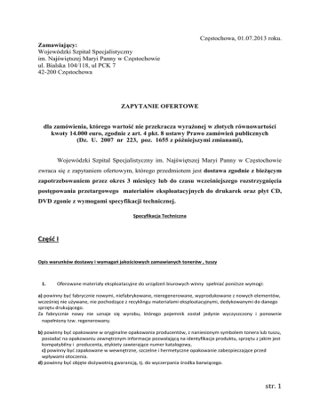 Częstochowa, 01.07.2013 roku. Zamawiający: Wojewódzki Szpital Specjalistyczny im. Najświętszej Maryi Panny w Częstochowie ul. Bialska 104/118, ul PCK 7 42-200 Częstochowa ZAPYTANIE OFERTOWE dla zamówienia, którego wartość nie przekracza wyrażonej w złotych równowartości kwoty 14.000 euro, zgodnie z art. 4 pkt. 8 ustawy Prawo zamówień publicznych (Dz. U. 2007 nr 223, poz. 1655 z późniejszymi zmianami), Wojewódzki Szpital Specjalistyczny im. Najświętszej Maryi Panny w Częstochowie zwraca się z zapytaniem ofertowym, którego przedmiotem jest dostawa zgodnie z bieżącym zapotrzebowaniem przez okres 3 miesięcy lub do czasu wcześniejszego rozstrzygnięcia postępowania przetargowego materiałów eksploatacyjnych do drukarek oraz płyt CD, DVD zgonie z wymogami specyfikacji technicznej. Specyfikacja Techniczna Część I Opis warunków dostawy i wymagań jakościowych zamawianych tonerów , tuszy 1. Oferowane materiały eksploatacyjne do urządzeń biurowych winny spełniać poniższe wymogi: a) powinny być fabrycznie nowymi, niefabrykowane, nieregenerowane, wyprodukowane z nowych elementów, wcześniej nie używane, nie pochodzące z recyklingu materiałami eksploatacyjnymi, dedykowanymi do danego sprzętu drukującego. Za fabrycznie nowy nie uznaje się wyrobu, którego pojemnik został jedynie wyczyszczony i ponownie napełniony tzw. regenerowany. b) powinny być opakowane w oryginalne opakowania producentów, z naniesionym symbolem tonera lub tuszu, posiadać na opakowaniu zewnętrznym informacje pozwalającą na identyfikacje produktu, sprzętu z jakim jest kompatybilny i producenta, etykiety zawierające numer katalogowy, c) powinny być zapakowane w wewnętrzne, szczelne i hermetyczne opakowanie zabezpieczające przed wpływami otoczenia. d) powinny być objęte dożywotnią gwarancją, tj. do wyczerpania środka barwiącego. str. 1 e) Poprzez określenie „oryginalne” należy rozumieć materiały eksploatacyjne wyprodukowane od podstaw przez odpowiedniego producenta sprzętu drukującego i kopiującego, które zostały opracowane razem ze sprzętem i nośnikami w celu zapewnienia optymalnej jakości druku, wydajności i niezawodności sprzętu. 2. Pod pojęciem „fabrycznie nowe” Zamawiający rozumie produkty wykonane z nowych elementów, bez śladów uszkodzenia, w oryginalnych opakowaniach producenta, z widocznym logo, symbolem produktu, posiadające wszelkie zabezpieczenia szczelności zbiorników z tonerem. Za fabrycznie nowe Zamawiający nie uzna produktu, w którym pojemnik został jedynie ponownie napełniony. 3. Wykonawca ma prawo do zaoferowania materiałów eksploatacyjnych równoważnych pod warunkiem zapewnienia parametrów technicznych, co najmniej wydajności identycznej z parametrami tonerów i tuszy producentów wyrobów oryginalnych. 4. Zamawiający, dopuszczając zaoferowanie tuszy i tonerów równoważnych rozumie produkt kompatybilny ze sprzętem, do którego wyrób jest dedykowany, o parametrach takich samych bądź lepszych (pojemność tonera/atramentu, wydajność i jakość wydruku) jak tonery i tusze oryginalne. 5. Zamawiający dopuszcza zaoferowanie materiałów równoważnych opisanych w SIWZ. Oferowane materiały eksploatacyjne mają być nowe, sprawne technicznie, bezpieczne, kompletne i gotowe do pracy. Przez materiał eksploatacyjny równoważny Zamawiający rozumie produkt o parametrach nie gorszych niż wskazane powyżej oraz: a) fabrycznie nowy, nie regenerowany, pochodzący z bieżącej produkcji, wytworzony seryjnie w cyklu produkcyjnym zgodnym z normą ISO 9001 oraz ISO 14001 lub normami równoważnymi; b) opakowany hermetycznie, nie noszący śladów uszkodzeń zewnętrznych oraz używania, c) którego wydajność, zgodnie z normami: - ISO/IEC 19752 dla zamienników kaset z tonerem do drukarek monochromatycznych, - ISO/IEC 19798 dla zamienników kaset z tonerem do kolorowych drukarek laserowych, - ISO/IEC 24711 dla zamienników wkładów drukujących, - ISO/IEC 24712 dla zamienników nabojów kolorowych do drukarek atramentowych, lub równoważnymi, jest co najmniej taka jak materiału oryginalnego zalecanego przez producentów sprzętu, d) który zapewnia jakość wydruku co najmniej taką, jak materiał oryginalny, zalecany przez producenta sprzętu, e) który nie ogranicza pełnej współpracy z programem sprzętu, monitorującym stan zasobników z tuszem lub tonerem f) który w żadnym stopniu nie narusza praw patentowych ani innych praw własności intelektualnej, g) w którym wszystkie części są nowe, w szczególności bęben światłoczuły, listwa podająca, listwa zbierająca, wałek magnetyczny, h) w którym zastosowano toner/ tusz dopasowany do pracy z danym urządzeniem. str. 2 - Wykonawca, który w ofercie powoła się na zastosowanie produktów równoważnych opisywanych w specyfikacji istotnych warunków zamówienia, jest zobowiązany wykazać, że oferowane przez niego produkty spełniają wymagania określone przez Zamawiającego. - Składając ofertę równoważną, Wykonawca zobowiązany jest dokonać odpowiedniej korekty formularza cenowego poprzez dodanie kolumny „Nazwa oferowanego towaru” i określenie w niej modelu oraz nazwy producenta produktu równoważnego, a także dołączenie do oferty opisu ze szczegółową specyfikacją, z której w sposób niebudzący wątpliwości winno wynikać, że oferowany materiał eksploatacyjny posiada takie same lub lepsze parametry techniczne, jakościowe, niż określone przez Zamawiającego, tj.: a) jest fabrycznie nowy, nie gorszej jakości niż produkt zalecany przez producenta sprzętu, b) posiada znak firmowy producenta oraz etykiety identyfikujące dany produkt, c) pojemność / wydajność (ilość uzyskanych kopii) jest nie mniejsza niż dla produktów oryginalnych, zgodnie z normami ISO/IEC 19752, ISO/IEC 24711, ISO/IEC 19798, ISO/IEC 24712 lub równoważnymi. (Do oferty wymagane jest załączenie stosownych dokumentów tj. zaświadczenia