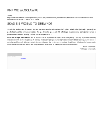 KMP WE WŁOCŁAWKU Źródło: http://www.wloclawek.kujawsko-pomorska.policja.gov.pl/kb4/informacje/wiadomosci/8229,Skad-sie-wzielo-to-drewno.html Wygenerowano: Piątek, 3 marca 2017, 15:48 SKĄD SIĘ WZIĘŁO TO DREWNO? Skąd się wzięło to drewno? Na to pytanie może odpowiedzieć tylko właściciel jednej z posesji w podwłocławskiej miejscowości. Na podwórku posesji 30-letniego mężczyzny policjanci wraz z przedstawicielami Straży Leśnej ujawnili ponad 5 ... Skąd się wzięło to drewno? Na to pytanie może odpowiedzieć tylko właściciel jednej z posesji w podwłocławskiej miejscowości. Na podwórku posesji 30-letniego mężczyzny policjanci wraz z przedstawicielami Straży Leśnej ujawnili ponad 5 metrów sześciennych różnego rodzaju drewna. Okazało się, że drewno to zostało skradzione. Była to m.in. brzoza, dąb, sosna. Drewno o wartości ponad 900 złotych zostało skradzione na szkodę Nadleśnictwa Włocławek. Autor: kmpw.red1 Publikacja: kmpw.red1 Ocena: 0/5 (0) Tweetnij