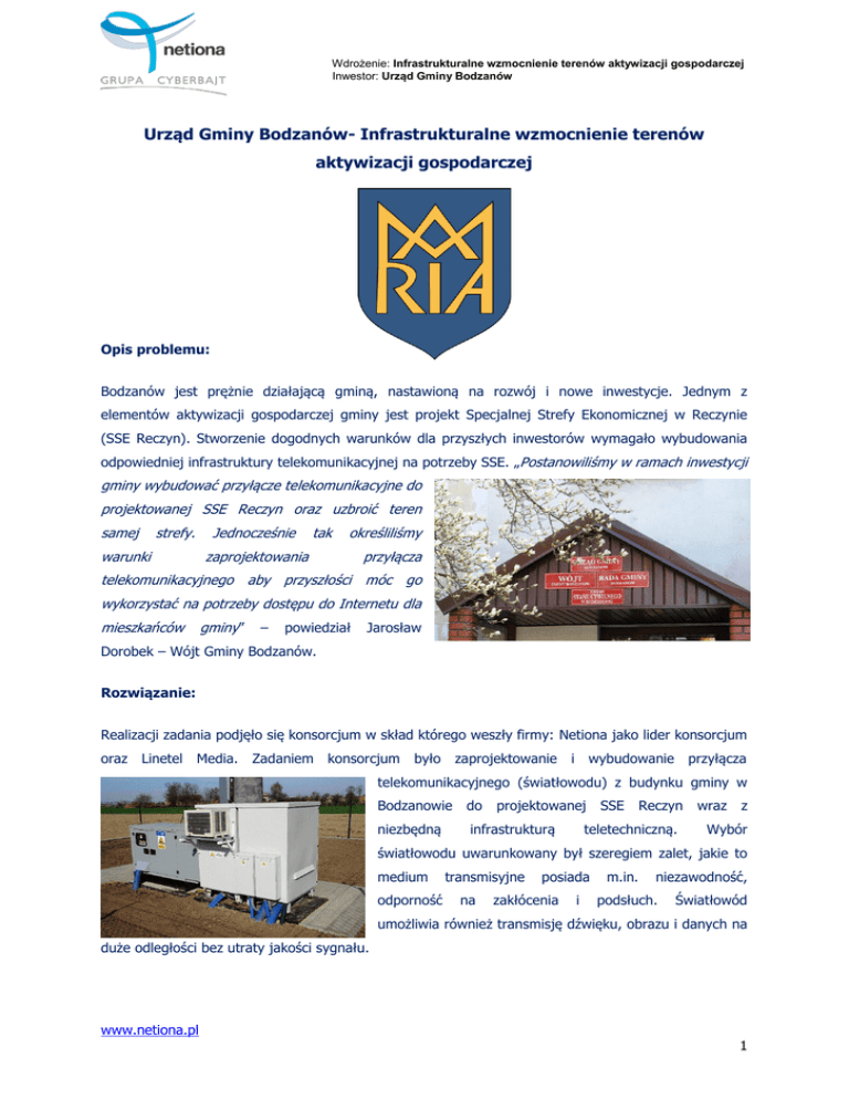 Wdrożenie: Infrastrukturalne wzmocnienie terenów aktywizacji gospodarczej Inwestor: Urząd Gminy Bodzanów Urząd Gminy Bodzanów- Infrastrukturalne wzmocnienie terenów aktywizacji gospodarczej Opis problemu: Bodzanów jest prężnie działającą gminą, nastawioną na rozwój i nowe inwestycje. Jednym z elementów aktywizacji gospodarczej gminy jest projekt Specjalnej Strefy Ekonomicznej w Reczynie (SSE Reczyn). Stworzenie dogodnych warunków dla przyszłych inwestorów wymagało wybudowania odpowiedniej infrastruktury telekomunikacyjnej na potrzeby SSE. „Postanowiliśmy w ramach inwestycji gminy wybudować przyłącze telekomunikacyjne do projektowanej SSE Reczyn oraz uzbroić teren samej strefy. warunki Jednocześnie tak określiliśmy zaprojektowania przyłącza telekomunikacyjnego aby przyszłości móc go wykorzystać na potrzeby dostępu do Internetu dla mieszkańców gminy” – powiedział Jarosław Dorobek – Wójt Gminy Bodzanów. Rozwiązanie: Realizacji zadania podjęło się konsorcjum w skład którego weszły firmy: Netiona jako lider konsorcjum oraz Linetel Media. Zadaniem konsorcjum było zaprojektowanie i wybudowanie przyłącza telekomunikacyjnego (światłowodu) z budynku gminy w Bodzanowie do projektowanej niezbędną infrastrukturą SSE Reczyn teletechniczną. wraz z Wybór światłowodu uwarunkowany był szeregiem zalet, jakie to medium odporność transmisyjne na posiada zakłócenia i m.in. niezawodność, podsłuch. Światłowód umożliwia również transmisję dźwięku, obrazu i danych na duże odległości bez utraty jakości sygnału. www.netiona.pl 1 Wdrożenie: Infrastrukturalne wzmocnienie terenów aktywizacji gospodarczej Inwestor: Urząd Gminy Bodzanów Trasa przyłącza została poprowadzona w taki sposób aby przechodzić przez okoliczne miejscowości. Na całej trasie wykonano teletechniczną. trzyotworową Dodatkowo, w kanalizację obszarach zabudowanych, kanalizacja została wyposażona w czwarty otwór teletechniczny przeznaczony na potrzeby lokalnego dostępu do Internetu. Taki przebieg i budowa kanalizacji teletechnicznej zapewnia odpowiednią nadmiarowość i pozwoli na elastyczne wykorzystanie powstałej infrastruktury w przyszłości. Jednocześnie umożliwi podłączenie kabla światłowodowego do każdego gospodarstwa domowego wzdłuż trasy przyłącza. Oprócz przyłącza telekomunikacyjnego wybudowano również dwie wieże telekomunikacyjne (25 i 20 metrów) przystosowane do instalacji urządzeń radiowych. Wieże usytuowano w takich lokalizacjach, aby umożliwić wykonanie radiowego łącza zapasowego dla światłowodu. W przypadku uszkodzenia kanalizacji teletechnicznej i światłowodu, łącze radiowe zapewni nieprzerwaną pracę systemu. Jednocześnie wieże pozwalają na pokrycie terenu gminy zasięgiem sieci bezprzewodowej. Umożliwi to dostarczenie bezprzewodowego dostęp do Internetu dla mieszkańców całej gminy. Teren, na którym wybudowano wieże został tak zagospodarowany aby umożliwić łatwą rozbudowę. Na granicy projektowanej SSE Reczyn wybudowano kontener teletechniczny. Kontener został przygotowany do roli punktu dystrybucyjnego, do którego zostaną podłączone wszystkie obiekty na terenie projektowanej SSE Reczyn. Wszystkie punkty zostały wyposażone w systemy zasilania awaryjnego. Instalacje elektryczne zabezpieczone są za pomocą zasilaczy awaryjnych (o mocy 20kVA). Dodatkowo wszystkie punkty wyposażono w agregaty prądotwórcze (o mocy 45kVA), które zapewniają zasilanie w przypadku dłuższego zaniku zasilania w sieci energetycznej. Cała infrastruktura wyposażona została w system nadzoru monitorujący pracę urządzeń oraz system kontroli dostępu zapewniający bezpieczeństwo fizyczne i ochronę przed wandalizmem. www.netiona.pl 2 Wdrożenie: Infrastrukturalne wzmocnienie terenów aktywizacji gospodarczej Inwestor: Urząd Gminy Bodzanów Rezultat: Wybudowany przez konsorcjum Netiona i Linetel Media światłowód wraz z towarzyszącą infrastrukturą teletechniczną zapewnił projektowanej Specjalnej Strefie Ekonomicznej w Reczynie dostęp do mediów telekomunikacyjnych. Inwestor dysponuje własną infrastrukturą, która pozwala na elastyczne świadczenie usług telekomunikacyjnych zarówno firmom na terenie przyszłej SSE jak i mieszkańcom gminy. „Wybudowana infrastruktura teletechniczna pozwoli w przyszłości na łatwą, szybką i tanią dalszą informatyzację gminy Bodzanów. Wykonane przez gminę inwestycje podniosły atrakcyjność gospodarczą gminy stwarzając przyjazne warunki dla inwestorów. Liczymy, że będzie to miało istotny wpływ na wzrost liczby miejsc pracy.” – powiedział Jarosław Dorobek. Gmina Bodzanów Gmina wiejska położona w środkowo-zachodniej części województwa mazowieckiego, na terenie powiatu płockiego. Cały region charakteryzuje duża atrakcyjność inwestycyjna ze względu na dobry stan środowiska, atrakcyjne położenie w pobliżu Płocka i dogodne powiązania komunikacyjne (droga krajowa nr 62 Warszawa-Włocławek). Na terenie gminy znajdują się liczne obiekty zabytkowe i pomniki przyrody objęte ochroną konserwatora. Gmina Bodzanów to obszar o wyjątkowo atrakcyjnych walorach turystycznych. Występują tu liczne krajobrazy nadwiślańskie, pomniki przyrody, miejsca pamięci narodowej, różnorodne drzewostany leśne, grodziska średniowieczne. Część gminy położona jest na terenie Nadwiślańskiego Obszaru Krajobrazu Chronionego. www.netiona.pl 3 Wdrożenie: Infrastrukturalne wzmocnienie terenów aktywizacji gospodarczej Inwestor: Urząd Gminy Bodzanów Netiona Netiona jest dostawcą i integratorem rozwiązań informatycznych. Dostarcza urządzenia i systemy na potrzeby sieci miejskich, przemysłowych, biurowych, hotspotów oraz wydajnych łączy punkt-punkt. Świadczy usługi projektowania, budowy i integracji zaawansowanych rozwiązań sieciowych między innymi w technologiach takich jak: WiMAX, LTE, GPON. Zajmuje się budową 