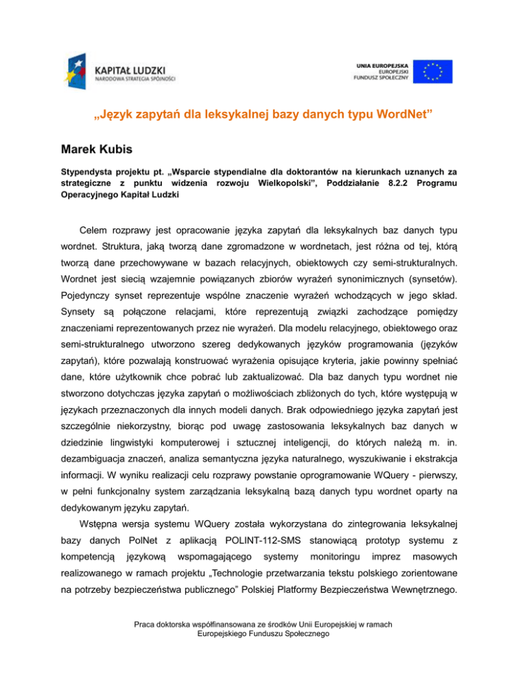„Język zapytań dla leksykalnej bazy danych typu WordNet” Marek Kubis Stypendysta projektu pt. „Wsparcie stypendialne dla doktorantów na kierunkach uznanych za strategiczne z punktu widzenia rozwoju Wielkopolski”, Poddziałanie 8.2.2 Programu Operacyjnego Kapitał Ludzki Celem rozprawy jest opracowanie języka zapytań dla leksykalnych baz danych typu wordnet. Struktura, jaką tworzą dane zgromadzone w wordnetach, jest różna od tej, którą tworzą dane przechowywane w bazach relacyjnych, obiektowych czy semi-strukturalnych. Wordnet jest siecią wzajemnie powiązanych zbiorów wyrażeń synonimicznych (synsetów). Pojedynczy synset reprezentuje wspólne znaczenie wyrażeń wchodzących w jego skład. Synsety są połączone relacjami, które reprezentują związki zachodzące pomiędzy znaczeniami reprezentowanych przez nie wyrażeń. Dla modelu relacyjnego, obiektowego oraz semi-strukturalnego utworzono szereg dedykowanych języków programowania (języków zapytań), które pozwalają konstruować wyrażenia opisujące kryteria, jakie powinny spełniać dane, które użytkownik chce pobrać lub zaktualizować. Dla baz danych typu wordnet nie stworzono dotychczas języka zapytań o możliwościach zbliżonych do tych, które występują w językach przeznaczonych dla innych modeli danych. Brak odpowiedniego języka zapytań jest szczególnie niekorzystny, biorąc pod uwagę zastosowania leksykalnych baz danych w dziedzinie lingwistyki komputerowej i sztucznej inteligencji, do których należą m. in. dezambiguacja znaczeń, analiza semantyczna języka naturalnego, wyszukiwanie i ekstrakcja informacji. W wyniku realizacji celu rozprawy powstanie oprogramowanie WQuery - pierwszy, w pełni funkcjonalny system zarządzania leksykalną bazą danych typu wordnet oparty na dedykowanym języku zapytań. Wstępna wersja systemu WQuery została wykorzystana do zintegrowania leksykalnej bazy danych PolNet z aplikacją POLINT-112-SMS stanowiącą prototyp systemu z kompetencją językową wspomagającego systemy monitoringu imprez masowych realizowanego w ramach projektu „Technologie przetwarzania tekstu polskiego zorientowane na potrzeby bezpieczeństwa publicznego” Polskiej Platformy Bezpieczeństwa Wewnętrznego. Praca doktorska współfinansowana ze środków Unii Europejskiej w ramach Europejskiego Funduszu Społecznego Pełna wersja systemu WQuery (stanowiąca rezultat rozprawy doktorskiej) będzie mogła zostać wykorzystana w analogiczny sposób przez instytucje naukowe i przedsiębiorstwa z regionu Wielkopolski jako element składowy systemów analizy języka, chatterbotów, systemów ekstrakcji informacji oraz innych aplikacji wymagających dostępu do danych zgromadzonych w leksykalnych bazach danych typu wordnet. Planowane jest m. in. wdrożenie pełnej wersji systemu WQuery w kolejnych fazach projektu POLINT-CITTA-SMS: CITy Tour Assistant przeznaczonego do usprawnienia obsługi turystycznej w Poznaniu. Przygotowane w ramach rozprawy doktorskiej oprogramowanie będzie można również zastosować jako samodzielne narzędzie do rozwijania danych leksykalnych w obrębie wielkopolskich przedsiębiorstw np. w procesie konstrukcji semantycznych katalogów produktów wspomagających wyszukiwanie informacji na firmowych stronach www. Wdrożenie gotowego systemu zarządzania leksykalnymi bazami danych typu wordnet (analogicznie jak w przypadku systemów zarządzania bazami danych innych typów) wiąże się z poniesieniem niższych nakładów finansowych przez przedsiębiorstwo niż w przypadku budowania systemu tego typu od podstaw. Praca doktorska współfinansowana ze środków Unii Europejskiej w ramach Europejskiego Funduszu Społecznego