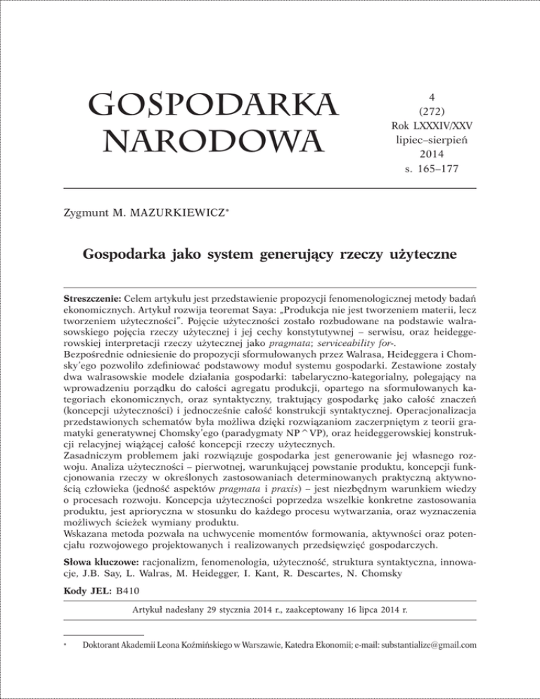 165 Zygmunt M. Mazurkiewicz, Gospodarka jako system generujący rzeczy użyteczne Gospodarka narodowa 4 (272) Rok LXXXIV/XXV lipiec–sierpień 2014 s. 165–177 Zygmunt M. MAZURKIEWICZ* Gospodarka jako system generujący rzeczy użyteczne Streszczenie: Celem artykułu jest przedstawienie propozycji fenomenologicznej metody badań ekonomicznych. Artykuł rozwija teoremat Saya: „Produkcja nie jest tworzeniem materii, lecz tworzeniem użyteczności”. Pojęcie użyteczności zostało rozbudowane na podstawie walra‑ sowskiego pojęcia rzeczy użytecznej i jej cechy konstytutywnej – serwisu, oraz heidegge‑ rowskiej interpretacji rzeczy użytecznej jako pragmata; serviceability for-. Bezpośrednie odniesienie do propozycji sformułowanych przez Walrasa, Heideggera i Chom‑ sky’ego pozwoliło zdefiniować podstawowy moduł systemu gospodarki. Zestawione zostały dwa walrasowskie modele działania gospodarki: tabelaryczno‑kategorialny, polegający na wprowadzeniu porządku do całości agregatu produkcji, opartego na sformułowanych ka‑ tegoriach ekonomicznych, oraz syntaktyczny, traktujący gospodarkę jako całość znaczeń (koncepcji użyteczności) i jednocześnie całość konstrukcji syntaktycznej. Operacjonalizacja przedstawionych schematów była możliwa dzięki rozwiązaniom zaczerpniętym z teorii gra‑ matyki generatywnej Chomsky’ego (paradygmaty NP^VP), oraz heideggerowskiej konstruk‑ cji relacyjnej wiążącej całość koncepcji rzeczy użytecznych. Zasadniczym problemem jaki rozwiązuje gospodarka jest generowanie jej własnego roz‑ woju. Analiza użyteczności – pierwotnej, warunkującej powstanie produktu, koncepcji funk‑ cjonowania rzeczy w określonych zastosowaniach determinowanych praktyczną aktywno‑ ścią człowieka (jedność aspektów pragmata i praxis) – jest niezbędnym warunkiem wiedzy o procesach rozwoju. Koncepcja użyteczności poprzedza wszelkie konkretne zastosowania produktu, jest aprioryczna w stosunku do każdego procesu wytwarzania, oraz wyznaczenia możliwych ścieżek wymiany produktu. Wskazana metoda pozwala na uchwycenie momentów formowania, aktywności oraz poten‑ cjału rozwojowego projektowanych i realizowanych przedsięwzięć gospodarczych. Słowa kluczowe: racjonalizm, fenomenologia, użyteczność, struktura syntaktyczna, innowa‑ cje, J.B. Say, L. Walras, M. Heidegger, I. Kant, R. Descartes, N. Chomsky Kody JEL: B410 Artykuł nadesłany 29 stycznia 2014 r., zaakceptowany 16 lipca 2014 r. * Doktorant Akademii Leona Koźmińskiego w Warszawie, Katedra Ekonomii; e‑mail: [email protected] 166 GOSPODARKA NARODOWA nr 4/2014 Prezentowany artykuł postuluje wprowadzenie fenomenologii, czy raczej racjonalizmu w sensie Kartezjusza, Kanta i Heideggera oraz syntaksy zdefi‑ niowanej we wczesnych pracach Chomsky’ego [1957, 1964] jako konwencji rozumowania o gospodarce i sposobu jej analizy. Sformułowanie „innowacyjnego” w dziedzinie ekonomii postulatu metodo‑ logicznego stanowi cel tego artykułu. Źródła ontologiczne Gospodarka jako system generujący rzeczy użyteczne. Jaki jest sens takiego zdania? Żaden, dopóki nie zdefiniujemy kim jest człowiek i czym jest rzecz! Przyjmijmy, że człowiek jest racjonalistą. Większość ekonomistów zapewne zgo‑ dzi się z tak sformułowanym twierdzeniem. Racjonalista został zdefiniowany w 1641 r. jako ego cogito (poznanie, rozumienie), kiedy Renati Des‑Cartes wydaje po łacine traktat Meditationes De Prima Philosophia. Przyjmując taki początek, musimy dokonać wyboru dalszej tradycji interpretacyjnej i zamknąć ją określonym finalnym rozwinięciem. Martin Heidegger wydaje w 1927 r. opus magnum pt. Bycie i czas. Potrak‑ tujmy ten tekst, zgodnie z jego wewnętrzną logiką, wyraźnie wskazaną przez Autora, jako zagnieżdżone interpretacje: Kartezjusza, Kanta, oraz własną autor‑ ską propozycję. Mamy tu figurę podobną do „ruskiej matrioszki”, z tym jednak zastrzeżeniem, że nie wiemy która postać jest największa i w rezultacie która zawiera w sobie pozostałe. Heidegger zarzuca Kantowi, że tylko powtarza pozycję ontologiczną Kartezjusza i nie wykracza poza zakreślony przez niego horyzont. Tę uwagę można równie dobrze odnieść do Heideggera, zarówno do relacji Heidegger – Kartezjusz: Da‑sein jako rozumienie, jak i Heidegger – Kant: rzecz jako fenomen. Należy na marginesie zaznaczyć, że Heidegger wydaje w 1929 r. rozprawę pt. Kant a problem metafizyki. Książka ta stanowi rodzaj wprowadzenia, „przedmowy” do Bycia i czasu. Dokonajmy zdecydowanego „wyłomu” w tradycji filozoficznej: „weźmy” (z niej) Bycie i czas Heideggera i przeczytajmy tekst tak, jakby należał do tra‑ dycji ekonomicznej – „Codzienny kontekst używania rzeczy, ich historyczne powstawanie i wykorzystanie, ich rzeczywista rola w byciu Da‑sein, wszystko to jest przedmiotem nauki ekonomii.” [Heidegger, 1996, s. 330]. Niewątpliwie w ten sposób naruszamy pewien porządek klasyfikowania wiedzy, przynajmniej podręcznikowy. Naruszony stan rzeczy wymaga przywrócenia równowagi; „weźmy” zatem Jeana Baptistę Saya i przeczytajmy Traktat o ekonomii politycz‑ nej z 1803 r. jako działo z dziedziny ontologii, traktujące o trzech pierwszych pojęciach gospodarowania: użyteczności, wartości i wymianie. Dzięki takiemu zabiegowi będziemy mogli swobodnie dyskutować określone przedstawienia i międzydyscyplinarne powiązania pojęciowe [Say, 1960]. Zygmunt M. Mazurkiewicz, Gospodarka jako system generujący rzeczy użyteczne 167 Rzecz Narracja wyłącznie spekulatywna, pozbawiona odniesienia do prostego przykładu, szczególnie jeżeli prowadzona jest na zaledwie kilku stronach tek‑ stu, z punktu widzenia czytelnika stanowi nużącą i słabą argumentację. Od‑ wołajmy się więc do „kejsu”, który między innymi ma tę zaletę, że wskazuje na jedną z rzeczy produkowanych w gospodarce. Druga medytacja Kartezjańska jest