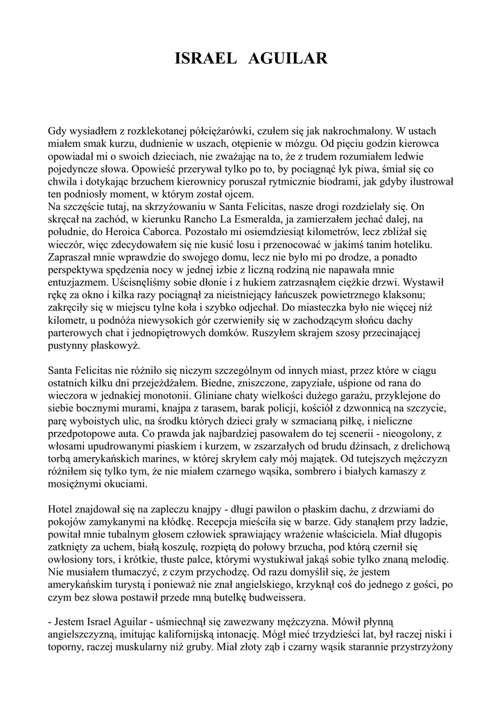 ISRAEL AGUILAR Gdy wysiadłem z rozklekotanej półciężarówki, czułem się jak nakrochmalony. W ustach miałem smak kurzu, dudnienie w uszach, otępienie w mózgu. Od pięciu godzin kierowca opowiadał mi o swoich dzieciach, nie zważając na to, że z trudem rozumiałem ledwie pojedyncze słowa. Opowieść przerywał tylko po to, by pociągnąć łyk piwa, śmiał się co chwila i dotykając brzuchem kierownicy poruszał rytmicznie biodrami, jak gdyby ilustrował ten podniosły moment, w którym został ojcem. Na szczęście tutaj, na skrzyżowaniu w Santa Felicitas, nasze drogi rozdzielały się. On skręcał na zachód, w kierunku Rancho La Esmeralda, ja zamierzałem jechać dalej, na południe, do Heroica Caborca. Pozostało mi osiemdziesiąt kilometrów, lecz zbliżał się wieczór, więc zdecydowałem się nie kusić losu i przenocować w jakimś tanim hoteliku. Zapraszał mnie wprawdzie do swojego domu, lecz nie było mi po drodze, a ponadto perspektywa spędzenia nocy w jednej izbie z liczną rodziną nie napawała mnie entuzjazmem. Uścisnęliśmy sobie dłonie i z hukiem zatrzasnąłem ciężkie drzwi. Wystawił rękę za okno i kilka razy pociągnął za nieistniejący łańcuszek powietrznego klaksonu; zakręciły się w miejscu tylne koła i szybko odjechał. Do miasteczka było nie więcej niż kilometr, u podnóża niewysokich gór czerwieniły się w zachodzącym słońcu dachy parterowych chat i jednopiętrowych domków. Ruszyłem skrajem szosy przecinającej pustynny płaskowyż. Santa Felicitas nie różniło się niczym szczególnym od innych miast, przez które w ciągu ostatnich kilku dni przejeżdżałem. Biedne, zniszczone, zapyziałe, uśpione od rana do wieczora w jednakiej monotonii. Gliniane chaty wielkości dużego garażu, przyklejone do siebie bocznymi murami, knajpa z tarasem, barak policji, kościół z dzwonnicą na szczycie, parę wyboistych ulic, na środku których dzieci grały w szmacianą piłkę, i nieliczne przedpotopowe auta. Co prawda jak najbardziej pasowałem do tej scenerii - nieogolony, z włosami upudrowanymi piaskiem i kurzem, w zszarzałych od brudu dżinsach, z drelichową torbą amerykańskich marines, w której skryłem cały mój majątek. Od tutejszych mężczyzn różniłem się tylko tym, że nie miałem czarnego wąsika, sombrero i białych kamaszy z mosiężnymi okuciami. Hotel znajdował się na zapleczu knajpy - długi pawilon o płaskim dachu, z drzwiami do pokojów zamykanymi na kłódkę. Recepcja mieściła się w barze. Gdy stanąłem przy ladzie, powitał mnie tubalnym głosem człowiek sprawiający wrażenie właściciela. Miał długopis zatknięty za uchem, białą koszulę, rozpiętą do połowy brzucha, pod którą czernił się owłosiony tors, i krótkie, tłuste palce, którymi wystukiwał jakąś sobie tylko znaną melodię. Nie musiałem tłumaczyć, z czym przychodzę. Od razu domyślił się, że jestem amerykańskim turystą i ponieważ nie znał angielskiego, krzyknął coś do jednego z gości, po czym bez słowa postawił przede mną butelkę budweissera. - Jestem Israel Aguilar - uśmiechnął się zawezwany mężczyzna. Mówił płynną angielszczyzną, imitując kalifornijską intonację. Mógł mieć trzydzieści lat, był raczej niski i toporny, raczej muskularny niż gruby. Miał złoty ząb i czarny wąsik starannie przystrzyżony w kącikach ust. Ostatni raz rozmawiałem po angielsku w Tijuanie, im dalej na południe, tym mniej spotyka się turystów - ucieszył mnie dźwięk znajomych słów. Przedstawiłem się i podałem mu dłoń. Uścisnął ją po męsku, bardzo po męsku. Oparł się łokciem o kontuar i przez chwilę przyglądał mi się w milczeniu, pocierając dłonią króciutką szczecinę na twarzy, po czym powiedział, jakby z cieniem wyrzutu w głosie: - Nie jesteś Amerykaninem. - Jestem Polakiem. - Polish, Polish... - zastanowił się głośno, na próżno usiłując przypomnieć sobie znaczenie tego słowa. Po chwili stwierdził z dość dużą pewnością: - To nie jest w Łacińskiej Ameryce. No tak, nie mówisz po hiszpańsku. - Polska to małe państwo w Europie, między Szwecją a Niemcami, volvo, mercedes. - Ach, Polska! Trzeba było tak od razu! - ucieszył się wyraźnie. - Papa Polacco, papieżPolak! Jose, Jose! - zwrócił się do ciągle stojącego naprzeciwko barmana i w paru słowach wyjaśnił, kim jestem. Jose poderwał się, oparł brzuch na ladzie i długo, po męsku potrząsał moją dłonią, a gdy skończył, podszedł do najbliższego regału i wyciągnął zeń duży, oprawiony w złocone ramy obraz papieża na placu Świętego Piotra. Stuknęliśmy się szyjkami butelek. Jose zasypał mnie pytaniami, które tłumaczył Israel. Nie, nie znam papieża osobiście. Matka Teresa z Kalkuty nie jest Polką, jest albańską Cyganką. Kalkuta nie leży w Polsce. W pewnej chwili zauważyłem, że Israel nie tłumaczył wszystkich pytań i momentami strofował ukradkiem Jose, w każdym razie robił minę na przemian groźną i zawstydzoną, po czym uśmiechał się do mnie niczym Judasz. Uwierały mnie buty i kleiła się do pleców koszula. Krótkimi łykami opróżniłem butelkę i poprosiłem Jose, by pokazał mi pokój. - W żadnym wypadku - zaprotestował Israel nie tłumacząc mojej prośby. - Dzisiaj jesteś moim gościem. Jose podał mi drugą butelkę, tym razem coronę. Patrzył na mnie nieomal z podziwem, szkoda tylko, że nie znam hiszpańskiego, tak jak papież. Po hiszpańsku powinni mówić wszyscy ludzie na całym świecie, to bardzo piękny język. Zaintonował jakąś ludową piosenkę, zapewne tę samą, którą wcześniej wystukiwał palcami. Odwiodło go od nas dopiero pojawienie się w sali nowego gościa. Israel, wziąwszy swoją butelkę w jedną rękę i moją torbę w drugą, poprowadził mnie do wyjścia. - Mieszkam za miastem, tam, na wzgórzu - wskazał palcem kierunek, gdy znaleźliśmy się na ulicy. Niebo na wschodzie było już gr