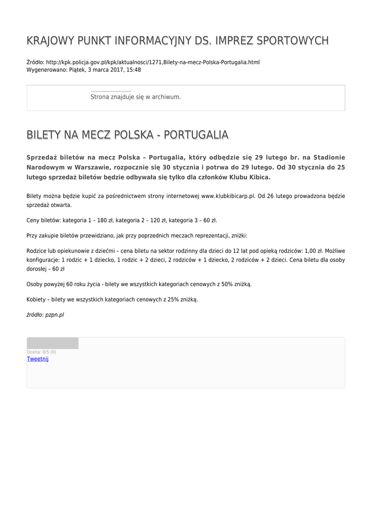 KRAJOWY PUNKT INFORMACYJNY DS. IMPREZ SPORTOWYCH Źródło: http://kpk.policja.gov.pl/kpk/aktualnosci/1271,Bilety-na-mecz-Polska-Portugalia.html Wygenerowano: Piątek, 3 marca 2017, 15:48 Strona znajduje się w archiwum. BILETY NA MECZ POLSKA - PORTUGALIA Sprzedaż biletów na mecz Polska – Portugalia, który odbędzie się 29 lutego br. na Stadionie Narodowym w Warszawie, rozpocznie się 30 stycznia i potrwa do 29 lutego. Od 30 stycznia do 25 lutego sprzedaż biletów będzie odbywała się tylko dla członków Klubu Kibica. Bilety można będzie kupić za pośrednictwem strony internetowej www.klubkibicarp.pl. Od 26 lutego prowadzona będzie sprzedaż otwarta. Ceny biletów: kategoria 1 – 180 zł, kategoria 2 – 120 zł, kategoria 3 – 60 zł. Przy zakupie biletów przewidziano, jak przy poprzednich meczach reprezentacji, zniżki: Rodzice lub opiekunowie z dziećmi – cena biletu na sektor rodzinny dla dzieci do 12 lat pod opieką rodziców: 1,00 zł. Możliwe konfiguracje: 1 rodzic + 1 dziecko, 1 rodzic + 2 dzieci, 2 rodziców + 1 dziecko, 2 rodziców + 2 dzieci. Cena biletu dla osoby dorosłej – 60 zł Osoby powyżej 60 roku życia - bilety we wszystkich kategoriach cenowych z 50% zniżką. Kobiety – bilety we wszystkich kategoriach cenowych z 25% zniżką. źródło: pzpn.pl Ocena: 0/5 (0) Tweetnij