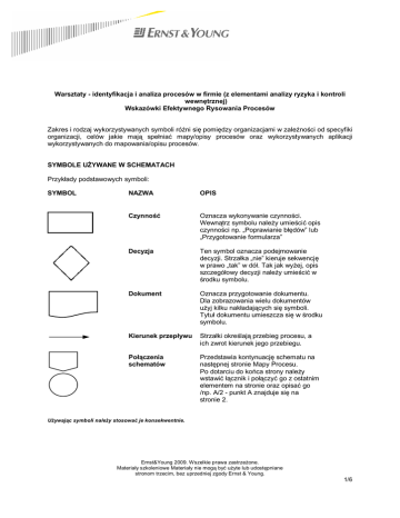 Warsztaty - identyfikacja i analiza procesów w firmie (z elementami analizy ryzyka i kontroli wewnętrznej) Wskazówki Efektywnego Rysowania Procesów Zakres i rodzaj wykorzystywanych symboli różni się pomiędzy organizacjami w zależności od specyfiki organizacji, celów jakie mają spełniać mapy/opisy procesów oraz wykorzystywanych aplikacji wykorzystywanych do mapowania/opisu procesów. SYMBOLE UŻYWANE W SCHEMATACH Przykłady podstawowych symboli: SYMBOL NAZWA OPIS Czynność Oznacza wykonywanie czynności. Wewnątrz symbolu należy umieścić opis czynności np. „Poprawianie błędów” lub „Przygotowanie formularza” Decyzja Ten symbol oznacza podejmowanie decyzji. Strzałka „nie” kieruje sekwencję w prawo „tak” w dół. Tak jak wyżej, opis szczegółowy decyzji należy umieścić w środku symbolu. Dokument Oznacza przygotowanie dokumentu. Dla zobrazowania wielu dokumentów użyj kilku nakładających się symboli. Tytuł dokumentu umieszcza się w środku symbolu. Kierunek przepływu Strzałki określają przebieg procesu, a ich zwrot kierunek jego przebiegu. Połączenia schematów Przedstawia kontynuację schematu na następnej stronie Mapy Procesu. Po dotarciu do końca strony należy wstawić łącznik i połączyć go z ostatnim elementem na stronie oraz opisać go /np. A/2 - punkt A znajduje się na stronie 2. Używając symboli należy stosować je konsekwentnie. Ernst&Young 2009. Wszelkie prawa zastrzeżone. Materiały szkoleniowe Materiały nie mogą być użyte lub udostępniane stronom trzecim, bez uprzedniej zgody Ernst & Young. 1/6 Przygotowując bardziej dokładny schemat, symbol czynności mogą być zastępowane przez bardziej specyficzne symbole, oznaczające: Ręczne wprowadzanie danych Zapisywanie danych Komputerowe archiwizowanie danych Czynność automatyczna (systemowa) Archiwizowanie danych w postaci papierowej Czynności wykonywane on-line Przygotowując dokładny schemat należy zebrać szczegółowe informacje na następujące tematy: · · · · · · Jakie czynności są wykonywane? Kto wykonuje jaką czynność? W jakiej kolejności są wykonywane czynności? Jakie formy raportów są używane? Jakie systemy komputerowe i pliki są wykorzystywane? Jakie decyzje podejmowane są podczas przebiegu procesów? Ernst&Young 2009. Wszelkie prawa zastrzeżone. Materiały szkoleniowe Materiały nie mogą być użyte lub udostępniane stronom trzecim, bez uprzedniej zgody Ernst & Young. 2/6 Dodatkowe wskazówki Poniżej przedstawione są wskazówki, które mogą być pomocne podczas przygotowywania własnego schematu. q Nazewnictwo źródeł i celów. Zawsze należy wprowadzić informację skąd i dokąd następuje przepływ informacji, dokumentów. Dział Sprzedaży Dział Zakupów q Ostrożne stosowanie strzałek. Jeśli strzałka musi przeciąć inną należy narysować je w sposób zaprezentowany poniżej (lub inny, umożliwiający śledzenie przepływu danych): Następny Proces Aktualny Proces q Numeracja symboli. Numerowanie symboli każdego procesu może być użyteczne przy wiązaniu symbolu z opisem umieszczonym w dokumentacji zawierającej opisy procesów. Ernst&Young 2009. Wszelkie prawa zastrzeżone. Materiały szkoleniowe Materiały nie mogą być użyte lub udostępniane stronom trzecim, bez uprzedniej zgody Ernst & Young. 3/6 q Łączenie symboli. Zawsze należy używać łączników kontynuując wykres na kolejnej stronie lub przechodząc do innego procesu G / 20 Raport Zgodny? G / 10 Tak Wprowadź zmiany Kontynuuj od strzałki "Tak" q Oznaczenie odpowiedzialnych osób lub departamentów. Należy umieść nazwę departamentu lub osoby odpowiedzialnej nad odpowiednim symbolem lub na pierwszej stronie mapy. q Przed symbolem rombu oznaczającego podejmowanie decyzji należy umieścić symbol czynności. Jeśli w procesie zachodzi możliwość rozdzielenia kierunku jego przepływu - oznacza to, że ktoś podejmuje jakąś decyzję. Należy oznaczyć to symbolem decyzyjnym. Ponieważ zwykle decyzji nie podejmuje się automatycznie -symbol decyzyjny powinien być poprzedzony symbolem czynności manualnej. Weryfikacja autoryzacji Czy jest autoryzacja? Nie Tak Ernst&Young 2009. Wszelkie prawa zastrzeżone. Materiały szkoleniowe Materiały nie mogą być użyte lub udostępniane stronom trzecim, bez uprzedniej zgody Ernst & Young. 4/6 q Upewnienie się, że „nie" kieruje proces w prawo a „tak" zgodnie z dalszym kierunkiem procesu. Mogą zdarzyć się przypadki, że nie będzie to wykonalne, ale generalną zasadą jest skierowanie strzałki z „tak" do dołu. q Załączenie przykładów dokumentów. Dzienniki, rozkłady zajęć, raporty i inne dokumenty, do których się odwołuje schemat, powinny być dołączone do Mapy Procesu. q Poziom szczegółowości - Stopień szczegółowości schematu powinien być uwarunkowany jego przeznaczeniem. Schemat powinien być na tyle dokładny, aby odpowiednio przedstawiać i opisywać proces oraz zapewniać możliwość przeprowadzenia niezbędnej analizy. Często wymagane jest przygotowanie map szczegółowych - wskazujących na wpływ danego procesu na inne. Szczegółowe schematy są podstawowym narzędziem analizy. q Opisanie punktów kontroli w procesie używając symboli opisanych w legendzie. Uwzględnienie w schemacie następujących informacji: · Czas trwania danej czynności - ile czasu zajmuje wykonanie określonego działania. W zależności od istniejących procedur czynność może trwać krótko albo bardzo długo. · Czas „opóźnienia" - jak długo czynność „czeka w kolejce" na zatwierdzenie. Na przykład w przypadku procedur opierających się na określonym kodowaniu - poszczególne, oznaczone odpowiednim kodem dokumenty mogą być zatwierdzane pojedynczo bądź „hurtowo”, co różnicuje czas trwania tej czynności. · Liczba czynności - Ile czynności lub zadań należy wykonać w danym procesie? Zwykle każda czynność powinna mieć przyporządkowany odpo