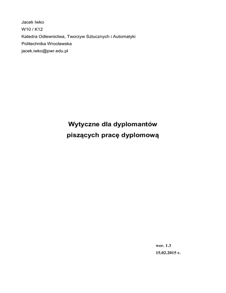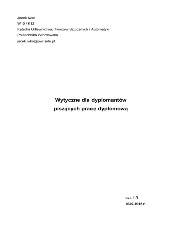 Jacek Iwko W10 / K12 Katedra Odlewnictwa, Tworzyw Sztucznych i Automatyki Politechnika Wrocławska [email protected] Wytyczne dla dyplomantów piszących pracę dyplomową wer. 1.3 15.02.2015 r. 1. Zawartość pracy dyplomowej Praca dyplomowa inżynierska lub magisterska1 powinna składać się z dwóch części2: • doświadczalnej, tzn. praktycznie przeprowadzonych badań, wykonanego programu, systemu, itp. • analitycznej, tzn. pisemnej pracy zawierającej aspekty teoretyczne i analityczne. Praca dyplomowa jako dzieło jest pisemnym opracowaniem monograficznym zgodnym z ustalonym tematem. Część doświadczalna jest integralną częścią pracy. Pracę dyplomową musi cechować: jasne, precyzyjne, ścisłe i obiektywne przedstawienie przedmiotu pracy z wyraźnym zaznaczeniem wyników własnych autora na tle opublikowanych materiałów źródłowych, przejrzysty układ treści pracy, kompletność opracowania, poprawność i płynność języka oraz stylu wypowiedzi oraz odpowiedni poziom wydawniczy (zachowanie wymagań formalnych, estetyka wykonania). Nie jest to natomiast chronologiczny opis przebiegu badań ani włożonego wysiłku, nie jest to także podręcznik dydaktyczny ani własne przedstawienie szerokich podstaw wiedzy. 1.1. Ogólny układ pracy Praca dyplomowa składa się zazwyczaj z: 1. Pierwszej strony 2. Streszczenia 3. Wstępu 4. Wykazu celów i zadań pracy (w formie numerowanej lub tekstu) 5. Rozdziałów teoretycznych, zawierających omówienie 6. Rozdziałów doświadczalnych, zawierających własne rozwiązania (projekt, badania, itd.) – element własny pracy 7. Podsumowania (Wniosków) – element własny pracy 8. Spisu literatury 9. Spisu rysunków i tabel 10. Załączników (jeżeli występują / są wymagane) 1 praca magisterska, w odróżnieniu od pracy licencjackiej / inżynierskiej, powinna dodatkowo zawierać autorską propozycję rozwiązania podjętego problemu 2 R. Klaus: Wzorzec edycji pracy inżynierskiej, Wydział Informatyki i Zarządzania, PP, Poznań 2006, s.3 Streszczenie pisane jest na samym końcu, po napisaniu całej pracy. W streszczeniu należy przedstawić cel oraz zakres pracy dyplomowej, krótko scharakteryzować wykonane eksperymenty lub analizy oraz bardzo zwięźle przedstawić główne wnioski. Streszczenie nie powinno przekroczyć jednej strony, ale też nie powinno być zdawkowe (np. dwa zdania). Wstęp powinien mieć 2-3 strony i dawać czytającemu spójny obraz tego, dlaczego zdecydowaliśmy się podjąć taki, a nie inny temat pracy. Innymi słowy, powinien wskazywać na wagę problemów podjętych w naszej pracy. Główna część pracy3 - w zależności od rodzaju pracy, który wynika często z kierunku studiów lub z tematyki pracy, może ona być wyłącznie teoretyczna albo składać się z części teoretycznej i badawczej, kiedy autor opisuje wyniki własnych badań. Jeśli praca składa się wyłącznie z części teoretycznej, obejmuje zazwyczaj trzy do pięciu rozdziałów i stanowi omówienie materiałów już opublikowanych takich, jak pozycje książkowe, czasopisma, inne prace naukowe i opublikowane w Internecie prace. Głównym zadaniem autora jest dokonanie analizy porównawczej zgromadzonych materiałów, ich syntezy lub – jeśli tezy postawione w tych materiałach są ze sobą sprzeczne – przedstawienie własnych ocen i opowiedzenie się za którąś z wersji lub uzasadnienie, dlaczego żadna z nich nie znalazła uznania. W pracach badawczych, po części początkowej, która obejmuje zwykle jeden lub dwa rozdziały, w których omówione są teoretyczne podstawy podjętych badań, autor powinien zaprezentować sposób prowadzenia (metodykę) badań oraz w kolejnym rozdziale ich wyniki. Podsumowanie (wnioski) powinno mieć objętość 2-3 stron i zawierać musi: przedstawienie zrealizowanych zadań zwracając uwagę na ich ewentualną oryginalność i nowość, najistotniejsze wnioski z pracy oraz (jeśli potrzebne / planowane) nakreślenie kierunków dalszych prac nad zagadnieniami poruszanymi w pracy. 3 http://www.sferagrafiki.pl/porady.php?post=1 , 25.11.2012 r. 1.2. Konstrukcja4 Konstrukcja pracy powinna spełniać wymogi kompletności, a układ pracy musi być logiczny. Konstrukcja logicznie spoista to taka, w której kolejność i treść poszczególnych rozdziałów formułowane są nie według nagromadzonego materiału, ale według jednej myśli przewodniej - to jest wyznaczonego celu badawczego i w ramach określonego tematem zagadnienia. Tytuły i odpowiadająca im treść rozdziałów powinny z siebie wynikać, tworząc spoistą wewnętrznie i pozbawioną przypadkowości całość dającą możliwość przechodzenia do coraz bardziej pogłębionych i szczegółowych rozważań, a następnie do syntezy czy uogólnienia. Rozmiarów pracy dyplomowej nie normują żadne reguły poza wymogiem kompletnego opracowania tematu (około 50 – 120 stron maszynopisu). 1.3. Dokładność relacji Dokładność relacji odnosi się zarówno do przedstawiania faktów, jak i poglądów. W obszarze faktów (danych źródłowych, przebiegu i efektów doświadczeń i eksperymentów, wyników ankiet, bezpośredniej obserwacji itp.) ważna jest nie tylko ścisłość w ich relacjonowaniu, ale także określone podejście metodologiczne, uniemożliwiające uzyskanie wyników jednostronnych czy tendencyjnych. W obszarze poglądów chodzi o prezentację obiektywną, rzetelną, nie mającą charakteru celowo wybiórczej, wyrwanej z kontekstu. Prawidłowa relacja oznacza, że nie pomija się także tych okoliczności, które świadczą przeciwko szczególnemu czy ogólnemu wynikowi pracy. Opis materiałów powinien pozwalać na wyraźne rozróżnienie wyników badań własnych i cudzych, co musi znaleźć wyraz we właściwym redakcyjnym uformowaniu pracy. Dobór literatury powinien być ściśle związany z tematem i celem pracy. Należy starać się uwzględniać w pracy najnowsze pozycje literatury oraz aktualne akty 