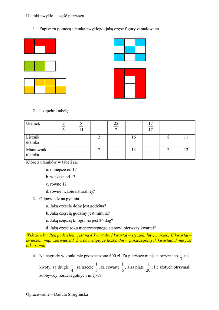 Ułamki zwykłe – część pierwsza. 1. Zapisz za pomocą ułamka zwykłego, jaką część figury zamalowano. 2. Uzupełnij tabelę. Ułamek 2 6 8 11 25 7 17 17 Licznik ułamka 2 16 8 11 Mianownik ułamka 7 13 2 12 Które z ułamków w tabeli są: a. mniejsze od 1? b. większe od 1? c. równe 1? d. równe liczbie naturalnej? 3. Odpowiedz na pytania. a. Jaką częścią doby jest godzina? b. Jaką częścią godziny jest minuta? c. Jaką częścią kilograma jest 26 dag? d. Jaką część roku nieprzestępnego stanowi pierwszy kwartał? Wskazówka: Rok podzielony jest na 4 kwartały. I kwartał – styczeń, luty, marzec; II kwartał – kwiecień, maj, czerwiec itd. Zwróć uwagę, że liczba dni w poszczególnych kwartałach nie jest taka sama. 4. Na nagrody w konkursie przeznaczono 600 zł. Za pierwsze miejsce przyznano 1 tej 3 1 1 1 1 , za trzecie , za czwarte , a za piąte . Ile złotych otrzymali 4 5 6 20 zdobywcy poszczególnych miejsc? kwoty, za drugie Opracowanie – Danuta Struglińska Ułamki zwykłe – część pierwsza. 5. Przedstaw na osi liczbowej ułamki: 1 1 2 1 3 1 5 1 11 , , , , , , , , . 2 3 3 4 4 6 6 12 12 Wskazówka: Przyjmij, że odległość między 0 i 1 na osi liczbowej jest równa 6cm (12 kratek) 6. Zapisz wynik działania w postaci ułamka lub liczby mieszanej. a. 2:7 d. 4:3 b. 6:8 e. 10:4 c. 5:13 f. 20:9 Przykład: 9 : 11 9 11 7. Trzy jednakowe pizze podzielono między 8 osób. Jaka część pizzy przypadła każdej osobie? 8. Wyłącz całości z ułamków. a) 5 2 Przykład: b) 45 9 c) 27 8 d) 180 30 e) 32 5 f )2 6 15 7 1 2 , ponieważ 7:3=2 reszty1 3 3 9. Zamień liczby mieszane na ułamki niewłaściwe. 1 a )5 3 1 b) 2 4 2 c )1 3 2 d )3 7 e)15 1 10 5 g )11 6 3 23 Przykład: 5 , ponieważ 4 5 3 23 4 4 10. Wypisz wszystkie ułamki właściwe o mianowniku 13 większe od ułamka 11. Podaj przykłady ułamków o liczniku 4 mniejszych od ułamka 5 . 13 4 . 5 12. Skróć ułamki: 8 3 14 18 3 12 63 15 26 32 75 , , , , , , , , , , . 16 9 21 27 33 18 72 45 39 40 125 Aby skrócić ułamek, należy jego licznik i mianownik podzielić przez ich wspólny dzielnik. Przykład: 6 6:3 2 15 15 : 3 5 13. Podane ułamki: 1 2 1 5 1 4 3 1 7 5 , , , , , , , , , rozszerz do mianownika 36. 3 3 6 6 9 9 4 12 12 18 Aby rozszerzyć ułamek, należy jego licznik i mianownik pomnożyć przez tę sama liczbę różną od zera Przykład: 5 5 4 20 9 9 4 36 Opracowanie – Danuta Struglińska Ułamki zwykłe – część pierwsza. 14. Sprowadź ułamki do wspólnego mianownika. 1 2 1 2 5 4 a) i b) i c) i 3 5 3 9 7 5 Przykład: d) 3 7 i 12 24 5 8 e) i 6 9 f) 7 8 i 11 55 1 3 g) i 2 4 5 11 7 5 h) i i) i 7 14 18 8 2 3 i 15 10 Wspólną wielokrotnością liczb 15 i 10 jest na przykład 30. Rozszerzamy nasze ułamki do mianownika 30. 2 4 15 30 3 9 10 30 15. Uporządkuj liczby: 1 7 3 1 7 3 , , ,1 , , od najmniejszej do największej. 4 10 5 5 20 4 Opracowanie – Danuta Struglińska