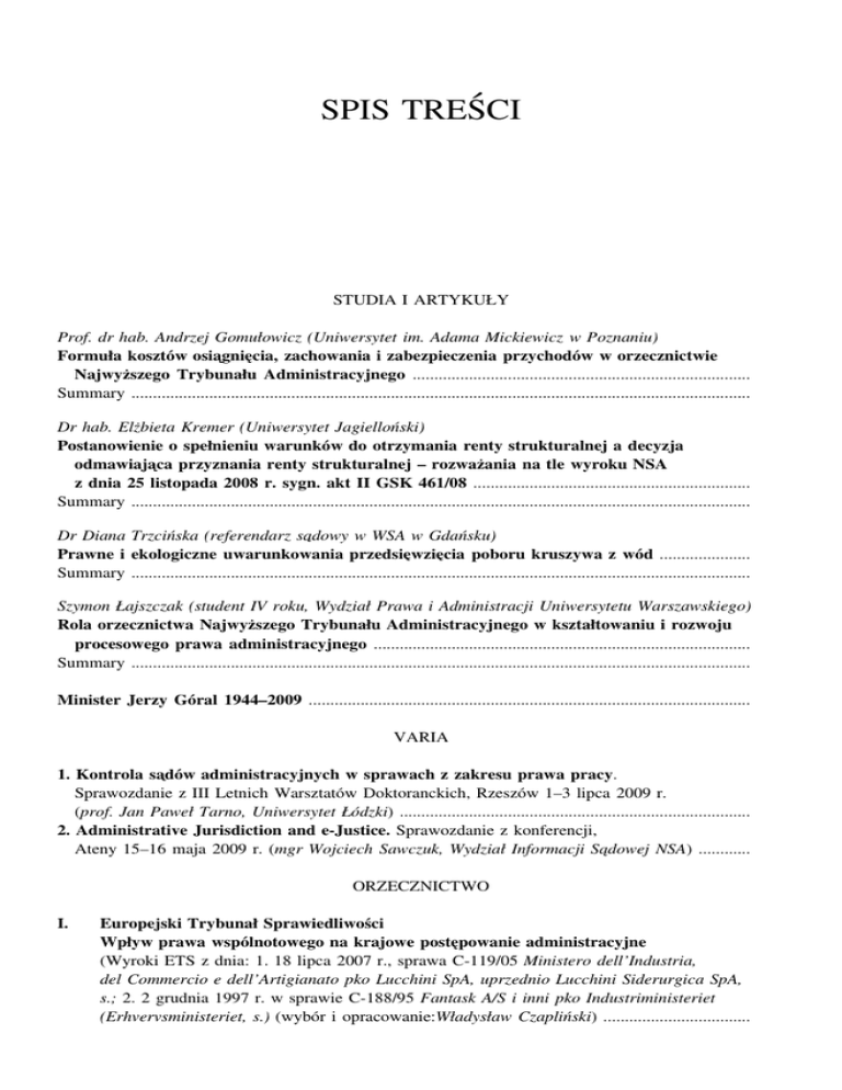 SPIS TREŚCI STUDIA I ARTYKUŁY Prof. dr hab. Andrzej Gomułowicz (Uniwersytet im. Adama Mickiewicz w Poznaniu) Formuła kosztów osia˛gnie˛cia, zachowania i zabezpieczenia przychodów w orzecznictwie Najwyższego Trybunału Administracyjnego .............................................................................. Summary ............................................................................................................................................... Dr hab. Elżbieta Kremer (Uniwersytet Jagielloński) Postanowienie o spełnieniu warunków do otrzymania renty strukturalnej a decyzja odmawiaja˛ca przyznania renty strukturalnej – rozważania na tle wyroku NSA z dnia 25 listopada 2008 r. sygn. akt II GSK 461/08 ................................................................ Summary ............................................................................................................................................... Dr Diana Trzcińska (referendarz sa˛dowy w WSA w Gdańsku) Prawne i ekologiczne uwarunkowania przedsie˛wzie˛cia poboru kruszywa z wód ..................... Summary ............................................................................................................................................... Szymon Łajszczak (student IV roku, Wydział Prawa i Administracji Uniwersytetu Warszawskiego) Rola orzecznictwa Najwyższego Trybunału Administracyjnego w kształtowaniu i rozwoju procesowego prawa administracyjnego ....................................................................................... Summary ............................................................................................................................................... Minister Jerzy Góral 1944–2009 ...................................................................................................... VARIA 1. Kontrola sa˛dów administracyjnych w sprawach z zakresu prawa pracy. Sprawozdanie z III Letnich Warsztatów Doktoranckich, Rzeszów 1–3 lipca 2009 r. (prof. Jan Paweł Tarno, Uniwersytet Łódzki) ................................................................................. 2. Administrative Jurisdiction and e-Justice. Sprawozdanie z konferencji, Ateny 15–16 maja 2009 r. (mgr Wojciech Sawczuk, Wydział Informacji Sa˛dowej NSA) ............ ORZECZNICTWO I. Europejski Trybunał Sprawiedliwości Wpływ prawa wspólnotowego na krajowe poste˛powanie administracyjne (Wyroki ETS z dnia: 1. 18 lipca 2007 r., sprawa C-119/05 Ministero dell’Industria, del Commercio e dell’Artigianato pko Lucchini SpA, uprzednio Lucchini Siderurgica SpA, s.; 2. 2 grudnia 1997 r. w sprawie C-188/95 Fantask A/S i inni pko Industriministeriet (Erhvervsministeriet, s.) (wybór i opracowanie:Władysław Czapliński) .................................. 4 Zeszyty Naukowe Sa˛downictwa Administracyjnego 5(26)/2009 II. Europejski Trybunał Praw Człowieka Przewlekłość poste˛powania (wyrok ETPC z dnia 21 lipca 2009 r. w sprawie Leon i Agnieszka Kania przeciwko Polsce, skarga nr 12605/03)(opracowała Agnieszka Wilk) ...... III. Trybunał Konstytucyjny (wybór i opracowanie: Irena Chojnacka) 1. Zasada niedziałania prawa wstecz (wyrok TK z dnia 12 maja 2009 r. sygn. akt P 66/07) 2. Ustalenie dochodu uprawniaja˛cego do świadczenia rodzinnego (wyrok TK z dnia 30 czerwca 2009 r. sygn. akt P 45/08) ................................................................................ 3. Zwolnienie podatnika z obowia˛zku ewidencjonowania sprzedaży przy zastosowaniu kas rejestruja˛cych (wyrok TK z dnia 16 lipca 2009 r. sygn. akt K 36/08) ........................ IV. Sa˛d Najwyższy (wybór: Andrzej Wróbel, opracowanie: Dawid Mia˛sik) Wyrok Sa˛du Najwyższego z dnia 23 marca 2009 r. (sygn. akt I PK 205/08) [dot. przeje˛cia zakładu pracy na podstawie kodeksu pracy] .................................................... V. Naczelny Sa˛d Administracyjny i wojewódzkie sa˛dy administracyjne A. Orzecznictwo Naczelnego Sa˛du Administracyjnego (wybór: Stefan Babiarz, opracowanie: Marcin Wia˛cek) 1. Uchwała składu siedmiu se˛dziów NSA z dnia 27 lipca 2009, sygn. akt I OPS 4/09 [dot. terminu do ustalenia opłaty adiacenckiej] .............................................................. 2. Uchwała składu siedmiu se˛dziów NSA z dnia 10 sierpnia 2009, sygn. akt II FPS 3/09 [dot. przesłanek wyła˛czaja˛cych odpowiedzialność członka zarza˛du za zaległości podatkowe spółki] ............................................................................................................ 3. Uchwała składu siedmiu se˛dziów NSA z dnia 10 sierpnia 2009, sygn. akt II FPS 4/09 [dot. braku zwolnienia od podatku dochodu fundacji przeznaczonego i wydatkowanego na zakup udziałów w spółce z ograniczona˛ odpowiedzialnościa˛] ................................. B. Orzecznictwo wojewódzkich sa˛dów administracyjnych (wybór: Bogusław Gruszczyński, opracowanie: Marcin Wia˛cek) 1. Wyrok WSA w Warszawie z dnia 30 kwietnia 2008 r., sygn. akt VI SA/Wa 89/08 [dot. wymogu „nieoczywistości” rozwia˛zania w poste˛powaniu o udzielenie patentu] .... 2. Wyrok WSA w Szczecinie z dnia 8 maja 2008 r., syg. Akt II SA/Sz 174/08 [dot. opłaty planistycznej dla nieruchomości stanowia˛cej współwłasność] .................. 3. Wyrok WSA w Białymstoku z dnia 15 października 2008 r., sygn. akt I SA/Bk 254/08 [dot. rozumienia poje˛cia „budowa” w przepisach o podatku od nieruchomości] ......... 4. Wyrok WSA w Białymstoku z dnia 12 lutego 2009 r., sygn. akt II SA/Bk 839/08 [dot. braku podstaw do udoste˛pnienia informacji obejmuja˛cej motywy zachowania sie˛ se˛dziego podczas rozprawy] ............................................................................................ 5. Wyrok WSA w Białymstoku z dnia 5 marca 2009 r., sygn. akt II SA/Bk 19/09 [dot. kary pienie˛żnej za naruszenie przepisów ustawy o transporcie drogowym] ........ VI. Wnioski Prezesa NSA i pytani