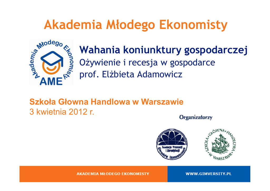 Akademia Młodego Ekonomisty Wahania koniunktury gospodarczej OŜywienie i recesja w gospodarce prof. ElŜbieta Adamowicz Szkoła Głowna Handlowa w Warszawie 3 kwietnia 2012 r. Program wykładu: • Co to jest koniunktura gospodarcza? • W jaki sposób ją mierzyć? • Dlaczego w gospodarce nie występują same wzrosty? • Wahania aktywności gospodarczej w Polsce i strefie euro. • W jaki sposób państwo moŜe wpływać na koniunkturę gospodarczą? • Czy kryzys gospodarczy moŜe być szansą? Koniunktura gospodarcza • w astrologii-korzystne lub niekorzystne wzajemne połoŜenie planet, któremu przypisywano wpływ na losy jednostek i całych narodów. • Do ekonomii trafiło poprzez politykę, w której przez stulecia uŜywano określeń sprzyjające lub niesprzyjające koniunktury polityczne. • Przedmiotem badania koniunktury gospodarczej jest szeroko rozumiana dynamika aktywności gospodarczej. Jej istotnym elementem są wzajemne relacje między zmianami, zachodzącymi we wszystkich sektorach gospodarki Mierzenie zmian aktywności gospodarczej Do badania zmian aktywności gospodarczej wykorzystuje się zmienne makroekonomiczne: • ilościowe: •PKB, konsumpcja, inwestycje, produkcja przemysłowa, sprzedaŜ detaliczna • jakościowe: • wskaźniki nastrojów gospodarczych, barometry koniunktury, wskaźniki koniunktury Cykl klasyczny „rodzaj fluktuacji obserwowanych w ogólnej działalności gospodarczej narodów, które organizują swoją działalność głównie w przedsiębiorstwach, nastawionych na zysk: cykle składają się z ekspansji, występującej w tym samym czasie w róŜnych obszarach aktywności gospodarczej, po której następują podobnie powszechne recesje, spowolnienia i oŜywienia które prowadzą do ekspansji w następnym cyklu; ta sekwencja zmian powtarza się, ale nie periodycznie; Burns, A,F., Mitchell, W. C., ,Measuring Business Cycles, New York, NBER, 1946, s.3 Cykle wzrostowe • Cykl stóp wzrostu: • badanie dynamiki zmian stóp wzrostu poszczególnych zmiennych, opisujących aktywność gospodarczą. • Cykl odchyleń • badanie fluktuacji zagregowanej aktywności gospodarczej wokół długookresowego trendu. RóŜnica sprowadza się do definiowania średniej stopy wzrostu, która w cyklu stóp wzrostu staje się punktem odniesienia dla rozróŜnienia okresów wysokiej i niskiej stopy wzrostu, zaś w cyklu odchyleń pełni rolę długookresowej tendencji wzrostowej w stosunku do której określane są odchylenia Definicja cyklu koniunkturalnego • Cykl koniunkturalny to wzrosty i spadki poziomu aktywności gospodarczej w stosunku do długookresowego trendu wzrostowego w gospodarce • Ekspansja to wzrost produktu w gospodarce trwający 6 miesięcy lub dłuŜej • Recesja to spadek produktu w gospodarce trwający 6 miesięcy lub dłuŜej • Kryzys to drastyczny spadek całkowitego produktu w gospodarce, któremu towarzyszy bezrobocie, trwający kilka lat Fazy cyklu koniunkturalnego WyróŜniamy następujące fazy cyklu: cykl klasyczny • przyspieszenie (oŜywienie) • ekspansja • spowolnienie • recesja(depresja) Inna klasyfikacja faz cyklu: cykle wzrostowe • spowolnienie (spadek aktywności gospodarczej) • przyspieszenie (wzrost aktywności gospodarczej) Punkty zwrotne: • górny (szczyt), dolny (dno) KaŜda z faz cyklu jest procesem. Który odpowiednio trwa w czasie Dwa teoretyczne podejścia do badania cykli koniunkturalnych • Cykle mają charakter deterministyczny – Przewidywalne ( w duŜej mierze) i samo napędzające się wahania • Cykle mają charakter stochastyczny (podejście współczesne) – System gospodarczy odbiera impulsy z zewnątrz które prowadzą do wahań Fazy cyklu koniukturalnego ekspansja spowolnienie Punkt zwrotny - szczyt przyspieszenie recesja Punkt zwrotny - dno Czas Wahania PKB w Polsce i EA – cykl poziomów 2,000,000 280,000 1,900,000 1,800,000 240,000 1,700,000 200,000 1,600,000 1,500,000 160,000 1,400,000 120,000 1996 1 99 8 2000 2002 P L_ P K B _TC 2004 2006 E A _P K B _TC 2008 2010 Wahania PKB w Polsce i EA – cykl odchyleń .03 .02 .01 .00 -.01 -.02 -.03 95 96 97 98 99 00 01 EA_GDP_CHF 02 03 04 PL_GDP_CHF 05 06 07 08 Wahania PKB w EA .03 .02 .025 .02 5 .020 .02 0 .015 .01 5 .010 .01 0 .01 .005 .00 5 .000 .00 .00 0 - .005 -.00 5 -.01 - .010 - .015 -.01 0 -.02 - .020 -.01 5 95 96 97 98 99 00 01 02 EA_GDP_CHF 03 04 05 06 07 08 95 96 97 98 99 DE_GDP_CHF 00 01 02 EA_GDP_CHF .02 5 03 04 05 06 07 08 95 96 97 98 99 FR_GDP_CHF 00 01 02 EA_GDP_CHF .06 03 04 05 06 07 08 05 06 07 08 05 06 07 08 IT_GDP_CHF .03 .02 0 .02 .04 .01 5 .01 .01 0 .02 .00 5 .00 .00 .00 0 -.01 -.00 5 - .02 -.02 -.01 0 -.01 5 - .04 95 96 97 98 99 00 01 02 EA_GDP_CHF 03 04 05 06 07 08 -.03 95 96 97 98 99 ES_GDP_CHF 00 01 02 EA_GDP_CHF .03 .03 .02 .02 .01 .01 .00 .00 -.01 - .01 03 04 05 06 07 08 95 96 97 98 99 IE_GDP_CHF 00 01 02 EA_GDP_CHF 03 04 PT_GDP_CHF .03 .02 .01 .00 -.01 -.02 - .02 -.02 95 96 97 98 99 00 01 EA_GDP_CHF 02 03 04 CZ_GDP_CHF 05 06 07 08 -.03 95 96 97 98 99 00 01 EA_GDP_CHF 02 03 04 HU_GDP_CHF 05 06 07 08 95 96 97 98 99 00 01 EA_GDP_CHF 02 03 04 SK_GDP_CHF Nastroje gospodarcze w Polsce i EA – zmiany poziomów 120 110 100 90 80 70 1996 1998 2000 2002 P L _ E S I_ C 2004 2006 E A _ E S I_ C 2008 2010 Wahania barometrów koniunktury (ESI) w Polsce i EA 15 2007M09 2007M07 2000M07 10 2010M11 1998M05 5 2000M04 0 2010M08 2004M08 2004M08 1999M03 1999M05 2005M06 -5 2002M01 2003M02 -10 1996M06 -15 -20 2009M04 2009M03 -25 96 98 00 02 E S I_ P L _ S A _ CHFC 04 06 08 10 E S I_ E A 1 7 _ S A _ CHFC Zmiany produkcji przemysłowej Wahania poziomu produkcji – cykl odchyleń .12 2008M02 2007M11 .08 1997M12 2000M03 2000M10 .04 2004M04 1998M02 .00 1999M04 1999M01 1996M09 -.04 2003M08 2005M04 2002M10 -.08 2009M05 -.12 2009M07 -.16 96 98 00 02 I P _ P L _ S A _ CHFC 04 06 08 I P _ E A 1 7 _ S A _ CHFC 10 Wahania wskaźnika koniunktury w przemyśle 20 2000M07 10 2007M10 2007M08 1997M09 1998M02 2011M01 2004M03 2000M03 201