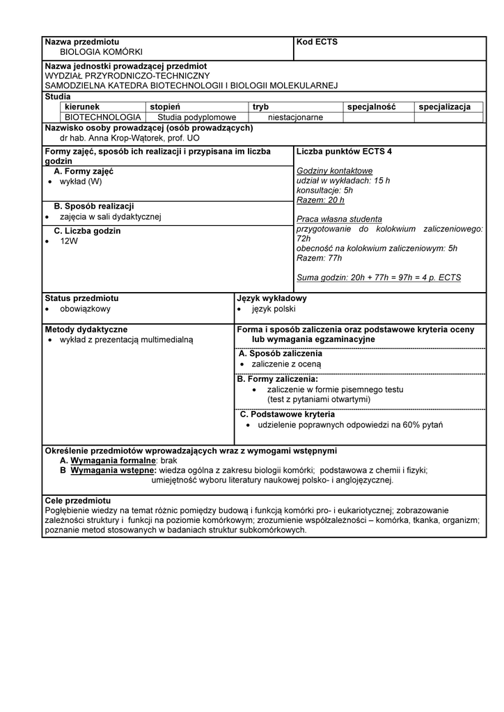 Nazwa przedmiotu BIOLOGIA KOMÓRKI Kod ECTS Nazwa jednostki prowadzącej przedmiot WYDZIAŁ PRZYRODNICZO-TECHNICZNY SAMODZIELNA KATEDRA BIOTECHNOLOGII I BIOLOGII MOLEKULARNEJ Studia kierunek stopień tryb BIOTECHNOLOGIA Studia podyplomowe niestacjonarne Nazwisko osoby prowadzącej (osób prowadzących) dr hab. Anna Krop-Wątorek, prof. UO Formy zajęć, sposób ich realizacji i przypisana im liczba godzin A. Formy zajęć • wykład (W) • B. Sposób realizacji zajęcia w sali dydaktycznej • C. Liczba godzin 12W specjalność specjalizacja Liczba punktów ECTS 4 Godziny kontaktowe udział w wykładach: 15 h konsultacje: 5h Razem: 20 h Praca własna studenta przygotowanie do kolokwium zaliczeniowego: 72h obecność na kolokwium zaliczeniowym: 5h Razem: 77h Suma godzin: 20h + 77h = 97h = 4 p. ECTS Status przedmiotu • obowiązkowy Język wykładowy • język polski Metody dydaktyczne • wykład z prezentacją multimedialną Forma i sposób zaliczenia oraz podstawowe kryteria oceny lub wymagania egzaminacyjne A. Sposób zaliczenia • zaliczenie z oceną B. Formy zaliczenia: • zaliczenie w formie pisemnego testu (test z pytaniami otwartymi) C. Podstawowe kryteria • udzielenie poprawnych odpowiedzi na 60% pytań Określenie przedmiotów wprowadzających wraz z wymogami wstępnymi A. Wymagania formalne: brak B Wymagania wstępne: wiedza ogólna z zakresu biologii komórki; podstawowa z chemii i fizyki; umiejętność wyboru literatury naukowej polsko- i anglojęzycznej. Cele przedmiotu Pogłębienie wiedzy na temat różnic pomiędzy budową i funkcją komórki pro- i eukariotycznej; zobrazowanie zależności struktury i funkcji na poziomie komórkowym; zrozumienie współzależności – komórka, tkanka, organizm; poznanie metod stosowanych w badaniach struktur subkomórkowych. Treści programowe Problematyka wykładu: Formy życia na tle okresów geologicznych Ziemi; ewolucyjne drzewo życia, ogniwa pośrednie i teoria endosymbiozy; komórkowa teoria budowy organizmów, dowód zaprzeczający spontaniczności powstawania życia; poznawanie komórki zależne od rozwóju mikroskopii; udział pierwiastków naturalnych w materii ożywionej; woda i jej znaczenie dla biomolekuł, aktywny przepływ wody przez błony biologiczne (akwaporyna); wiązania chemiczne i konsekwencje ich obecności w cząsteczkach biologicznych; budowa i właściwości aminokwasów, lipidów i cukrów – monomerów białek, glikoprotein, proteoglikanów, lipoprotein i fosfolipidów; organizacja błon komórkowych; typy organizacji komórkowej (Prokariota, Eukariota), organella komórek eukariotycznych; zobrazowanie topografii procesów metabolicznych w komórce. Efekty kształcenia Wykaz literatury A. Literatura wymagana do ostatecznego zaliczenia zajęć (zdania egzaminu): A.1. wykorzystywana podczas zajęć • bieżący kurs wykładów A.2. studiowana samodzielnie przez studenta • Cykl wykładów „Biologia Komórki” opracowany przez wykładowcę • Arnold JRP., Fisher J., Krótkie wykłady, Chemia dla biologów, PWN, Warszawa 2008 • Solomon EP., Berg LR.., Martin DW., Villee CA., Biologia, Wydawnictwo MULTICO, Warszawa 2010 • Berg J.M, Tymoczko J.L., Stryer L. Biochemia, PWN, Warszawa 2009 • Alberts Bruce i wsp. Podstawy Biologii Komórki, Wyd. II., Wydawnictwo Naukowe PWN SA, Warszawa 2007 B. Literatura uzupełniająca • Kłyszejko-Stefanowicz L. „Cytobiochemia: biochemia niektórych struktur komórkowych”, Wyd. III., PWN SA, Warszawa 2002 • Stokłosowa St. „Hodowla komórek i tkanek”, Wydawnictwo Naukowe PWN SA, Warszawa 2004 • Malepszy S. (red.), „Biotechnologia roślin” Wydawnictwo Naukowe PWN SA, Wyd.II. zmienione, Warszawa 2009 • Artykuły tematyczne z czasopism naukowych, opublikowane w ciągu ostatnich 5 lat Wiedza W1 ma pogłębioną wiedzę w zakresie ważnych procesów fizjologii i biochemii komórki pro- i eukariotycznej W2 zna podstawową terminologię naukową w języku polskim i angielskim z zakresu biologii komórki Umiejętności U1 potrafi analizować zjawiska biologiczne na bazie posiadanej wiedzy przyrodniczej, oraz posługiwać się współczesnymi metodami informatycznymi do ich oceny U2 posiada umiejętność zdobywania informacji, zarówno ze źródeł pierwotnych, jak i wtórnych (w języku polskim i angielskim), wykazuje umiejętność krytycznej analizy i selekcji informacji U3 potrafi określić kierunki dalszego uczenia się i zrealizować proces samokształcenia Kompetencje społeczne (umiejętności) K1 rozumie potrzeby ciągłego dokształcania w zakresie biologii i nauk przyrodniczych K2 rozumie potrzebę przekazywania społeczeństwu informacji o nowych osiągnięciach biologii komórki i ich znaczeniu Kontakt dr hab. Anna Krop-Watorek, e-mail: [email protected] Przedmiot: BIOLOGIA KOMÓRKI Efekty kształcenia Wiedza: W1 ma pogłębioną wiedzę w zakresie ważnych procesów fizjologii i biochemii komórki pro- i eukariotycznej W2 zna podstawową terminologię naukową w języku polskim i angielskim z zakresu biologii komórki Umiejętności: Odniesienie do efektów kierunkowych Odniesienie do efektów obszarowych K_W08 K_W02 P2A_W03* P2A_W03** P2A_W01* P2A_W02 P2A_W03** P2A_W01* P2A_W02 K_W02 U1 potrafi analizować zjawiska biologiczne na bazie posiadanej wiedzy przyrodniczej, oraz posługiwać się współczesnymi metodami informatycznymi do ich oceny K_U01 U2 posiada umiejętność zdobywania informacji, zarówno ze K_U07 źródeł pierwotnych, jak i wtórnych (w języku polskim i angielskim), wykazuje umiejętność krytycznej analizy i selekcji informacji U3 potrafi określić kierunki dalszego uczenia się i zrealizować K_U10 proces samokształcenia Kompetencje społeczne: K1 rozumie potrzeby ciągłego dokształcania w zakresie biologii K_K02 i nauk przyrodniczych K2 rozumie potrzebę przekazywania społeczeństwu informacji o nowych osiągnięciach biologii komórki i ich znaczeniu K_K08 P2A_U01* P2A_U03 P2A_U05 P2A_U07 P2A_U02* P2A